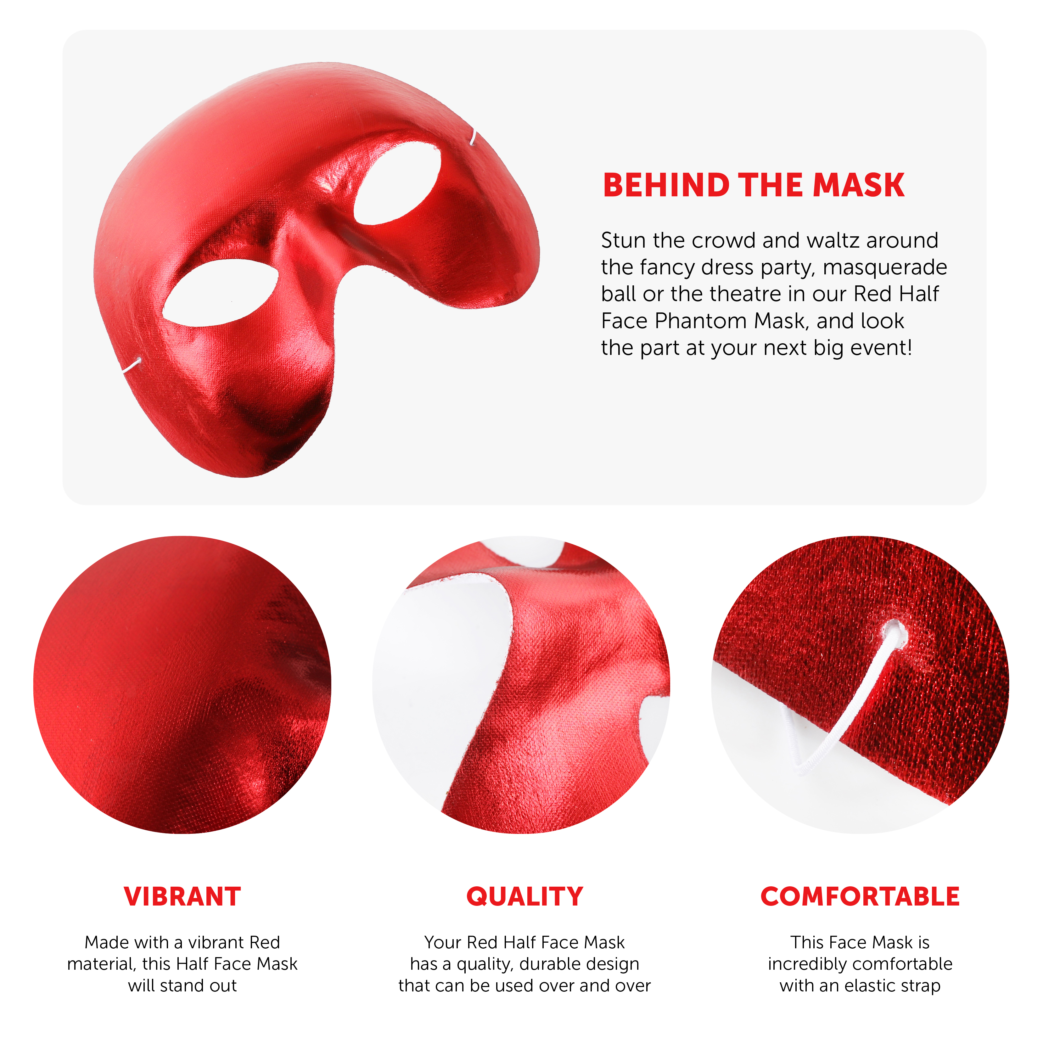 RED HALF FACE MASK: Stun the crowd and waltz around the fancy dress party, masquerade ball or the theatre in our Red Half Face Phantom Mask, and look the part at your next big event!
