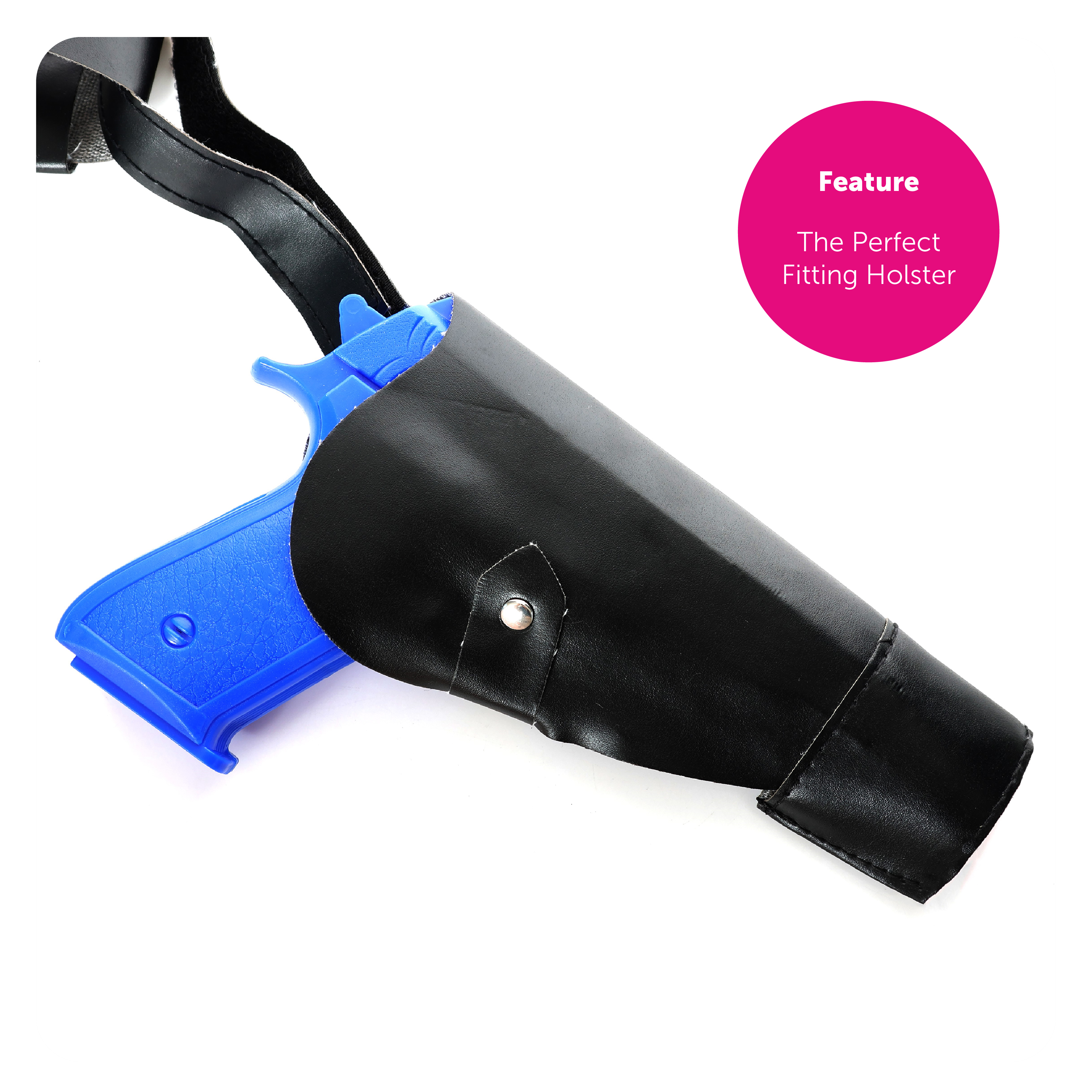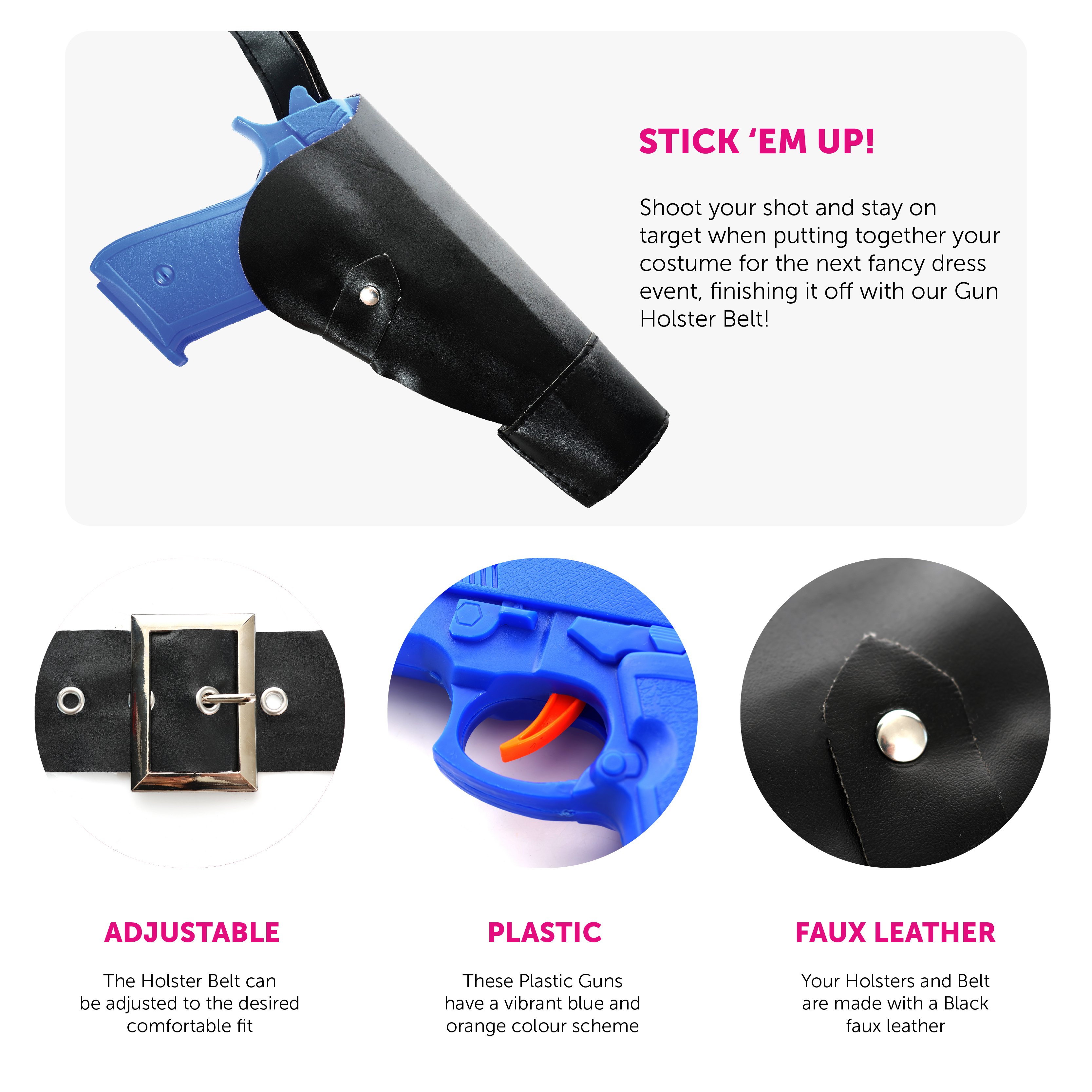 HOLSTER BELT DETAILS: This Gun Holster Belt includes a black, faux leather Belt that can be adjusted to the right size, attachable matching Holsters that are designed to be hung on the Belt and 2x Plastic Blue Guns!