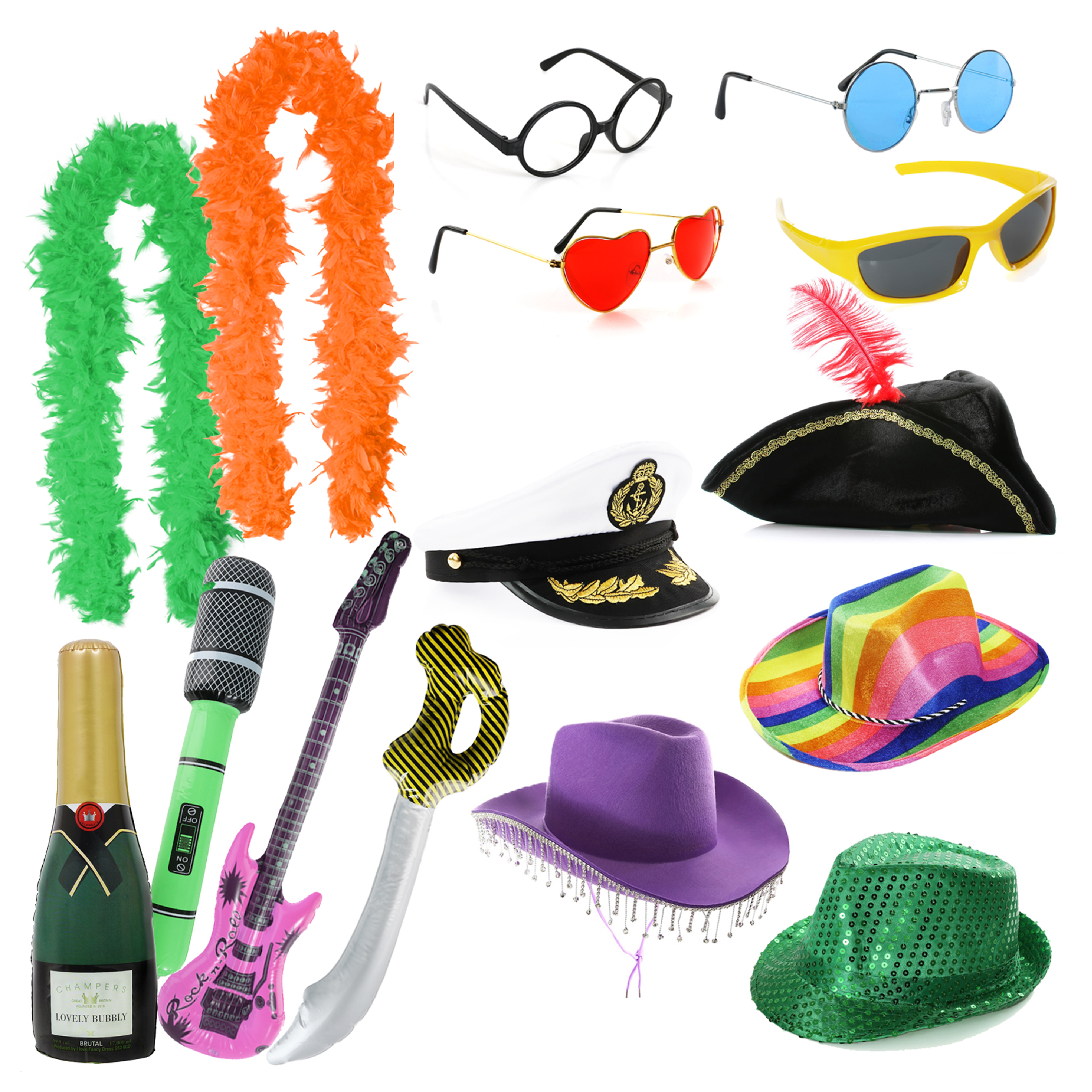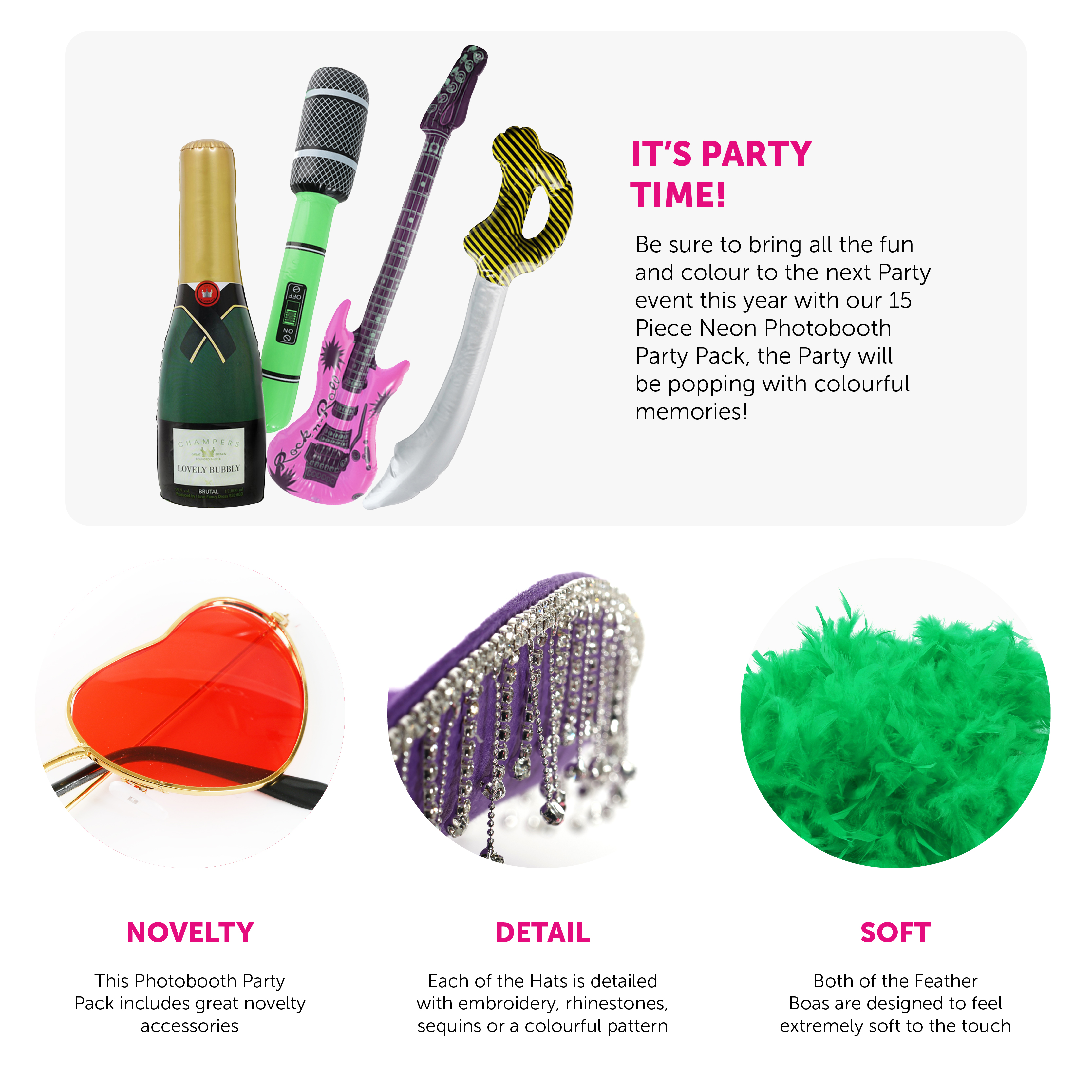 SET INCLUDES: Your 15 Piece Neon Photobooth Party Pack includes 1x Green Feather Boa, 1x Orange Feather Boa, 1x Inflatable Champagne Bottle, 1x Green Inflatable Microphone, 1x Pink Inflatable Guitar, 1x Inflatable Pirate Sword, 1x Black Tricorn Hat with an attached Red Feather, 1x White Sailor's Cap with Gold detail, 1x Rainbow Cowboy Hat, 1x Purple Cowboy Hat with Rhinestone Fringe, 1x Green Sequin Trilby Hat, 1x Round Black Framed Glasses, 1x Round Glasses with Blue Lenses, 1x Heart Shaped Glasses with Red Lenses, and 1x Yellow Sunglasses, the perfect Party Pack for any event!