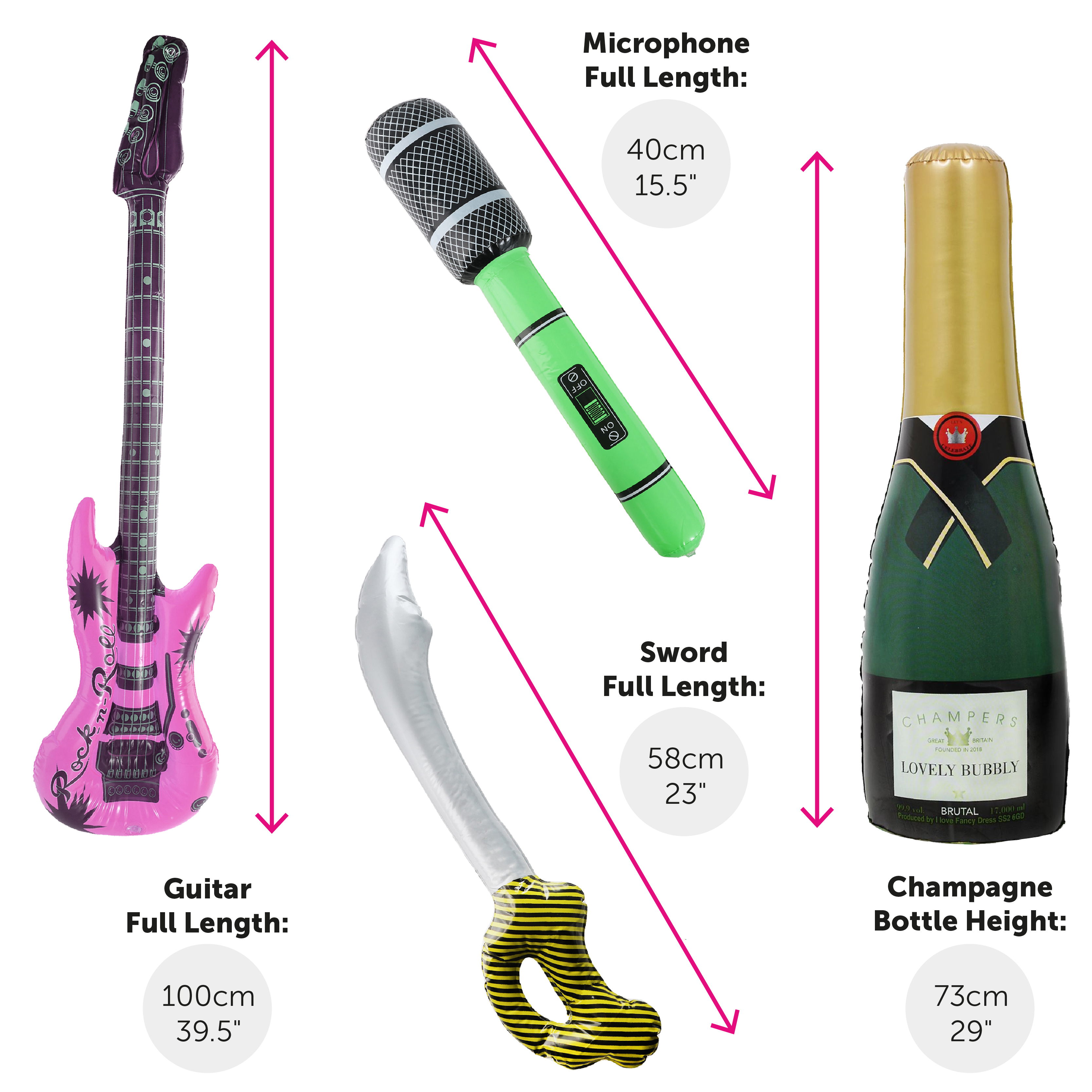 GREAT SIZED INFLATABLES: The Inflatables included in this Party Pack are all a great size; the Champagne Bottle measures a height of 73cm (29"), the Green Microphone measures a full length of 40cm (15.5"), the Pink Guitar measures a full length of 100cm (39.5"), and the Pirate Sword measures a full length of 58cm (23")