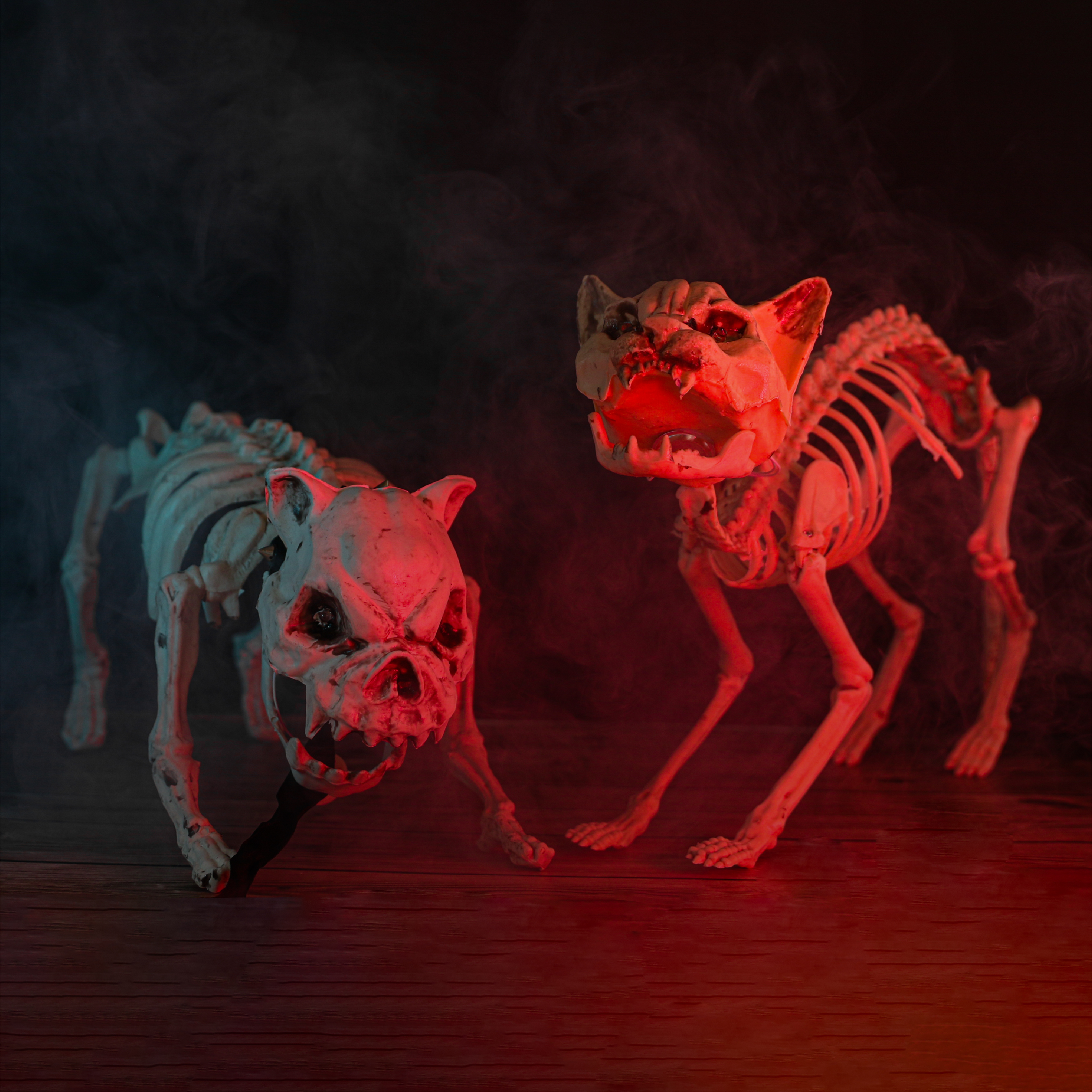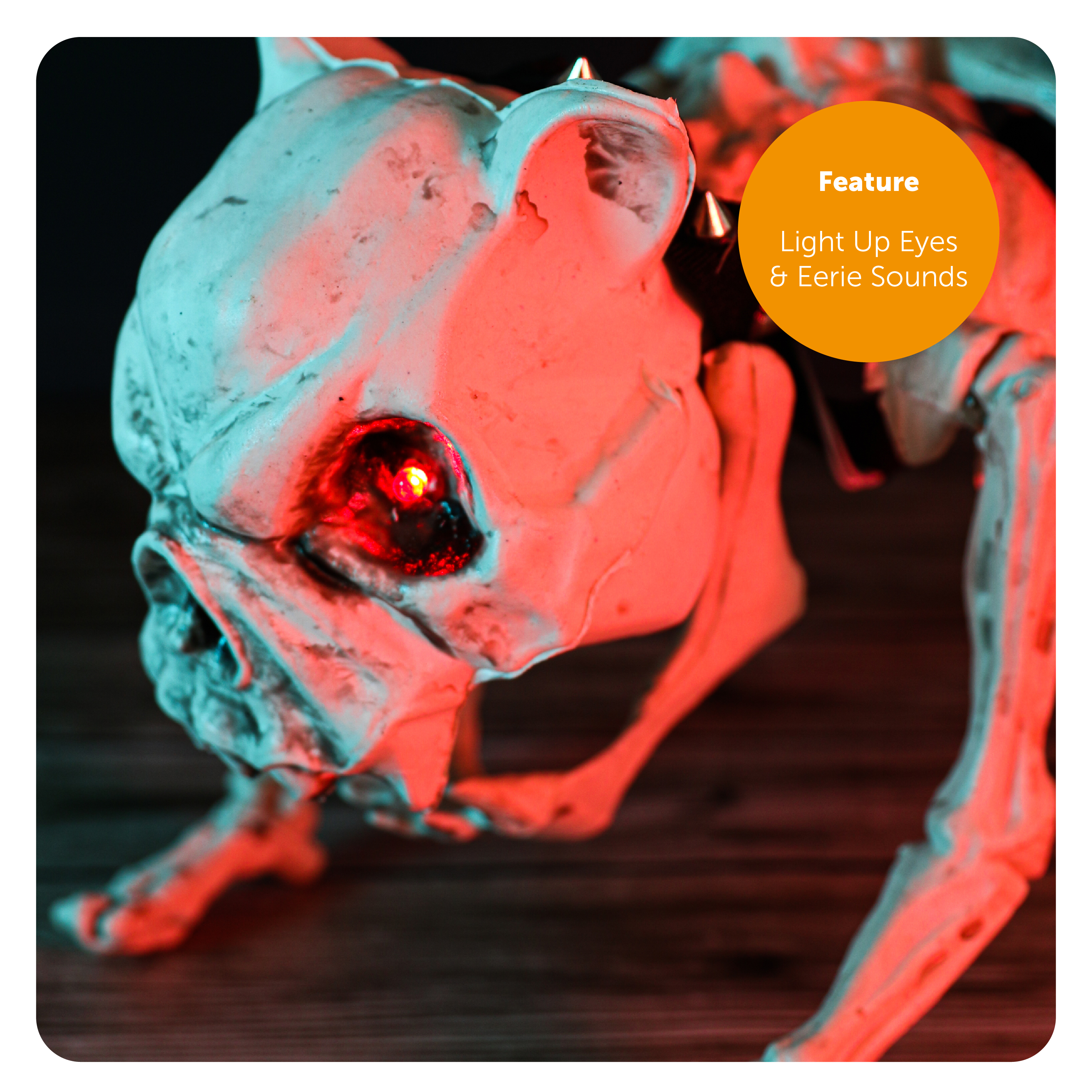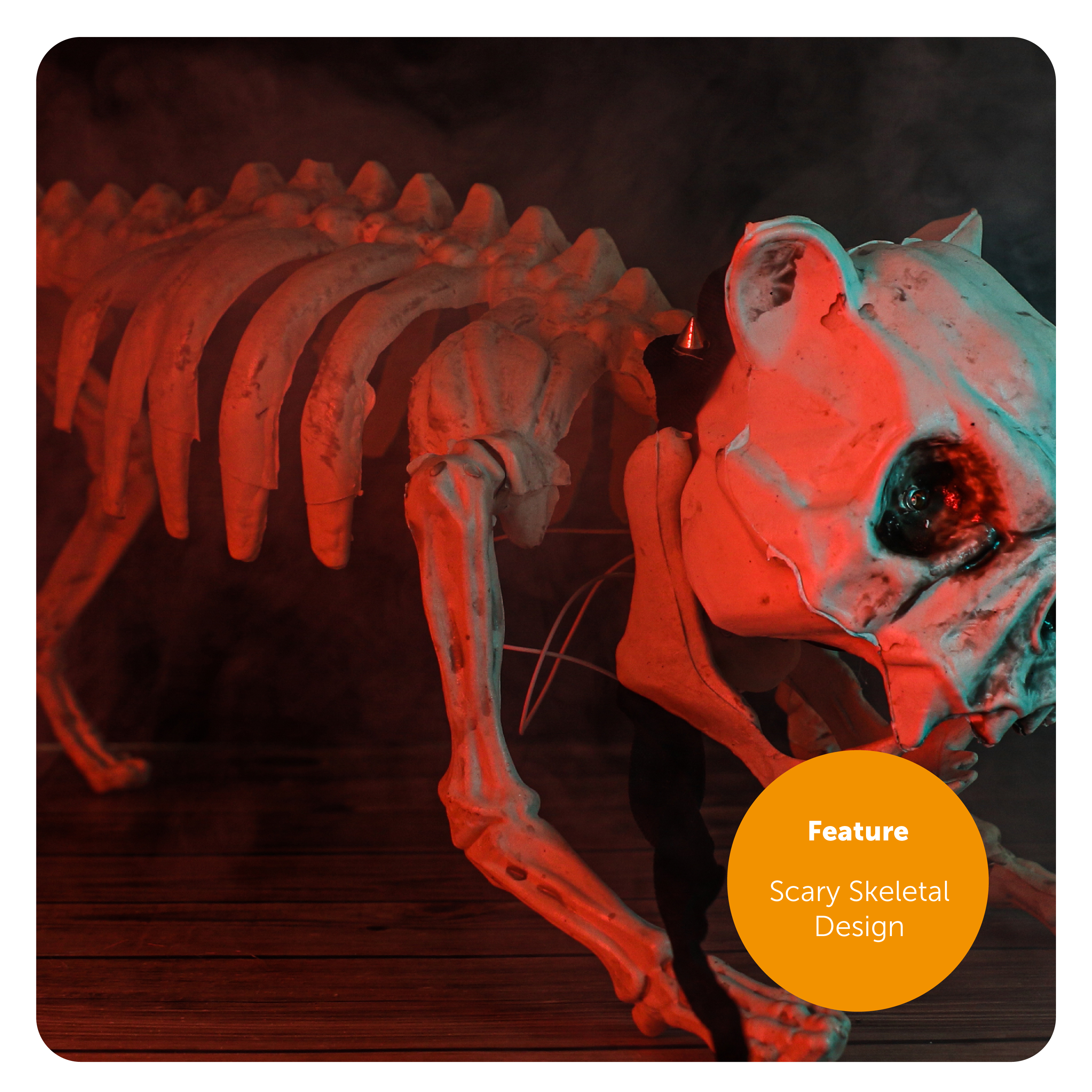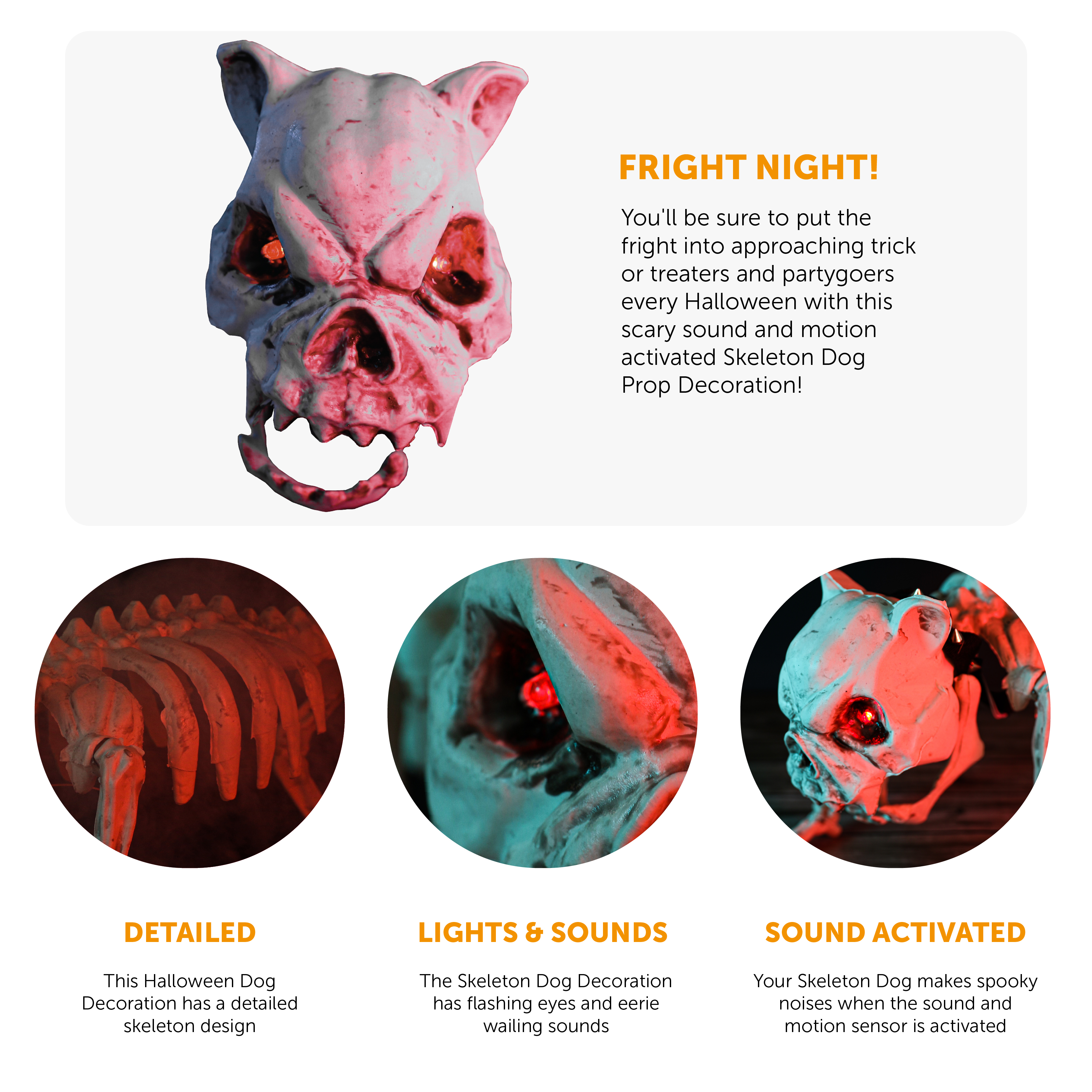 DECORATION DETAILS: A sound and motion activated Skeleton Dog Decoration with flashing Red Eyes, and eerie barking sounds to unease your visitors - the Skeleton Dog requires 3AA batteries!