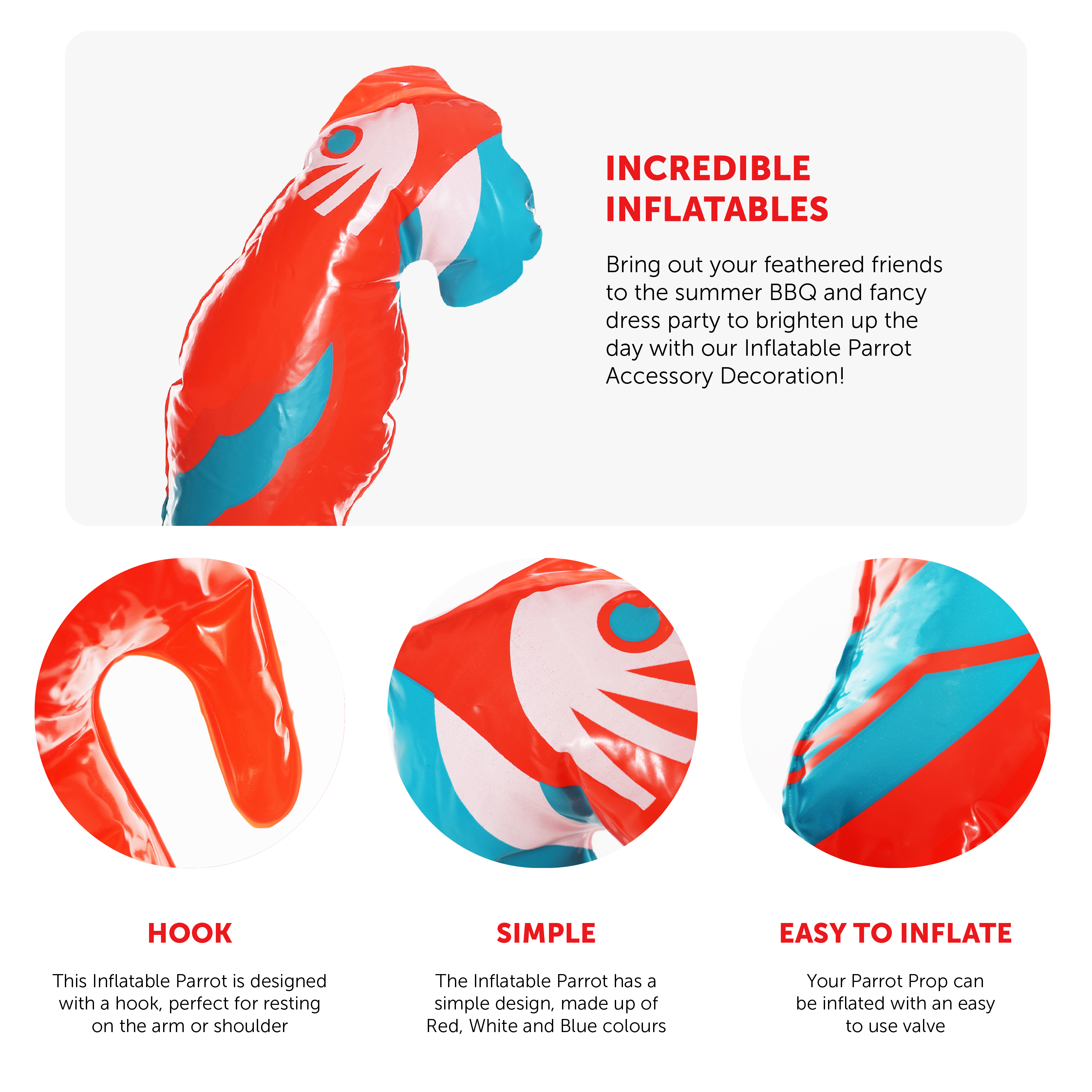 INFLATABLE PARROT DETAILS: This red, white and blue Parrot is made from PVC, which is smooth to touch and easy to inflate or deflate and can be inflated by pump or manually!