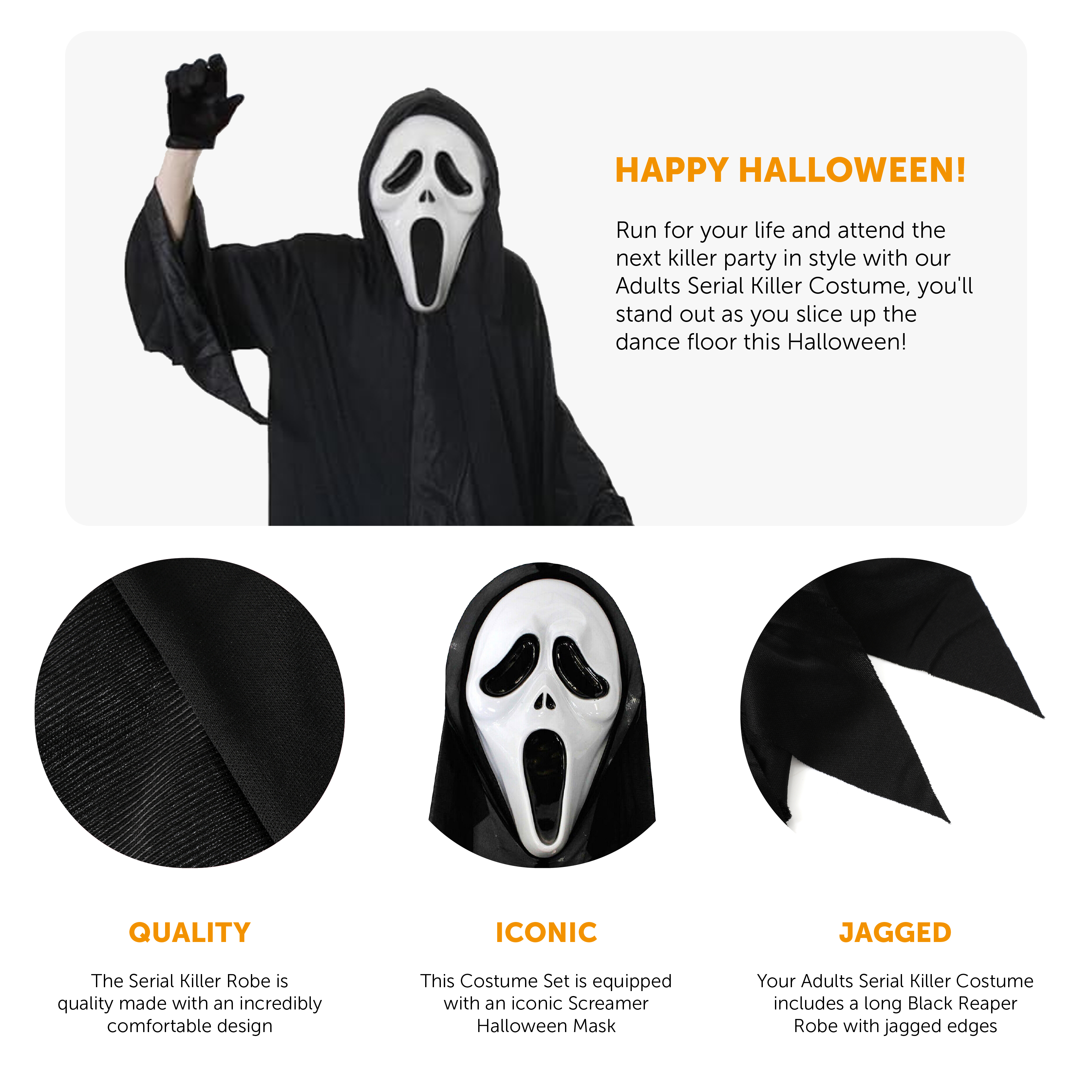 COSTUME INCLUDES: Your Adults Serial Killer Costume includes a Black Ragged Reaper Robe, a Hooded Ghost Face Screamer Mask, and a Pair of Black Gloves, the perfect look this Halloween!