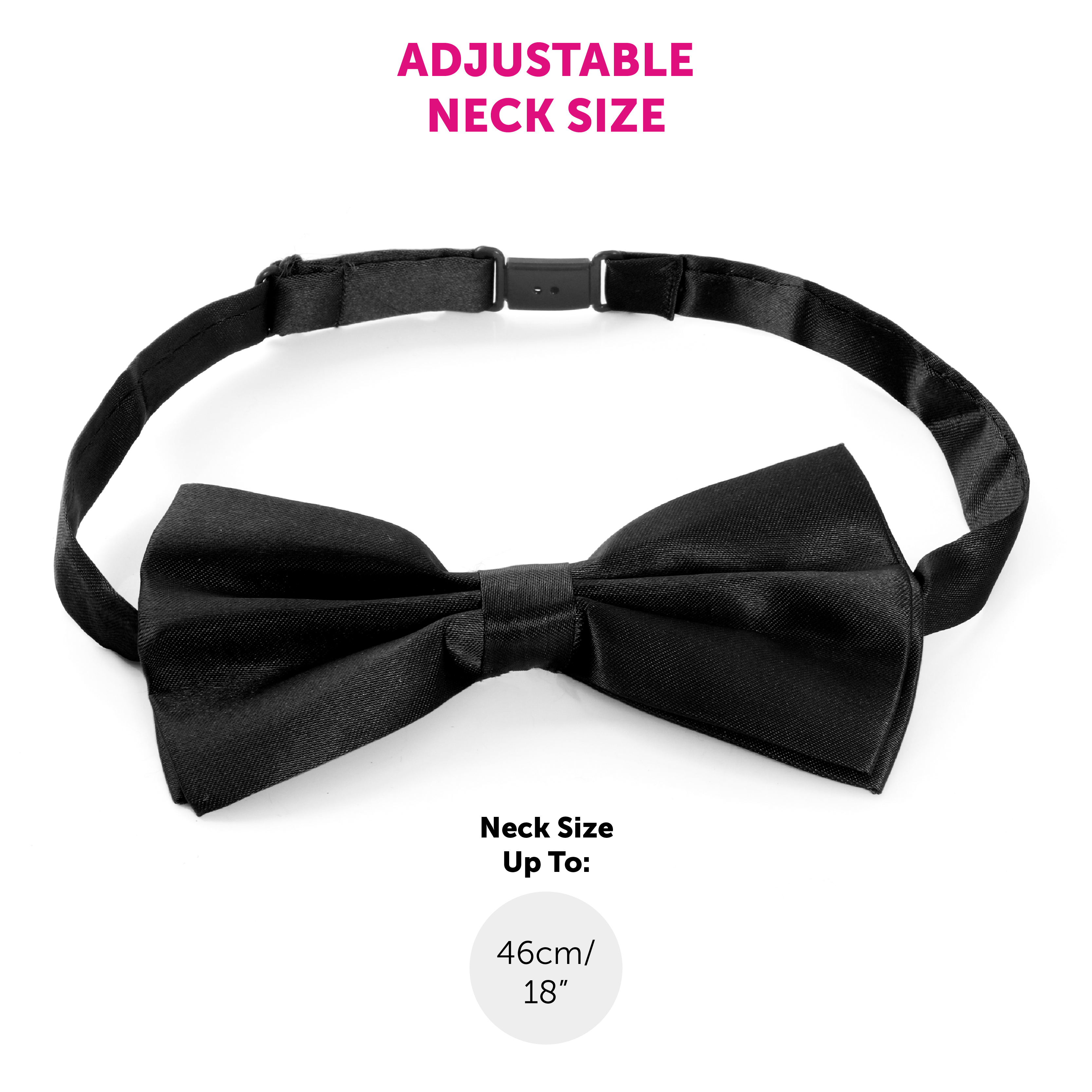 ONE SIZE FITS ALL: Your Black Satin Bow Tie measures up to 46cm (18") and fits any Adult perfectly and can be adjusted to the desired length and size to fit your style comfortably and well!
