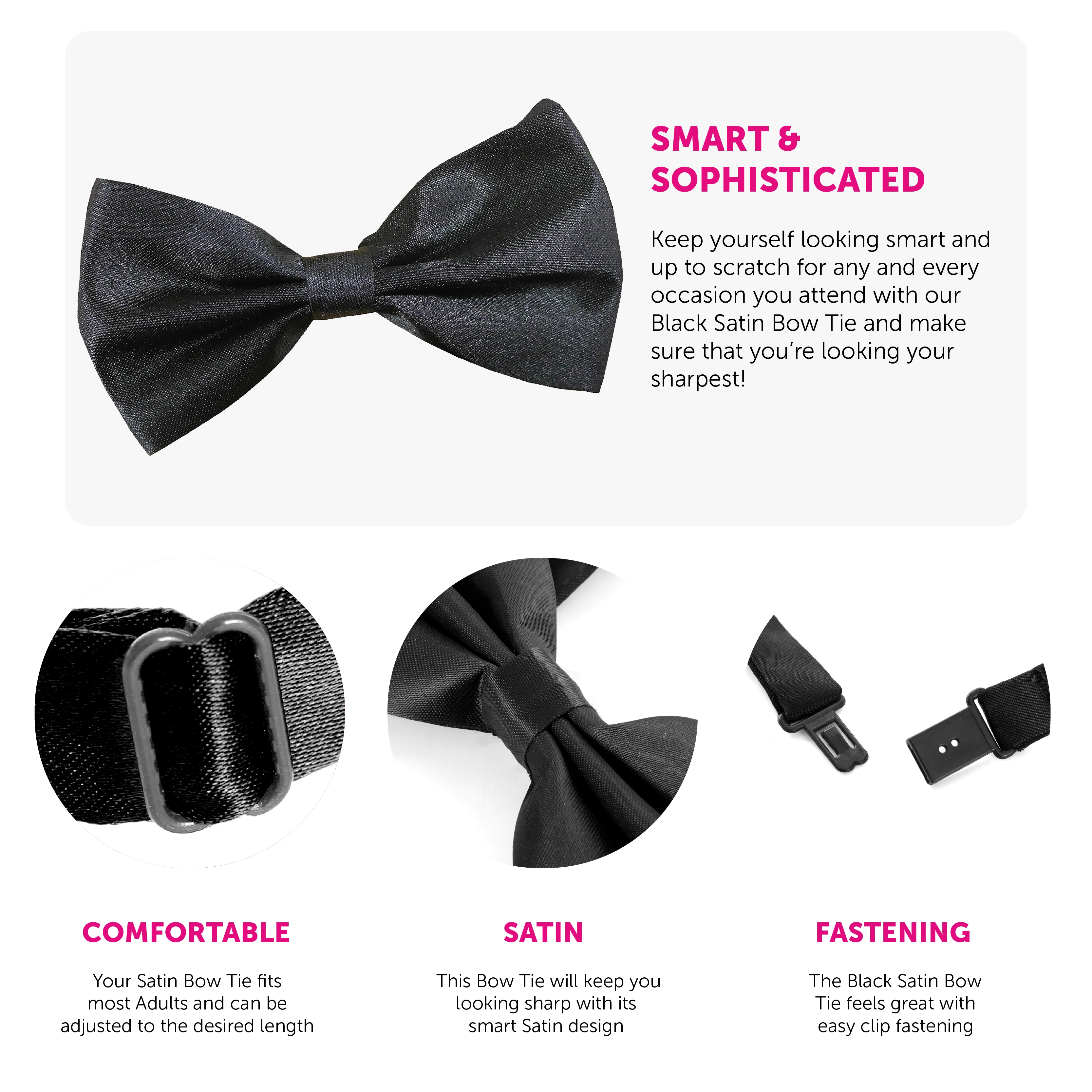 PERFECT FOR SMART OCCASIONS OR FANCY DRESS ACCESSORIES: Whether you’re looking for a clean, sharp, and smart Bow Tie to polish your attire up, or a finishing touch accessory for your Fancy Dress, this Black Satin Bow Tie is what you need!