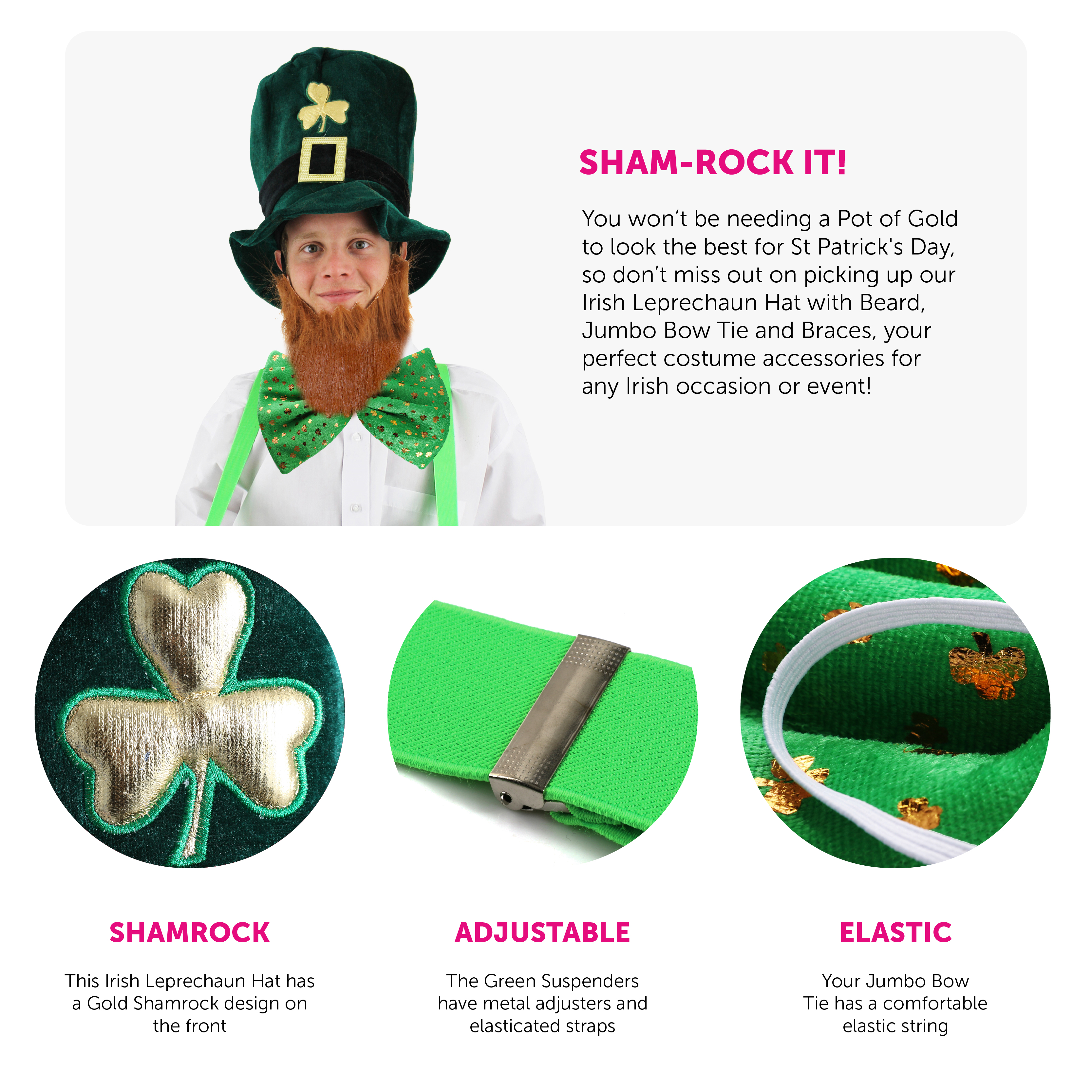 IRISH SET INCLUDES: This Irish Set includes a large Dark Green Velour Irish Leprechaun Hat with a Gold Shamrock design on the front and a Red Beard attached, an oversized Green Bow Tie with a Golden Shamrock pattern and a comfortable elastic strap, and elasticated Green Suspenders with metal adjusters and fasteners, a the perfect Irish Set for any event!