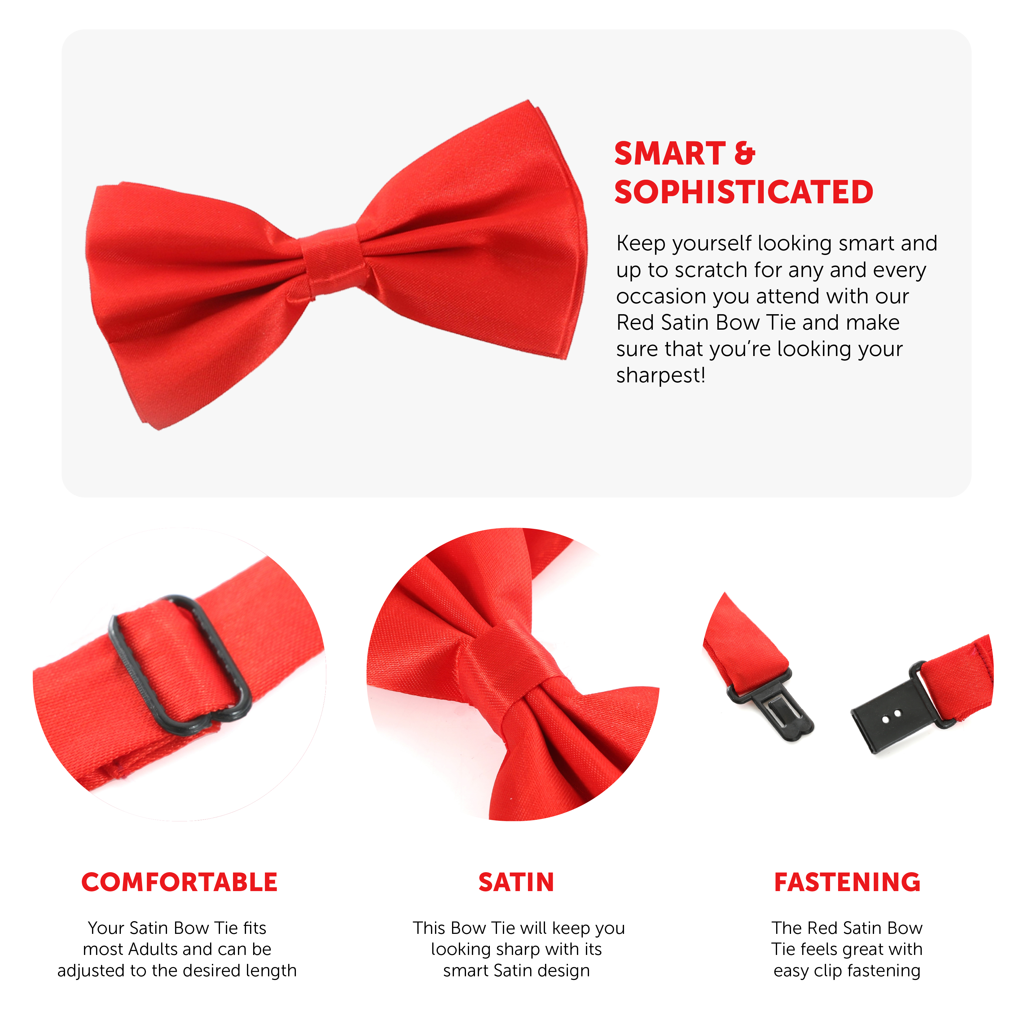 PERFECT FOR SMART OCCASIONS OR FANCY DRESS ACCESSORIES: Whether you’re looking for a clean, sharp, and smart Bow Tie to polish your attire up, or a finishing touch accessory for your Fancy Dress, this Red Satin Bow Tie is what you need!