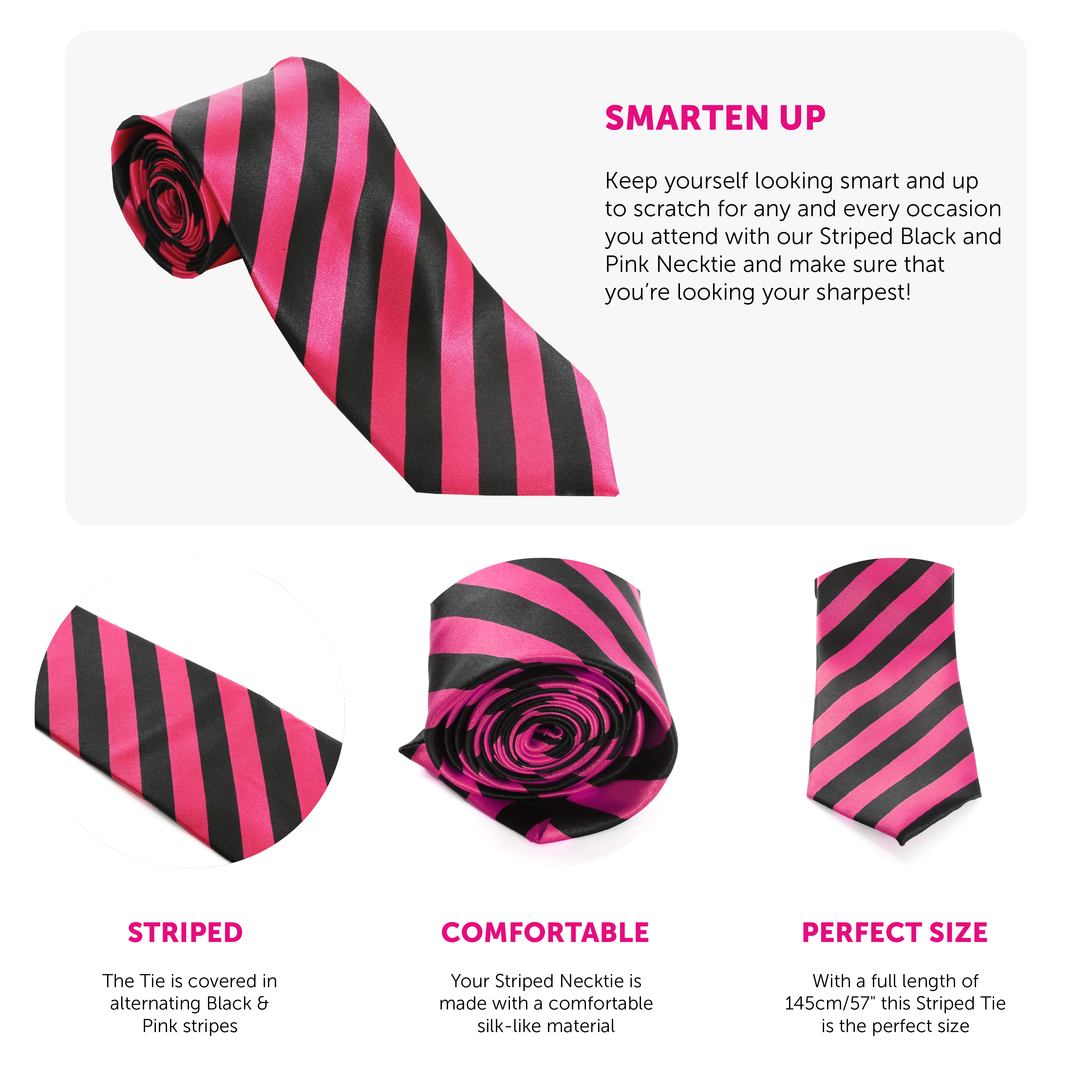 STRIPED BLACK AND PINK NECKTIE: Keep yourself looking smart and up to scratch for any and every occasion you attend with our Striped Black and Pink Necktie and make sure that you’re looking your sharpest!
