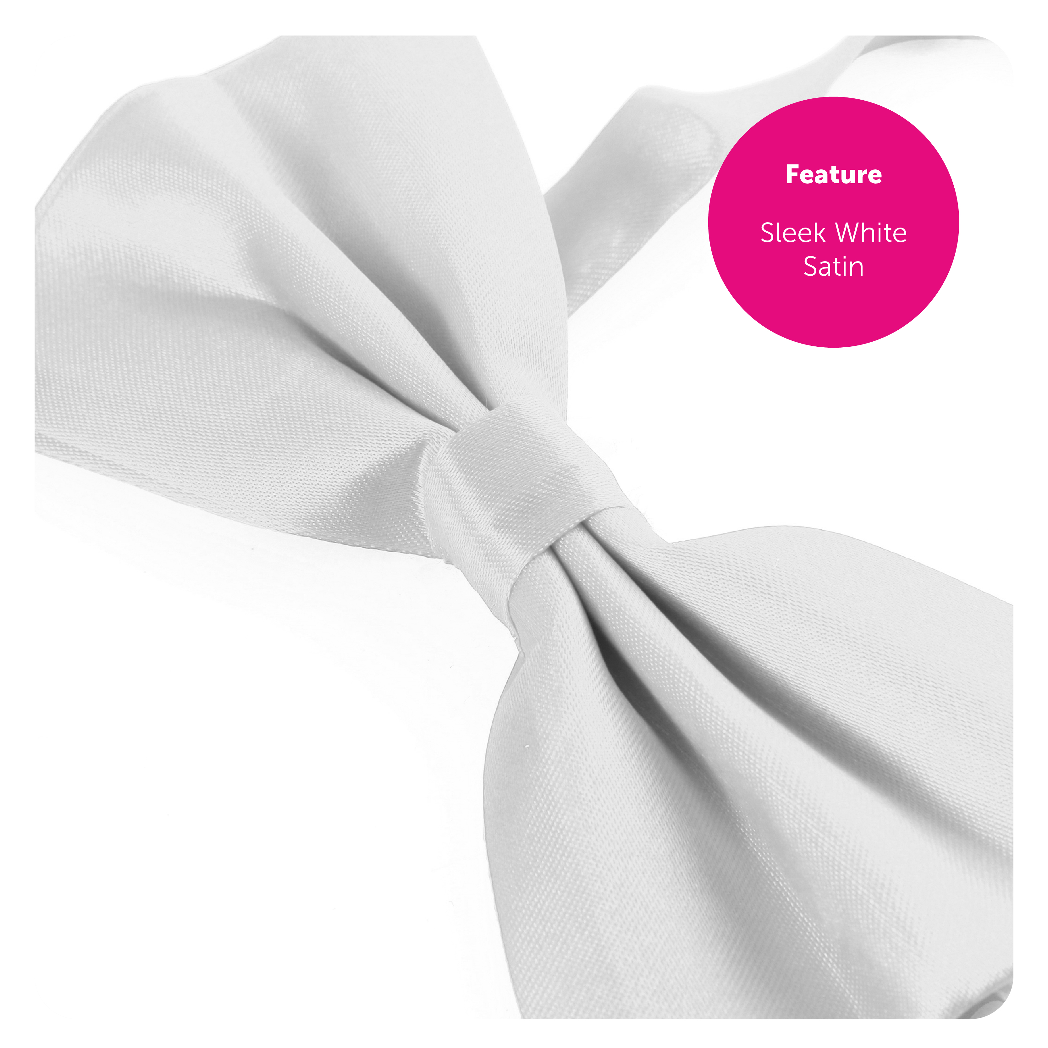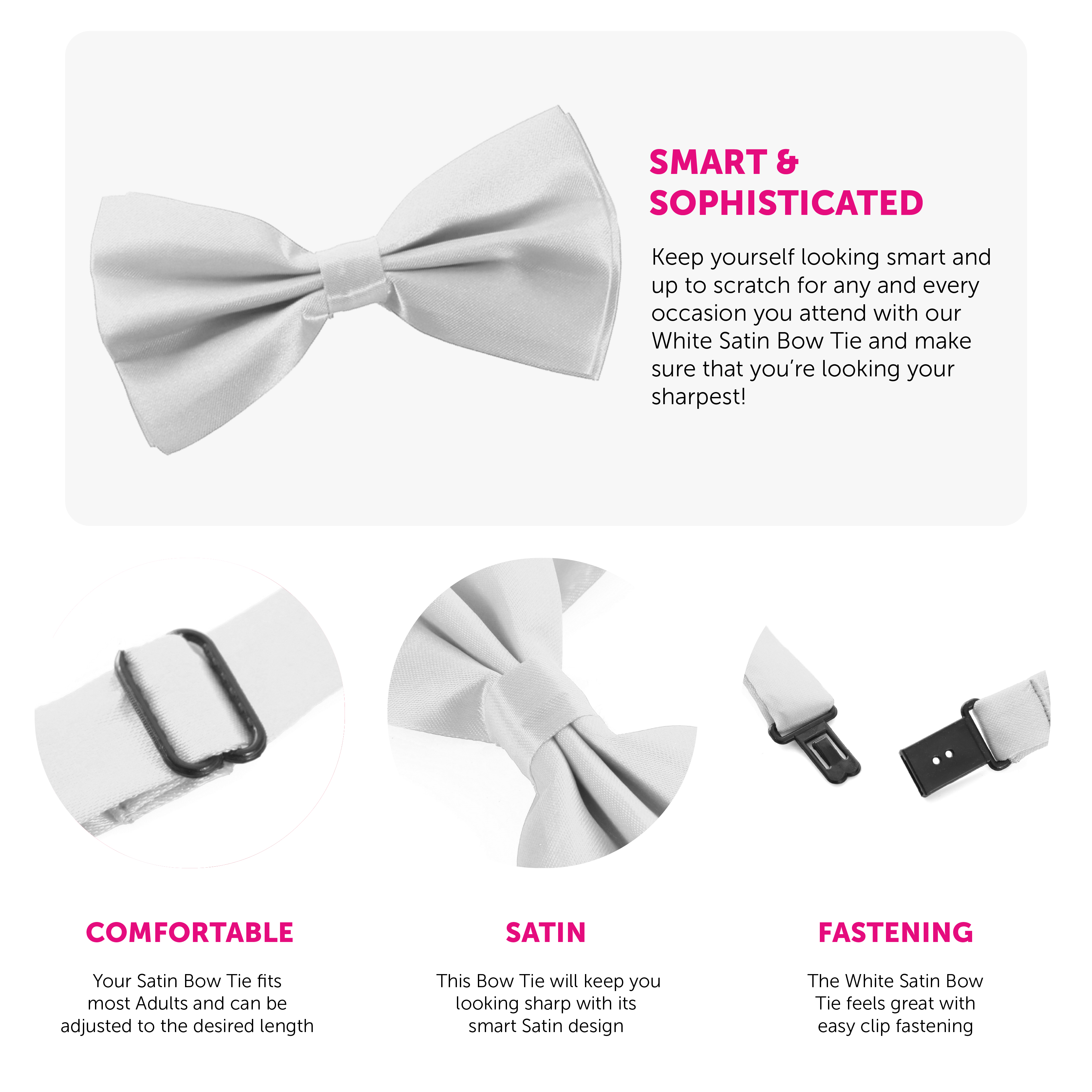 WHITE SATIN BOW TIE: Keep yourself looking smart and up to scratch for any and every occasion you attend with our White Satin Bow Tie and make sure that you’re looking your sharpest!