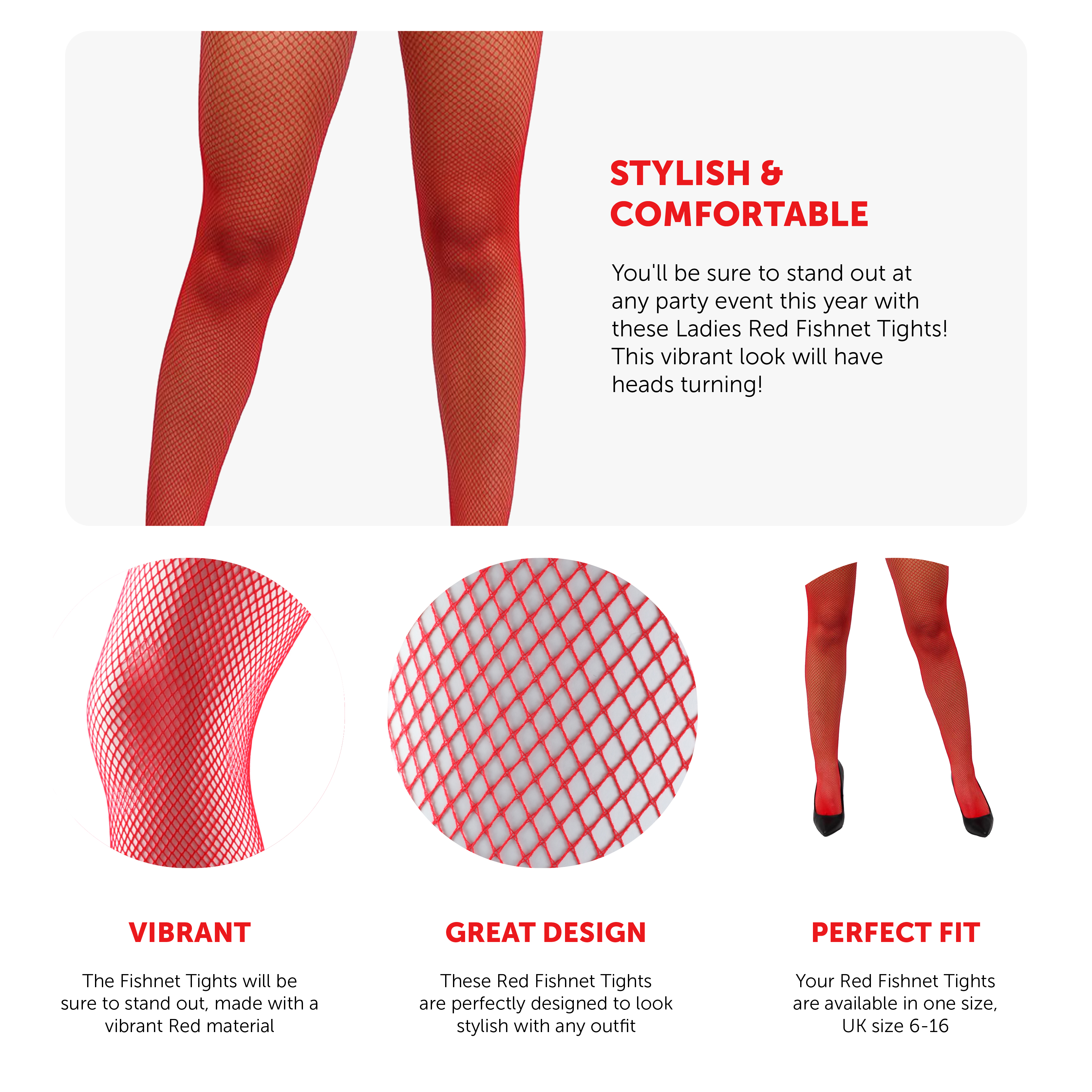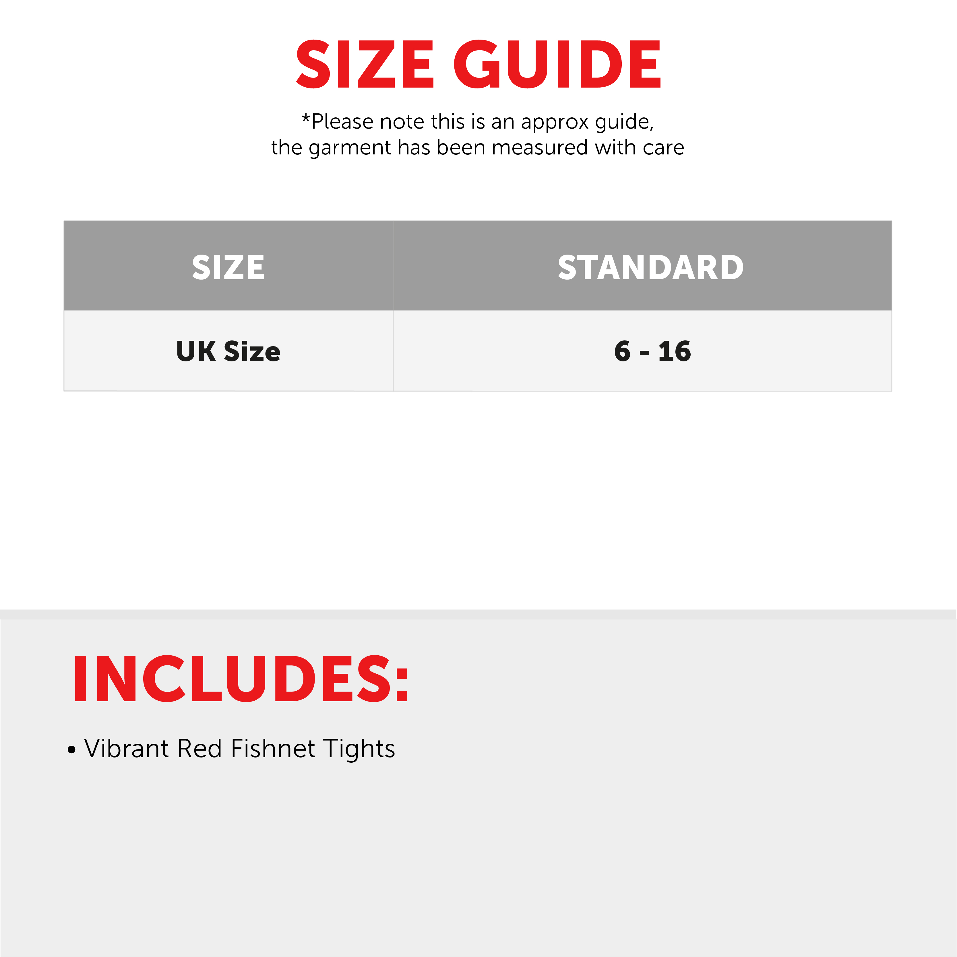 AVAILABLE IN ONE SIZE: Your Ladies Red Fishnet Tights are available in just one size, UK 6 - 16, with enough stretch for anyone to wear comfortably!