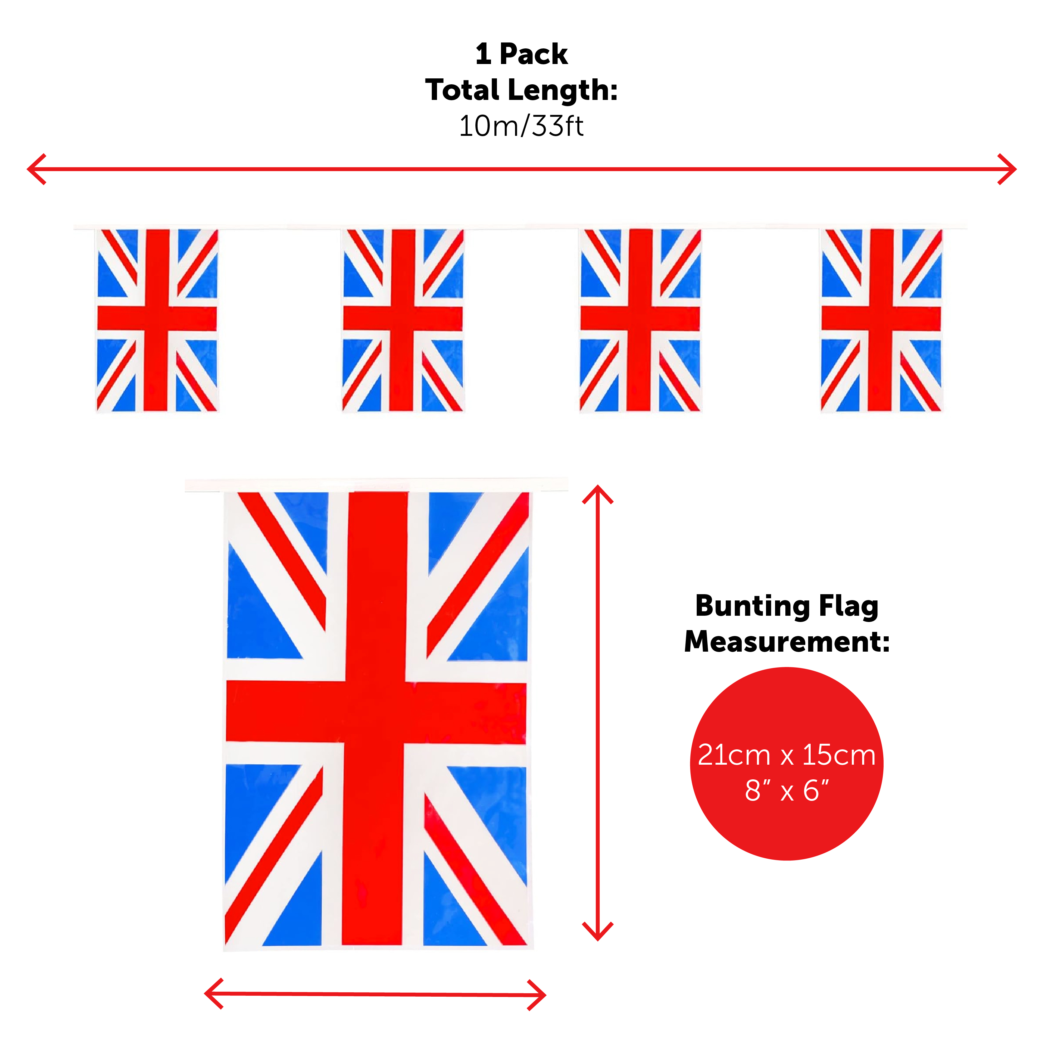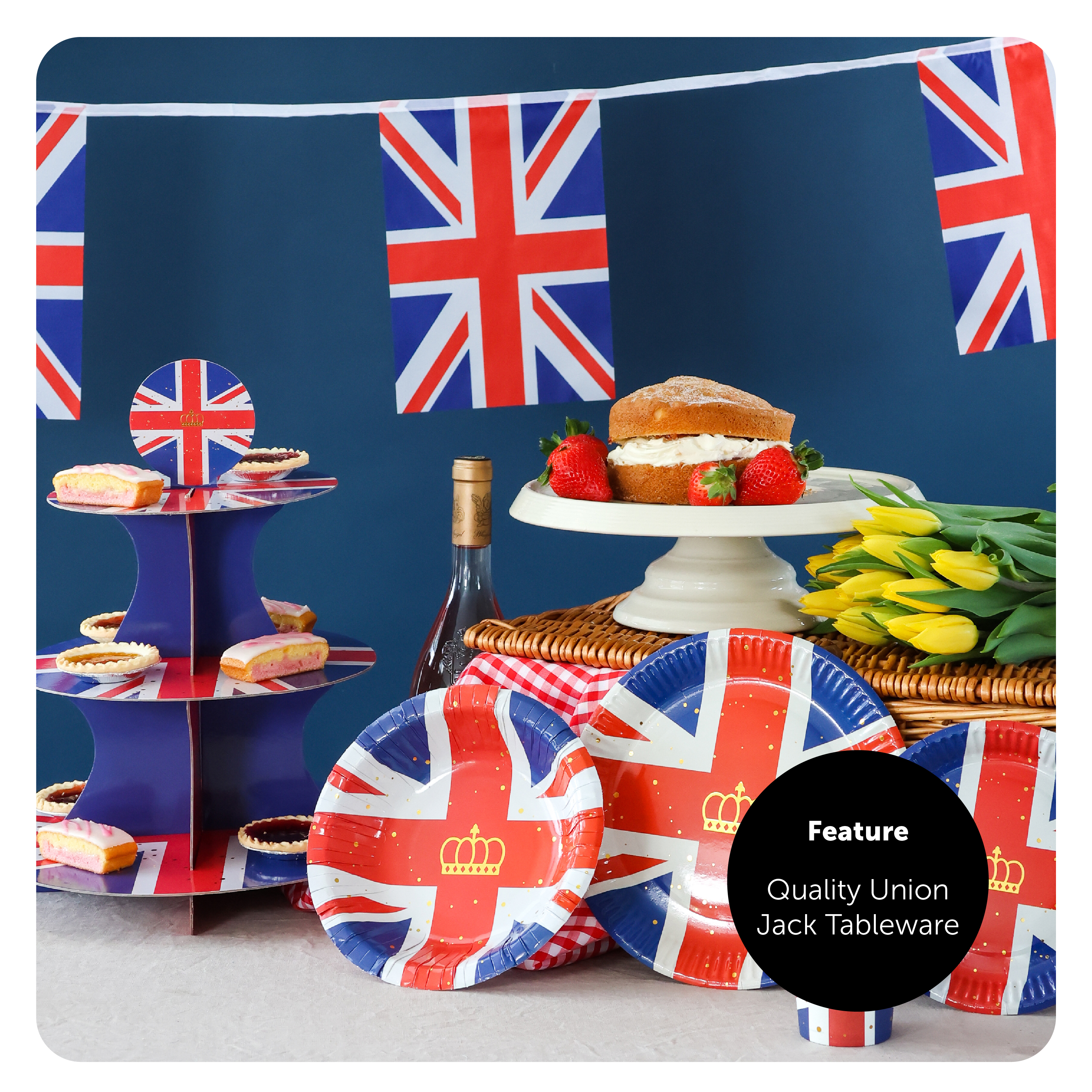 SET INCLUDES: Your Union Jack Mega Bundle Set includes 1x Pack of Union Jack Bunting, 2x Large 5ft x 3ft Union Jack Flags, 1x Union Jack Foil Balloon with a Crown in the middle, 100x Union Jack Cupcake Cases, 10x Union Jack Paper Cups, 1x 3 Tier Union Jack Cake Stand, 10x 7" Union Jack Paper Plates, 10x 9" Union Jack Paper Plates, 10x 7.5" Union Jack Bowls, 12x Plastic Union Jack Bowler Hats, 1x Palette of Red, White & Blue Face and Body Paint, 12x Union Jack Hand Waving Flag, and 1x Party Cannon with Red, White and Blue Biodegradable Confetti, perfect for any British event!