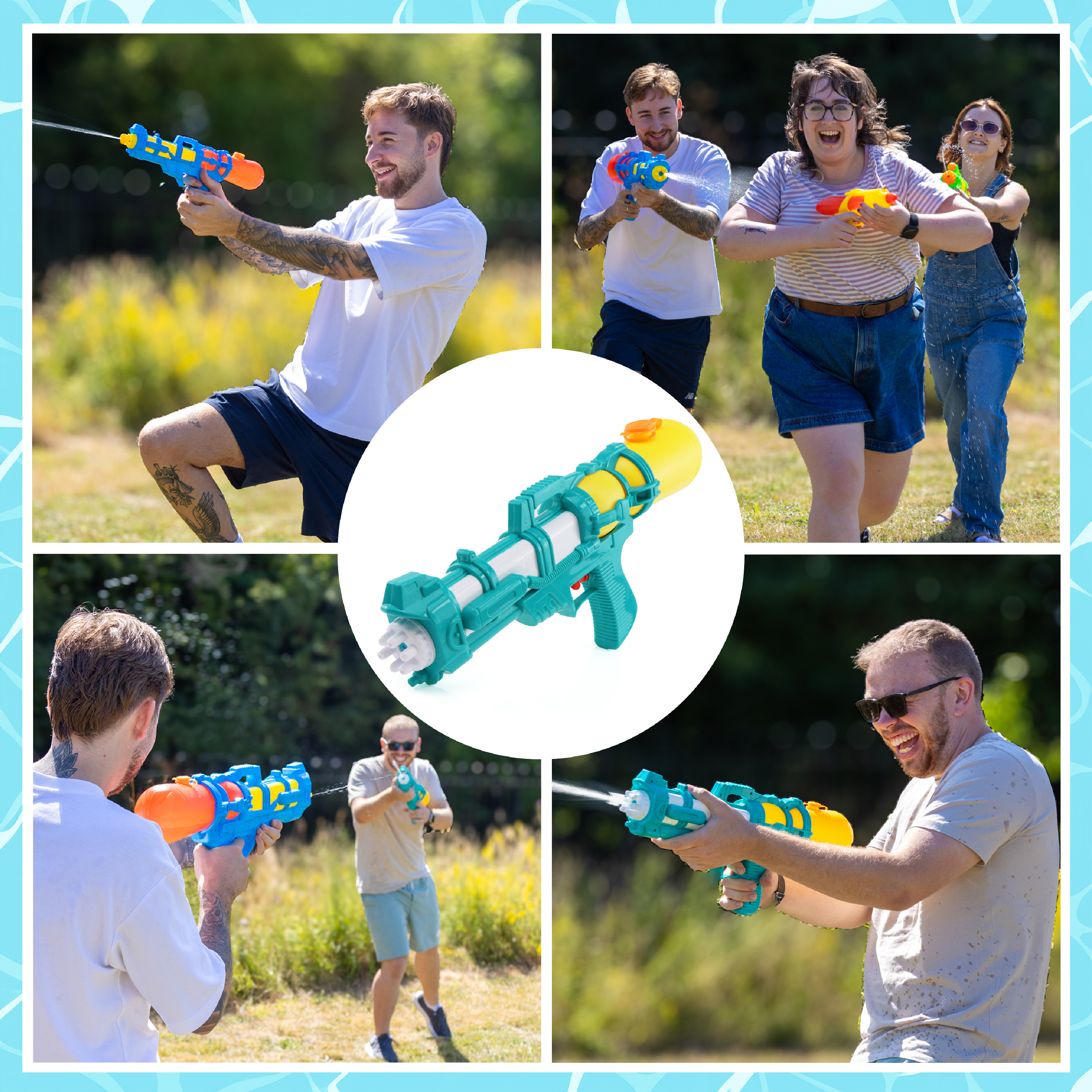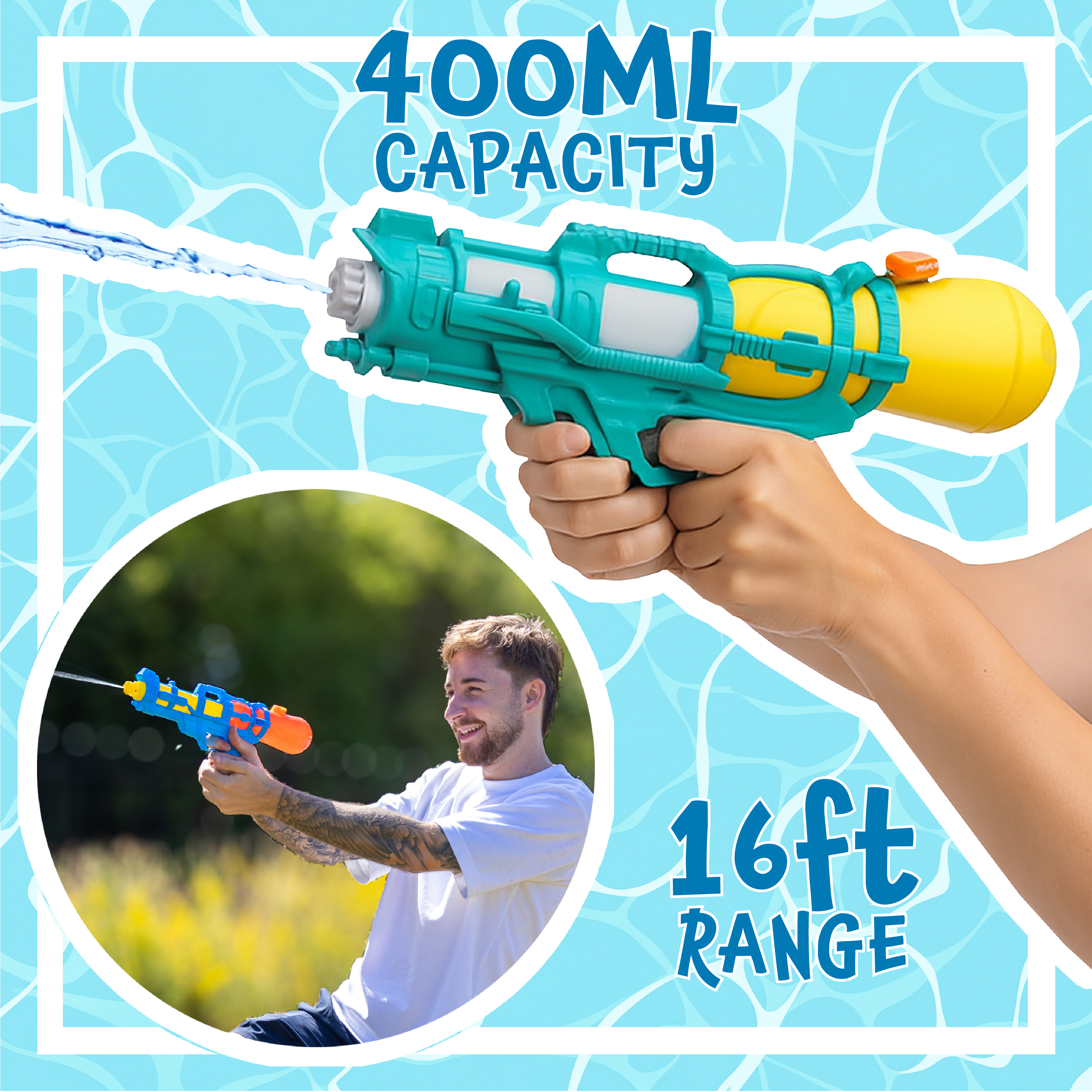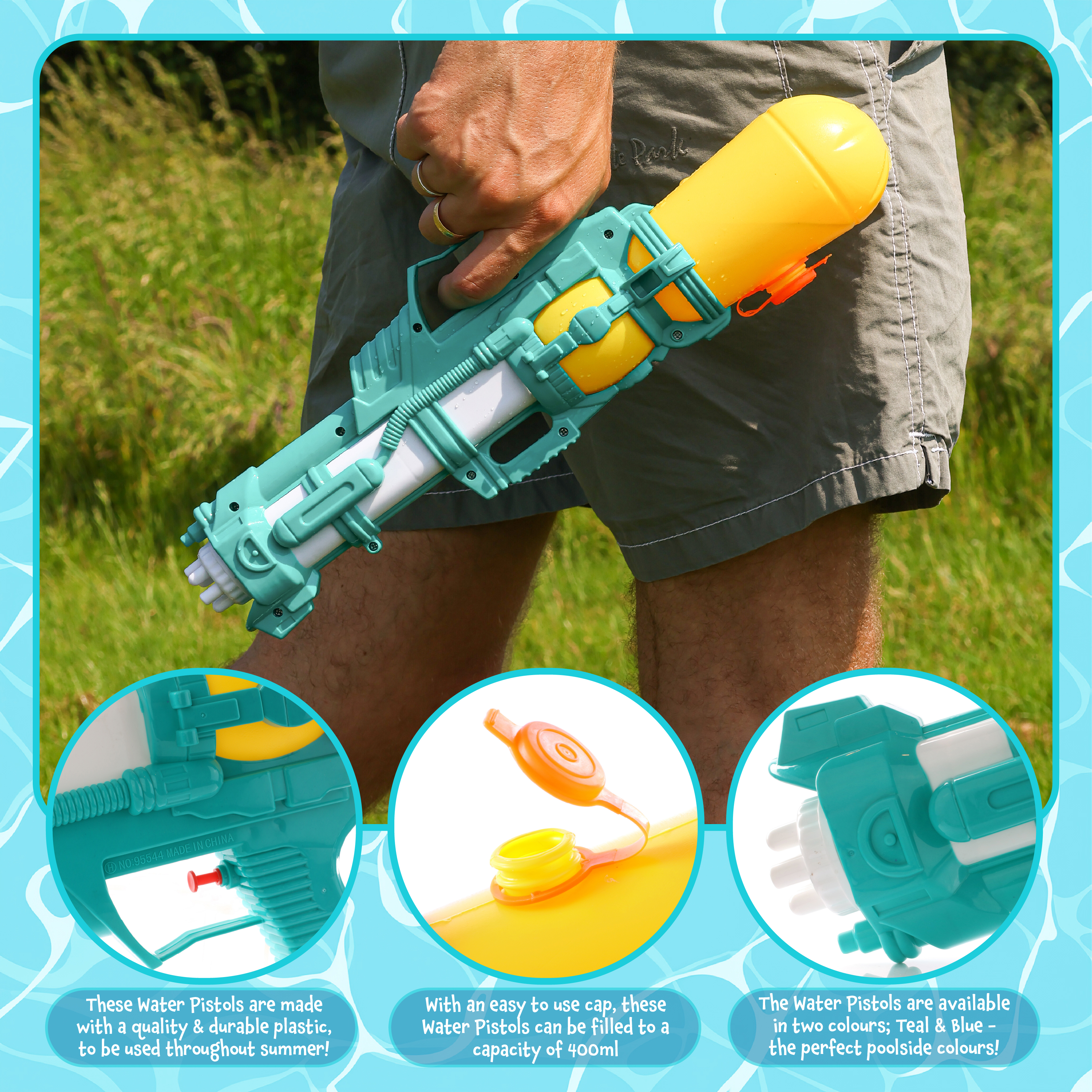 ASSORTED COLOURS – RANDOM SELECTION: Each water gun comes in a bold and colourful design, selected at random from the following combinations: