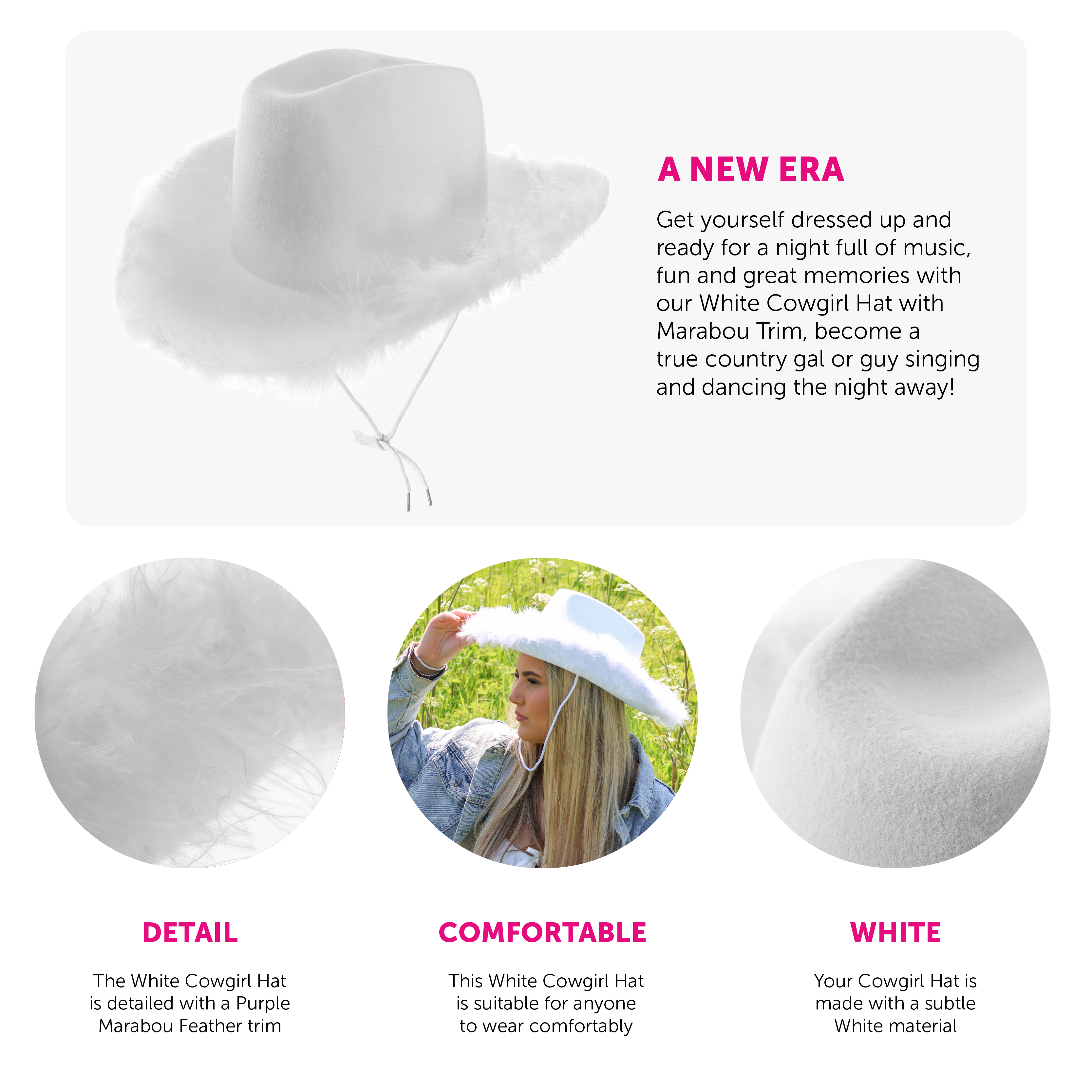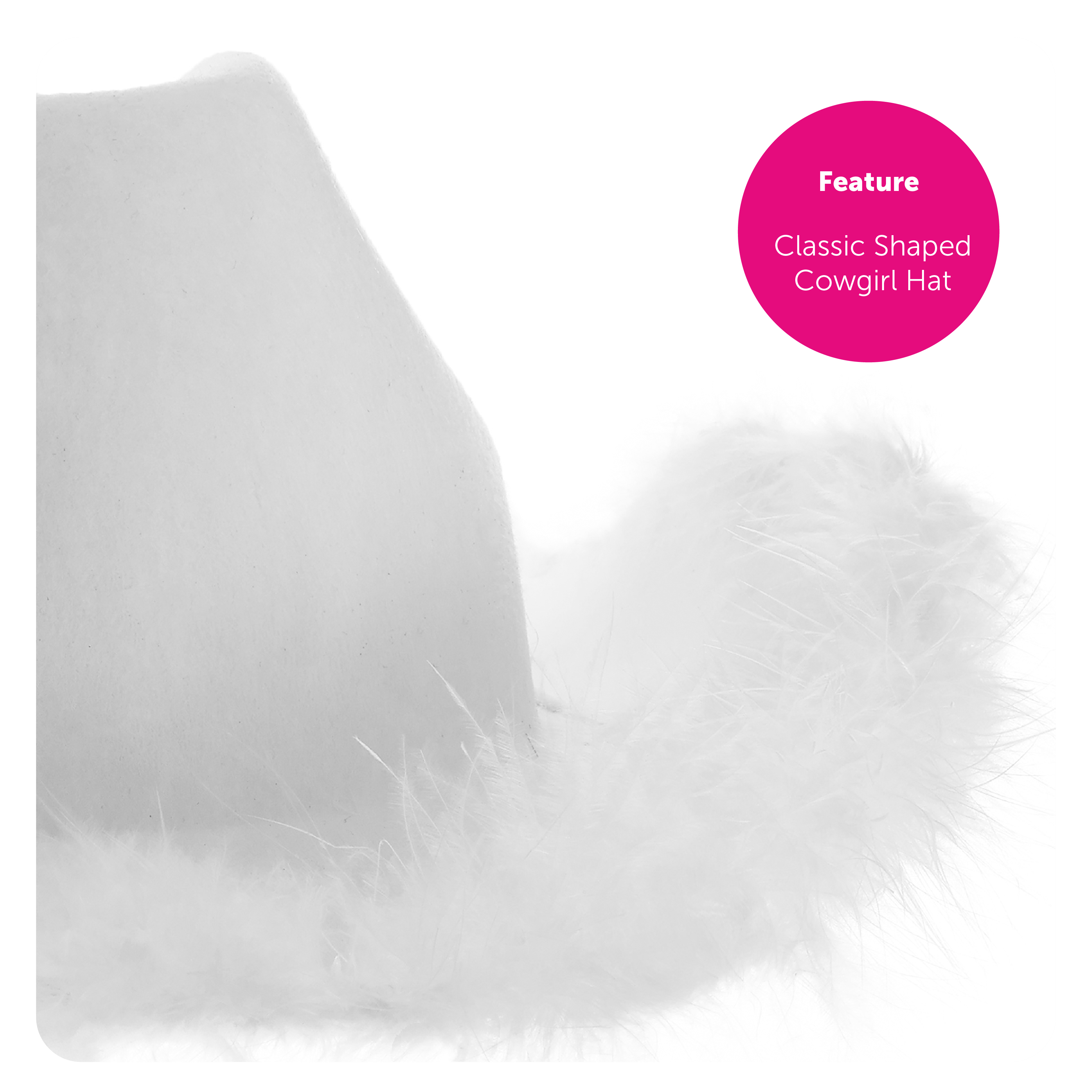 - Cowgirl Hat: White with marabou feather trim, adjustable white chin strap, one size fits most (58cm head size)