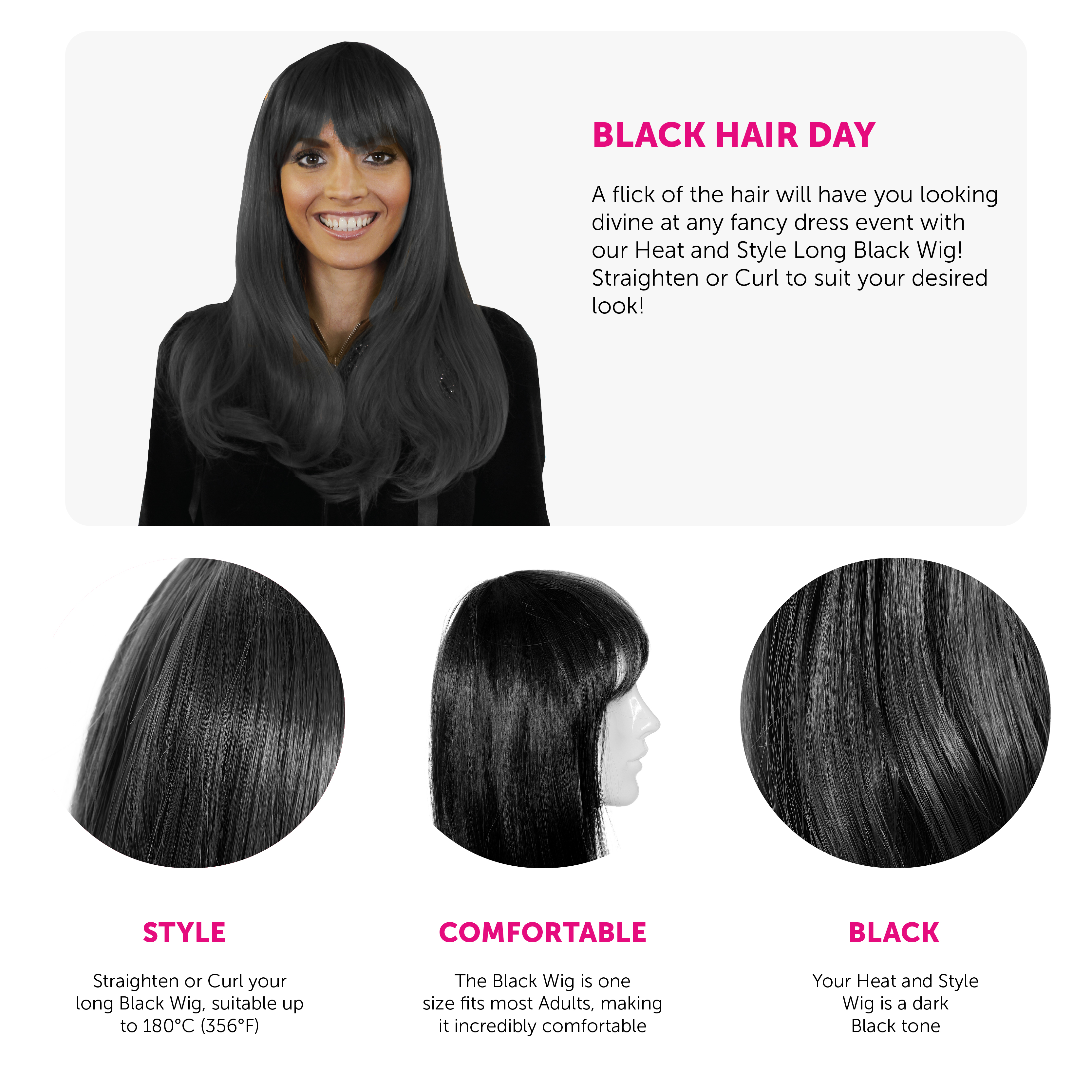 HEAT & STYLE BLACK WIG: A flick of the hair will have you looking divine at any fancy dress event with our Heat and Style Long Black Wig! Straighten or Curl to suit your desired look!