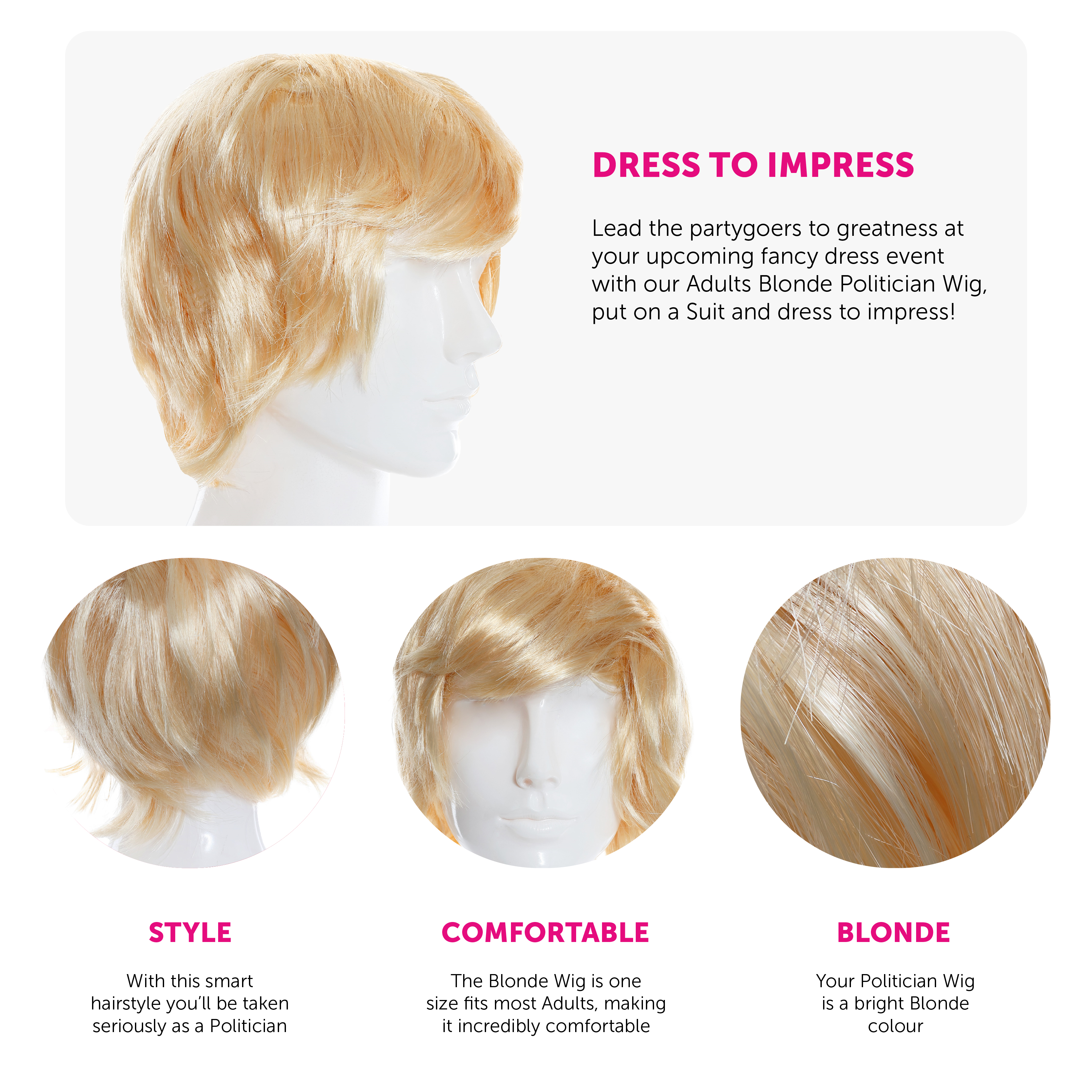 BLONDE POLITICIAN WIG: Lead the partygoers to greatness at your upcoming fancy dress event with our Adults Blonde Politician Wig, put on a Suit and dress to impress!