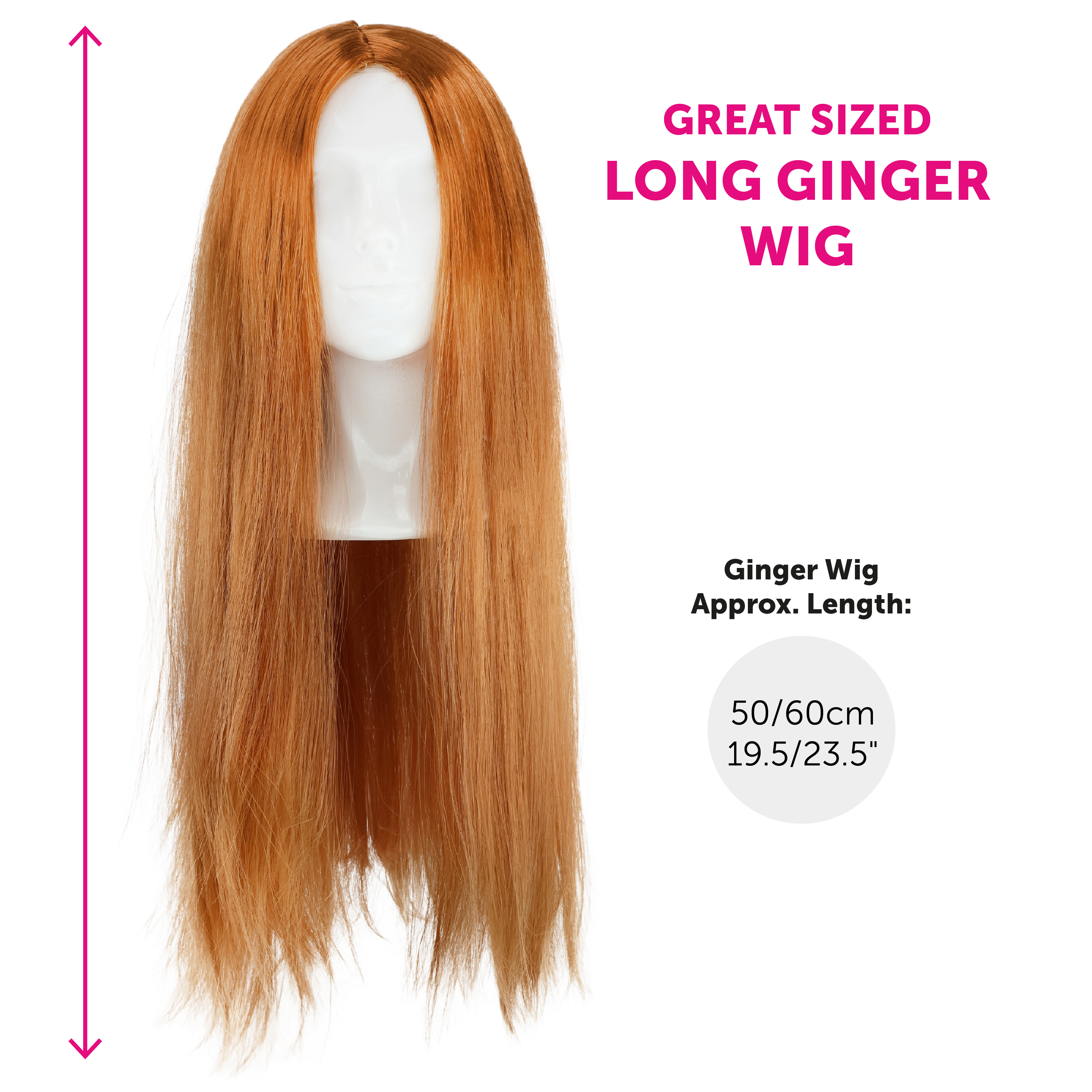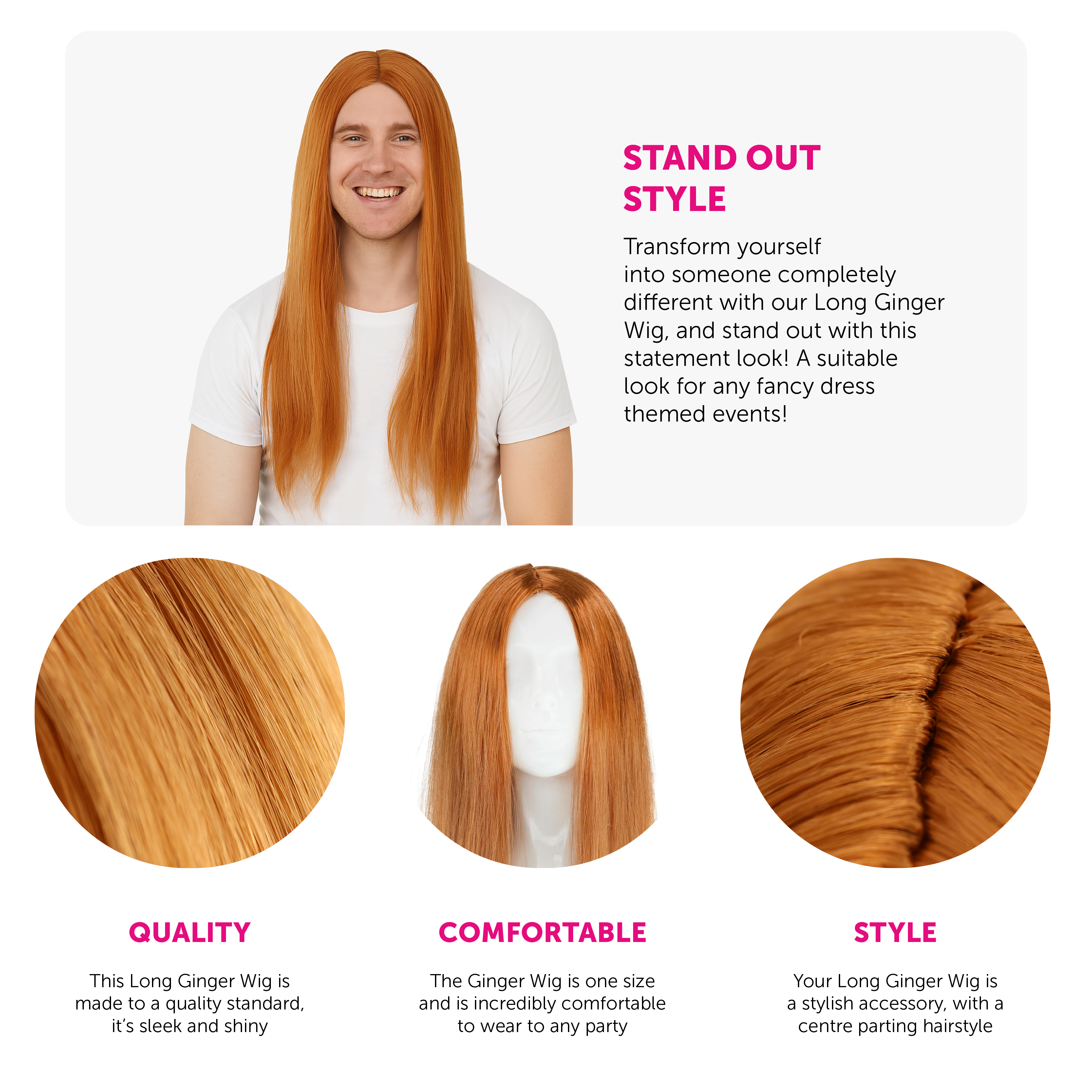 WIG DETAILS: A quality made, Long Ginger Wig styled in a straight fashion and parted in the middle, this Wig is a great finishing touch to your Costume!