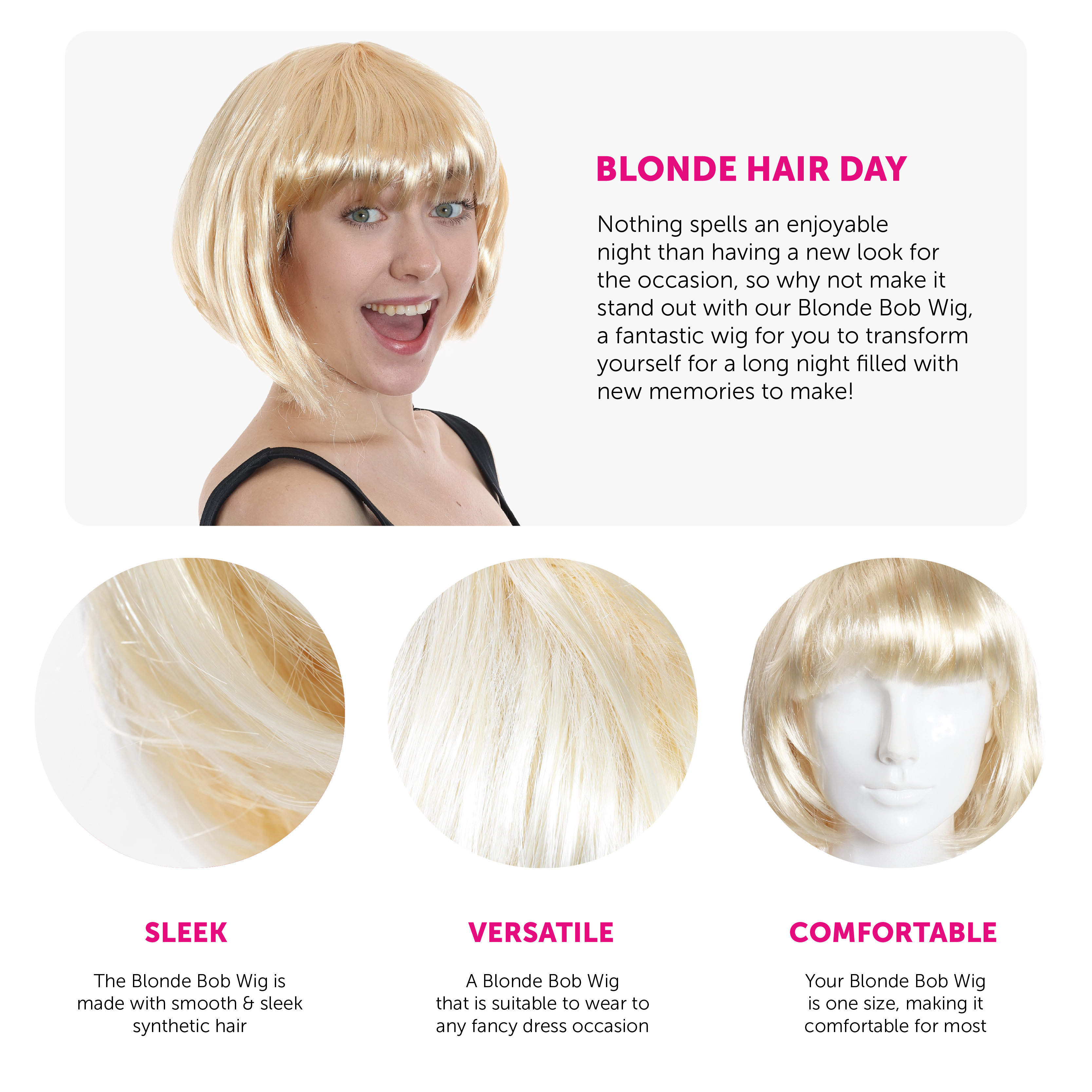 BLONDE BOB WIG: Nothing spells an enjoyable night than having a new look for the occasion, so why not make it stand out with our Blonde Bob Wig, a fantastic wig for you to transform yourself for a long night filled with new memories to make!