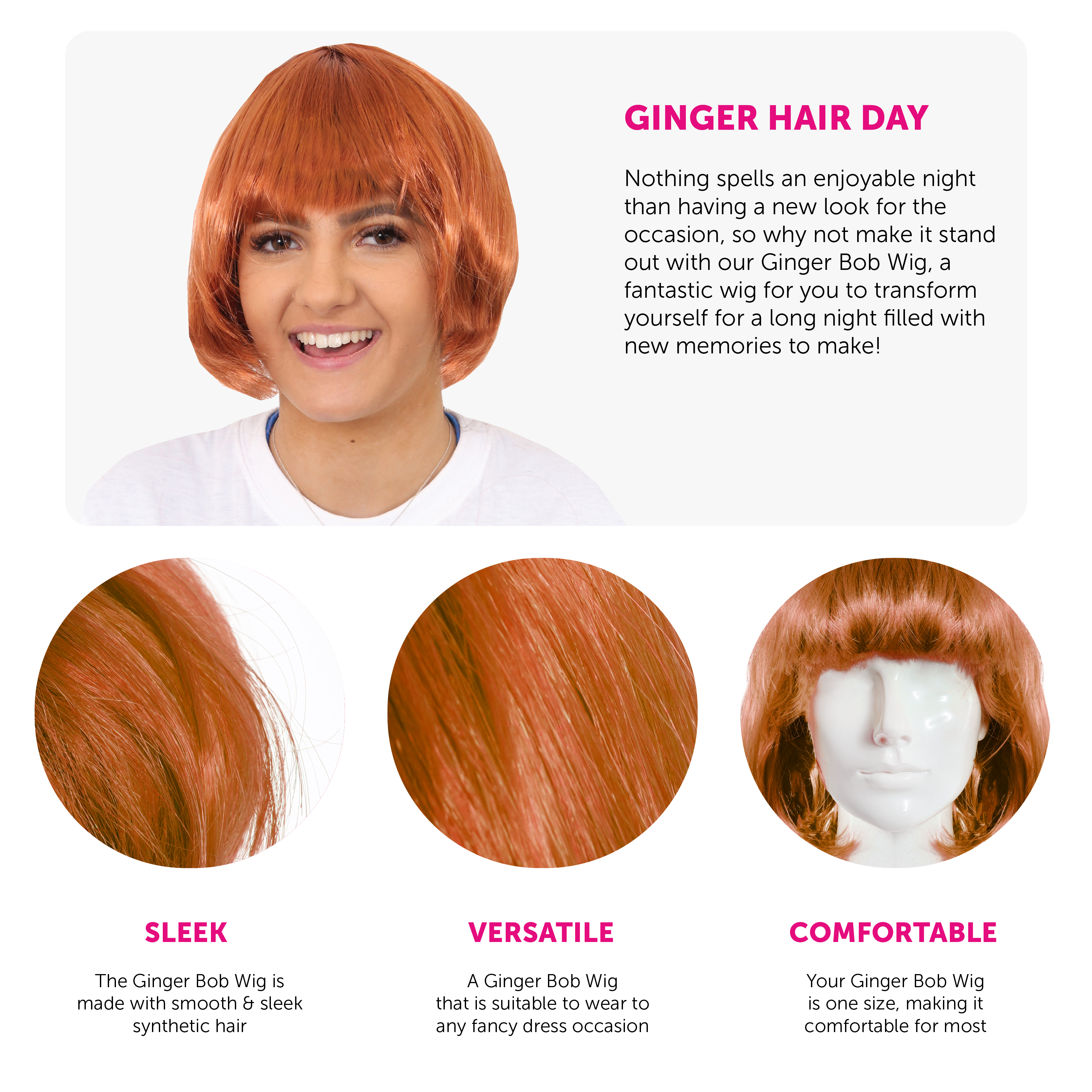 GINGER BOB WIG: Nothing spells an enjoyable night than having a new look for the occasion, so why not make it stand out with our Ginger Bob Wig, a fantastic wig for you to transform yourself for a long night filled with new memories to make!