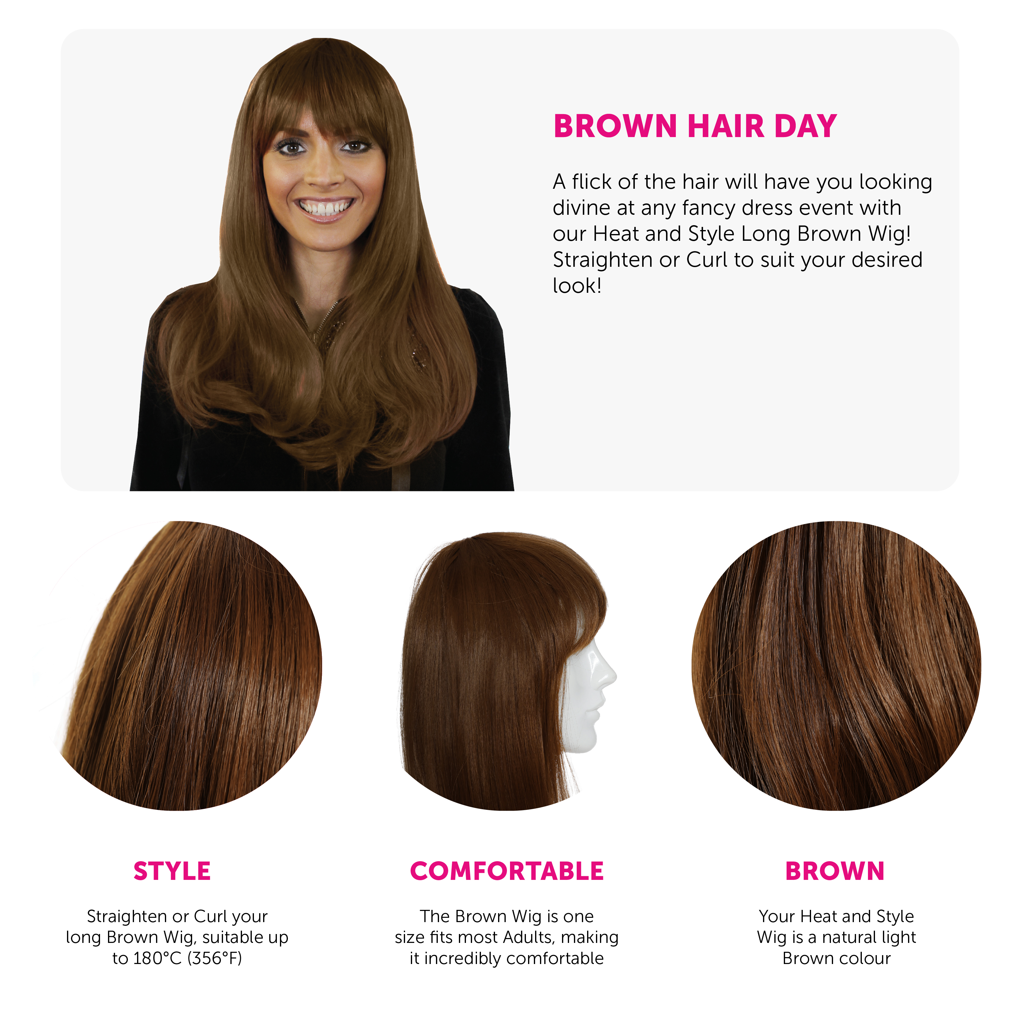 HEAT & STYLE BROWN WIG: A flick of the hair will have you looking divine at any fancy dress event with our Heat and Style Long Brown Wig! Straighten or Curl to suit your desired look!