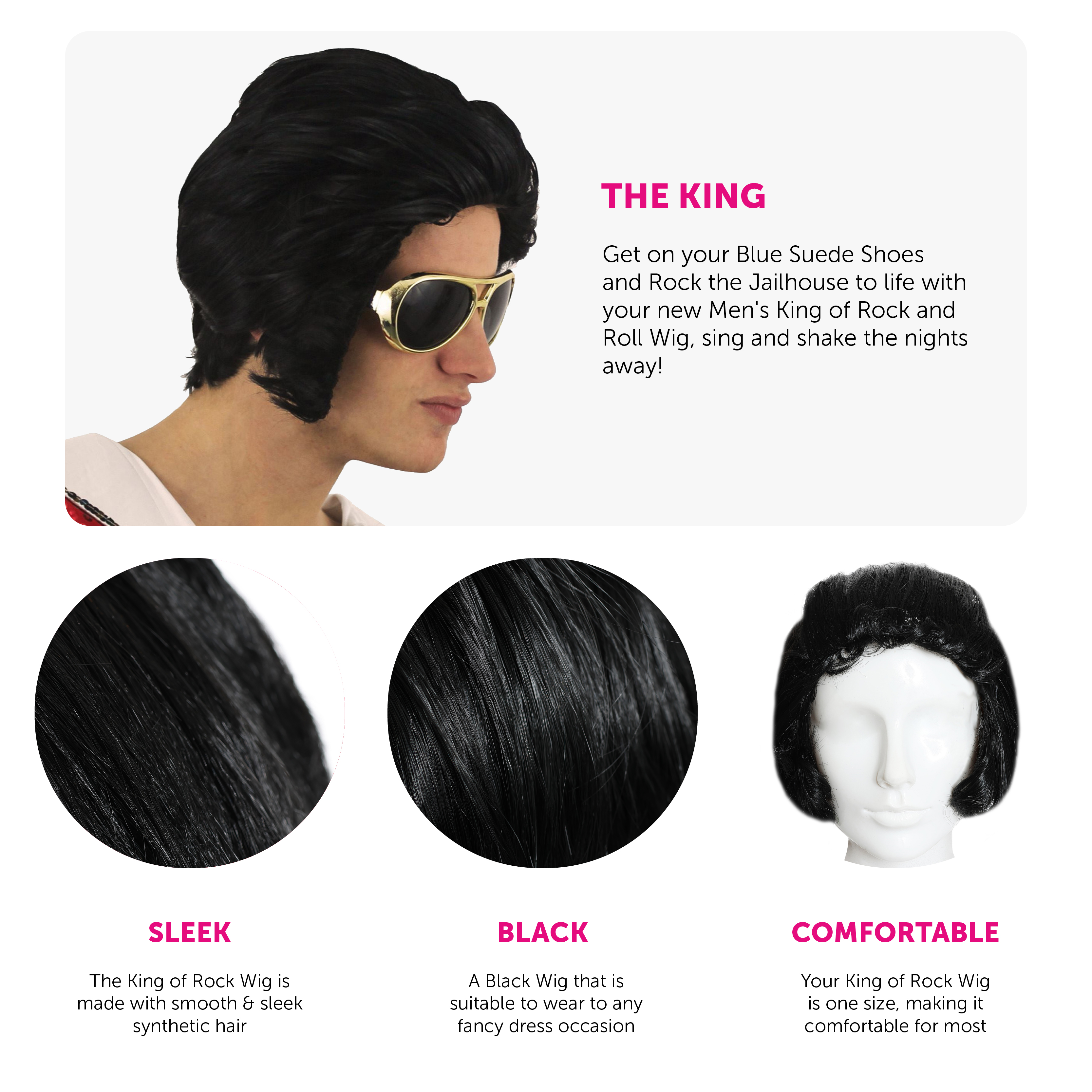 MEN'S KING OF ROCK AND ROLL WIG: Get on your Blue Suede Shoes and Rock the Jailhouse to life with your new Men's King of Rock and Roll Wig, sing and shake the nights away! EASY TO BRUSH WIG: You won’t want your wig to look untidy, that’s why our wigs are easy to brush and comb into the style and position you want, made with an excellent quality and extremely reusable for any other costumes you need to spice up! ONE SIZE FITS ALL: This King of Rock and Roll Wig is a very comfortable and easy to wear wig, being a one size fits all for all Adults, you can transform anyone into the great King of Rock for any fancy dress occasion! COMPLETE ANY COSTUME SET: If you’re looking for the perfect accessory to finish your costume off then this is just what you need to make an impression, for a bold look with a high quality finish and design! PERFECT FOR MUSIC AND CELEBRITY FANCY DRESS: Whether it be a 60's styled music themed or Celebrity fancy dress party, you’re sure to have a night filled with Rock with our Men's King of Rock and Roll Wig!
