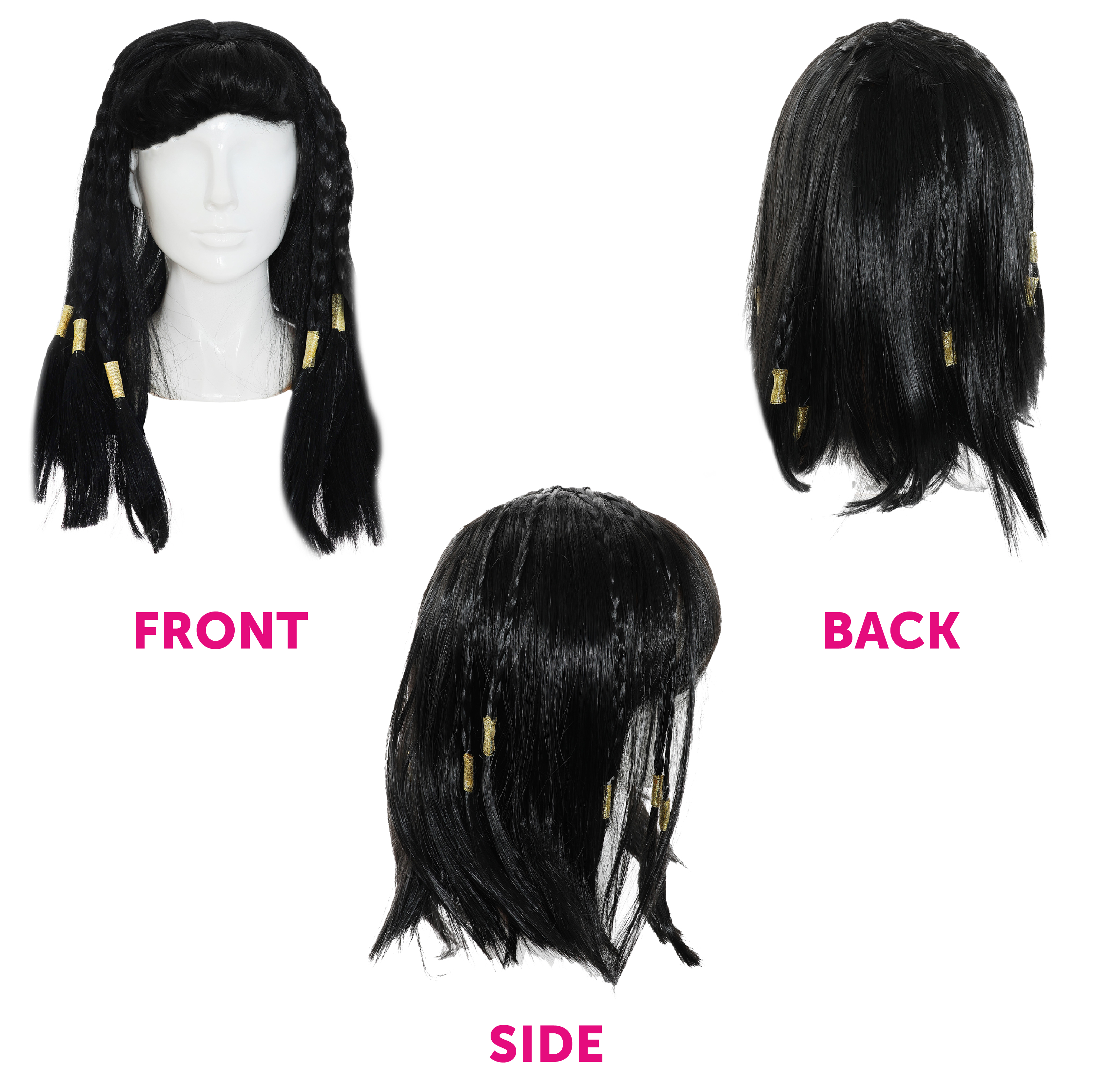 EGYPTIAN QUEEN WIG DETAILS: Your Ladies Egyptian Queen Wig is a shoulder-length Black Wig detailed with a Full Fringe and small plaits tied with eye-catching Golden bands, you'll feel like royalty!