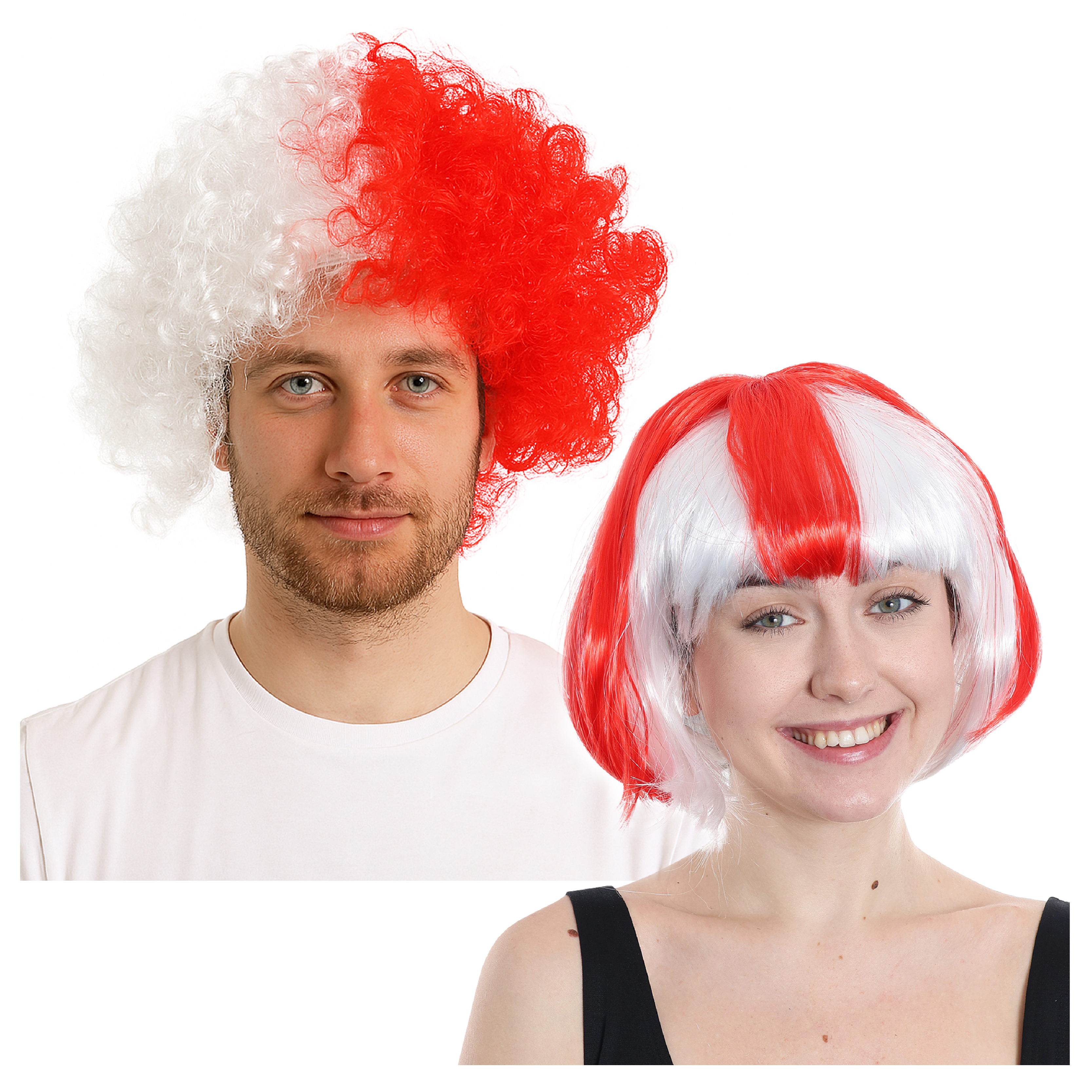WIG DETAILS: This set includes 1x short Red & White England Flag Bob Wig, and 1x half Red & half White Curly Afro Wig, the perfect look for any sporting event & English occasions!