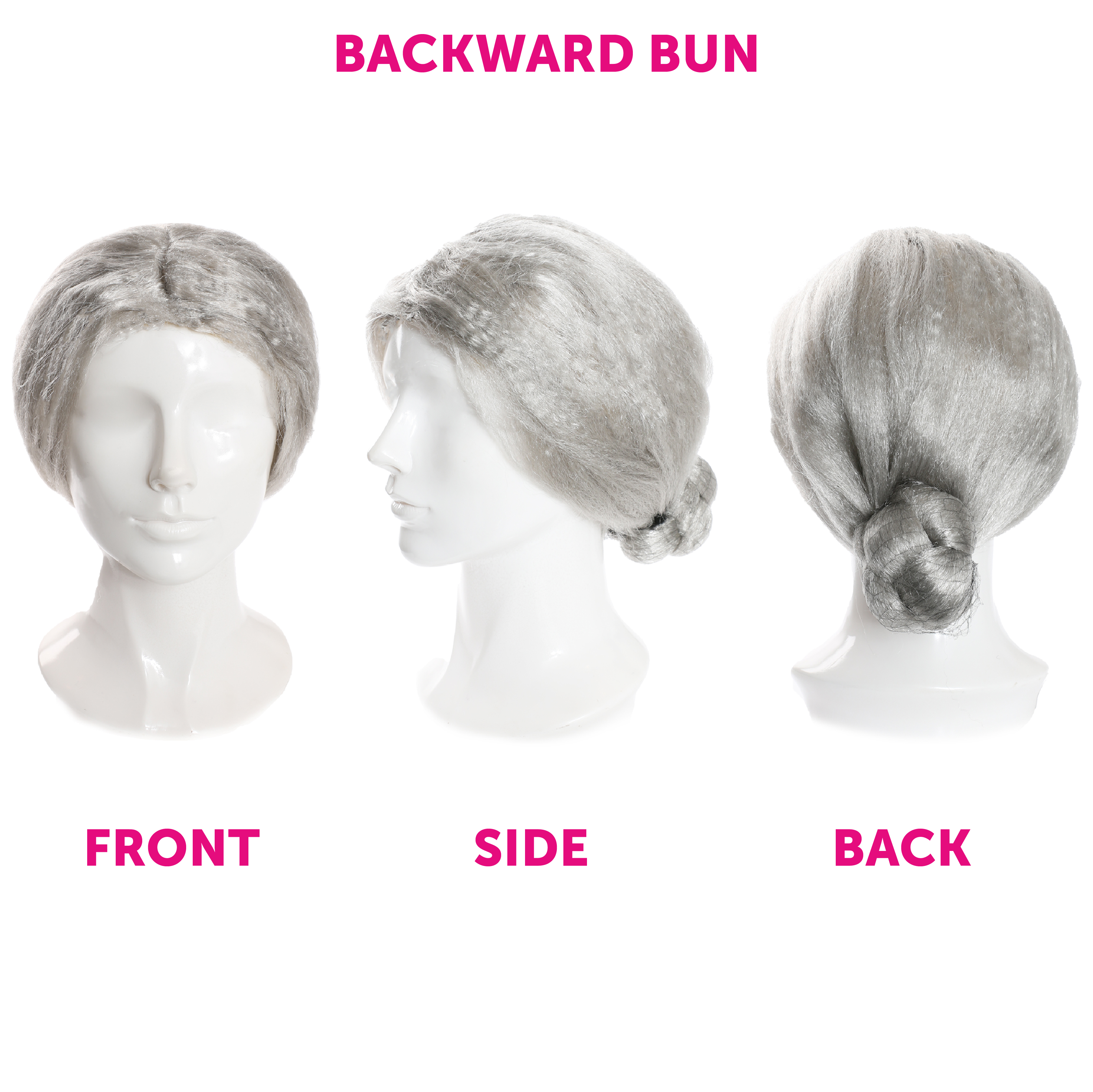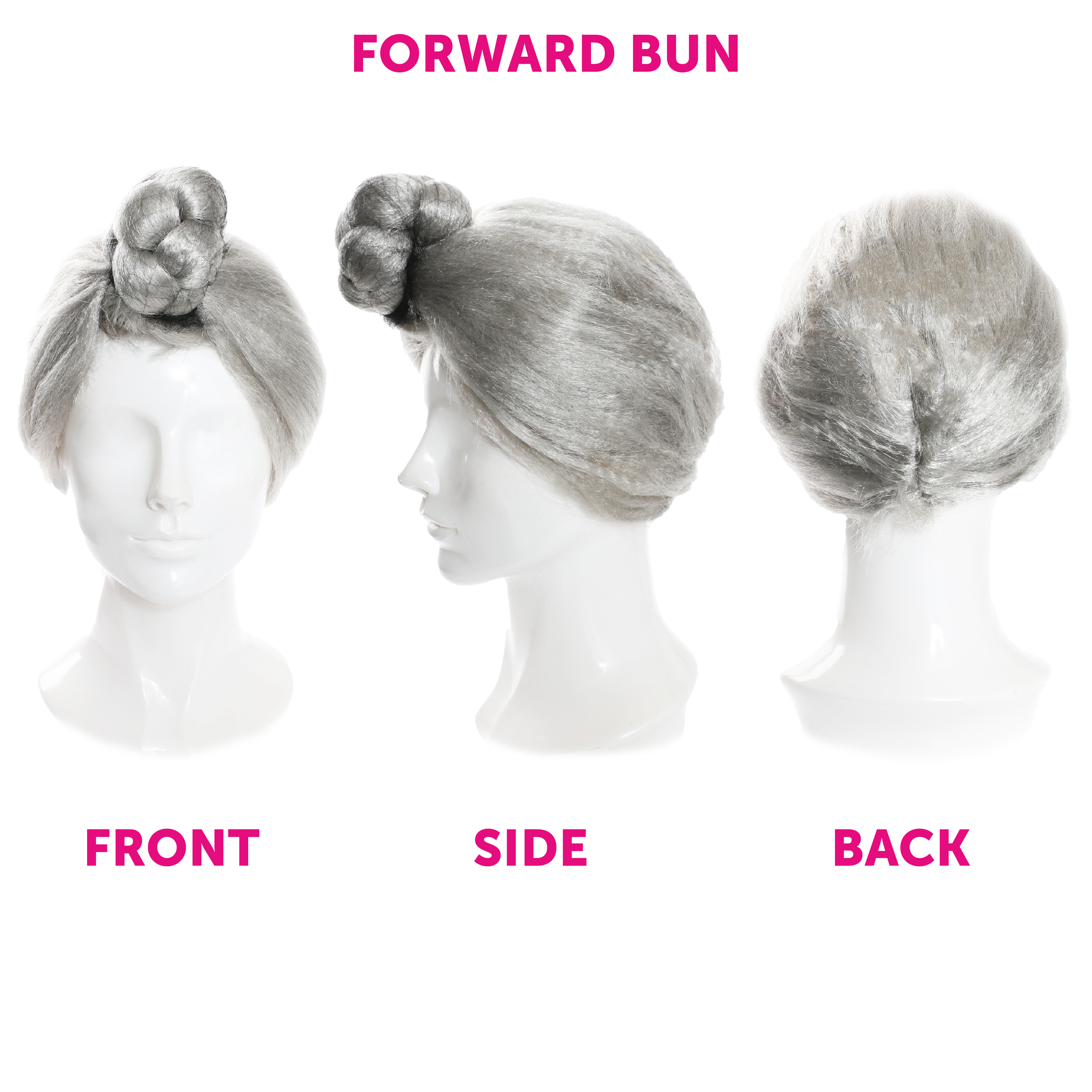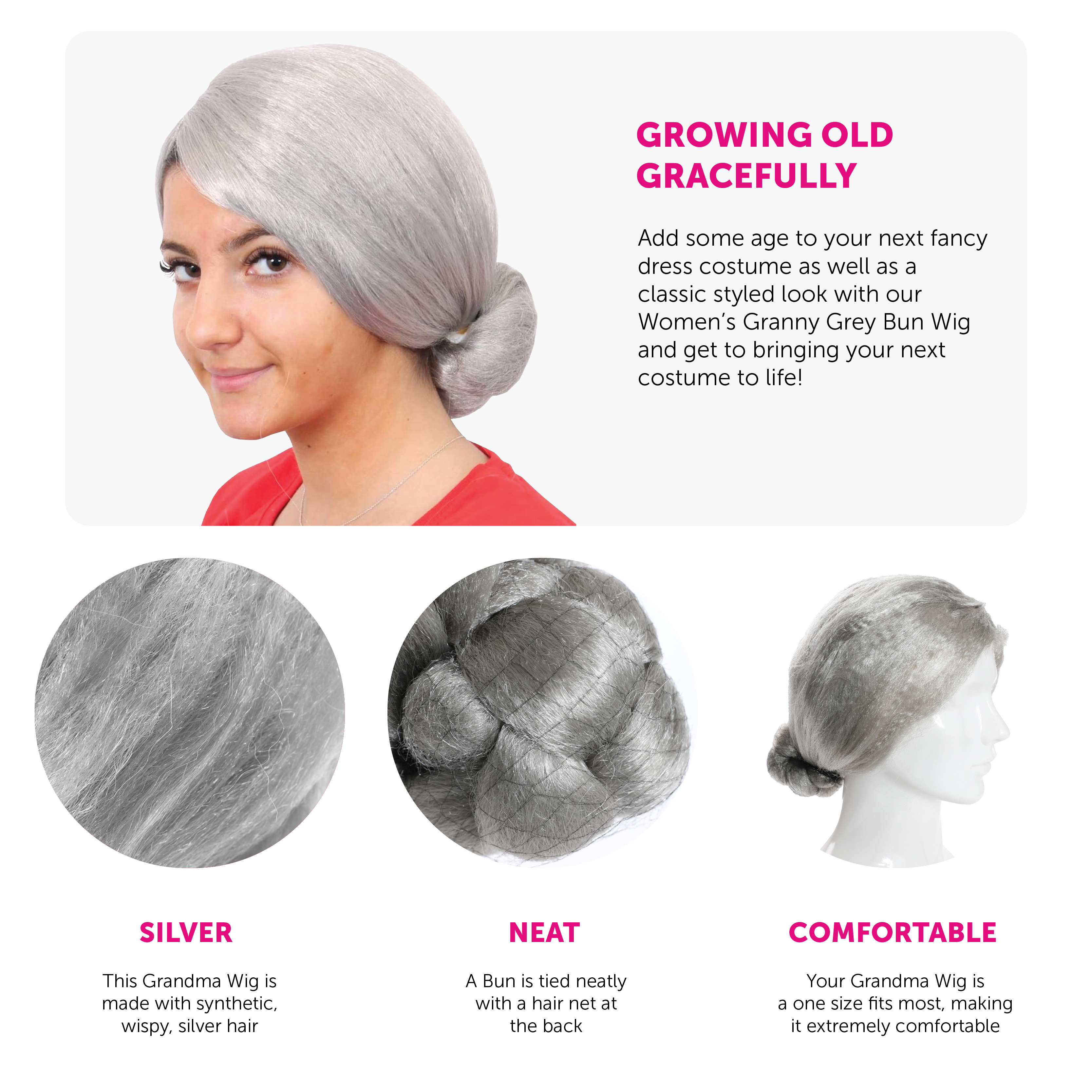 WOMENS GRANNY GREY BUN WIG: Add some age to your next fancy dress costume as well as a classic styled look with our Women’s Granny Grey Bun Wig and get to bringing your next costume to life!
