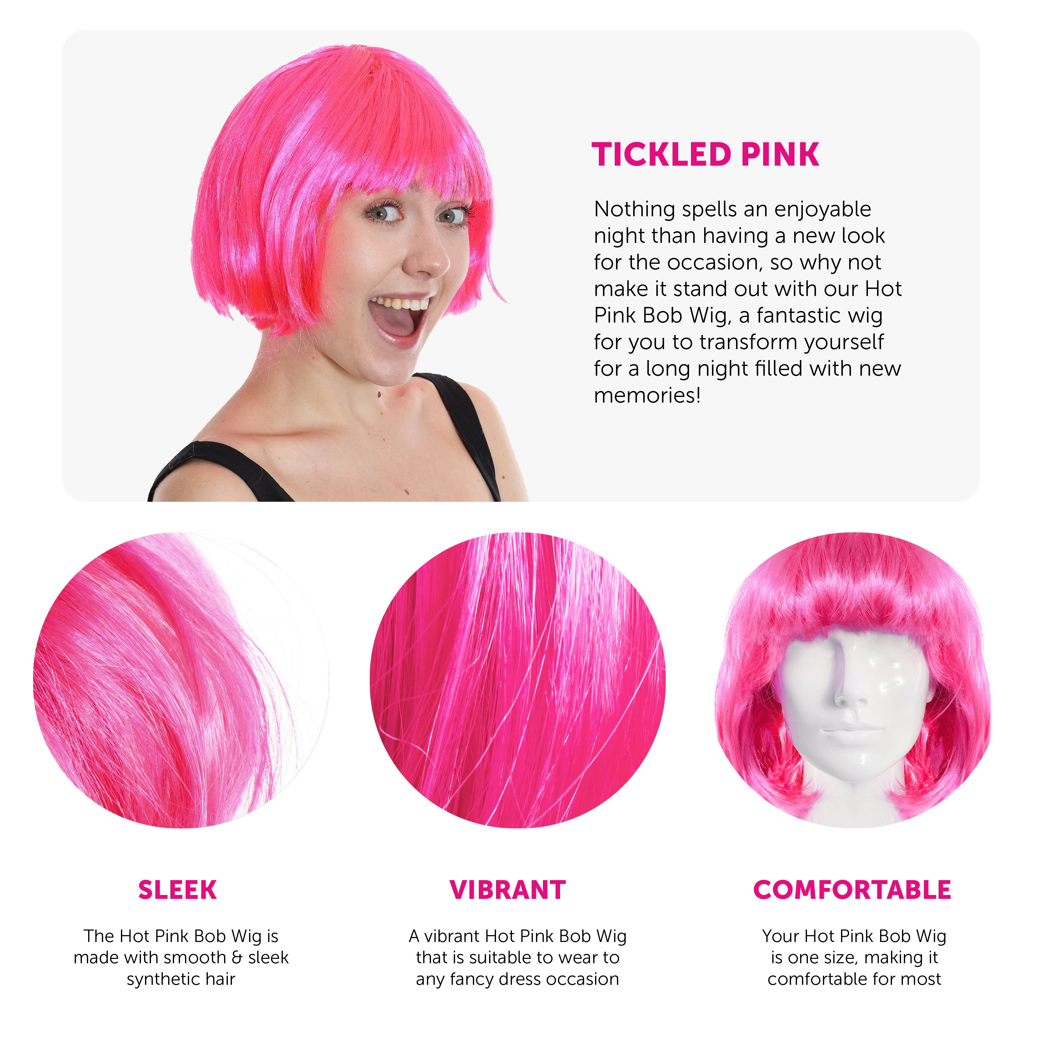 GREAT ACCESSORY TO ANY COSTUME: No Matter what costume you wear to any Fancy Dress party, there’s always somewhere for a Hot Pink Bob Wig to make an appearance and add the extra charm you’ve been looking for!