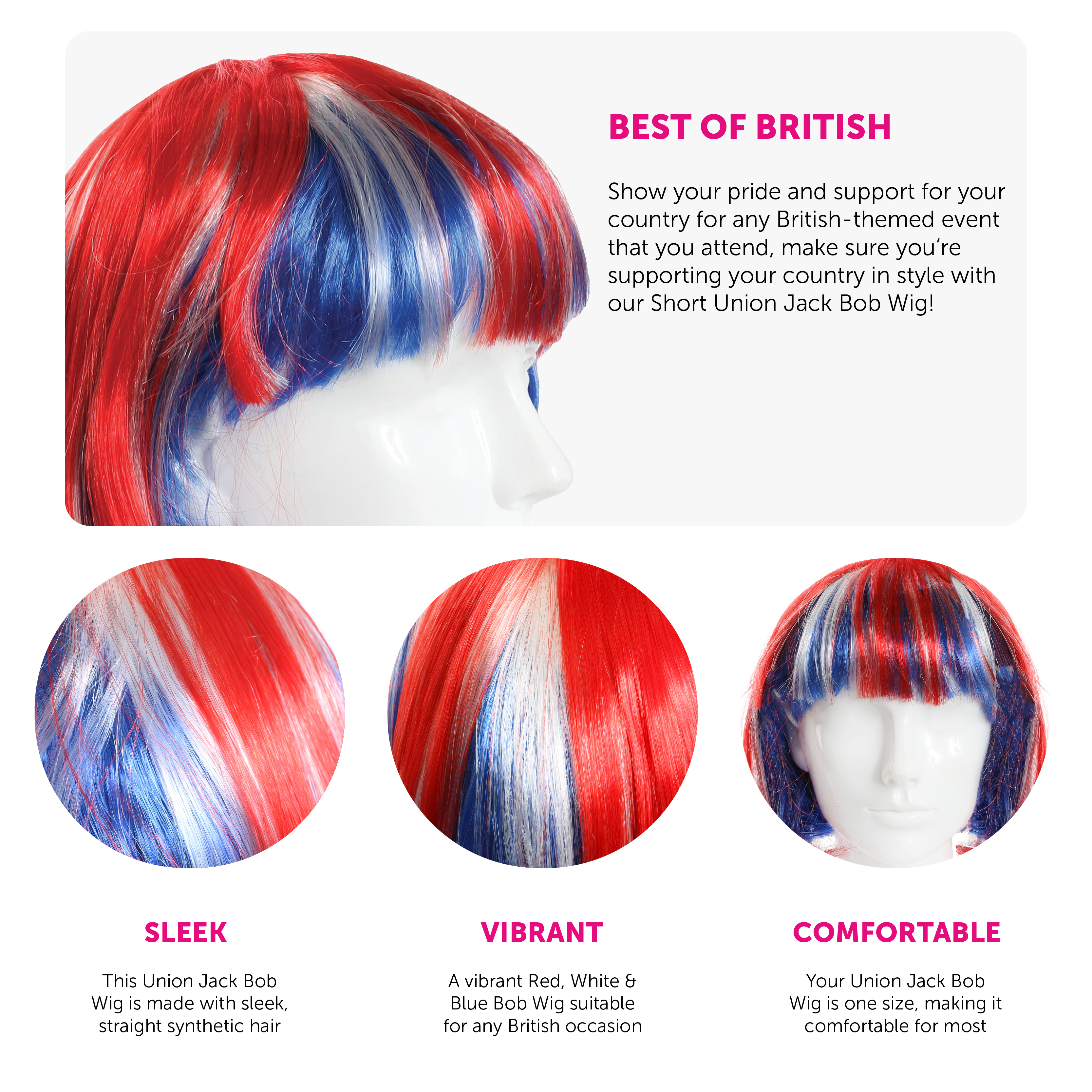 - CHILDS UNION JACK BOB WIG: Show your pride and support for your country for any British-themed event that you attend, make sure you’re supporting your country in style with our Childs Union Jack Bob Wig!