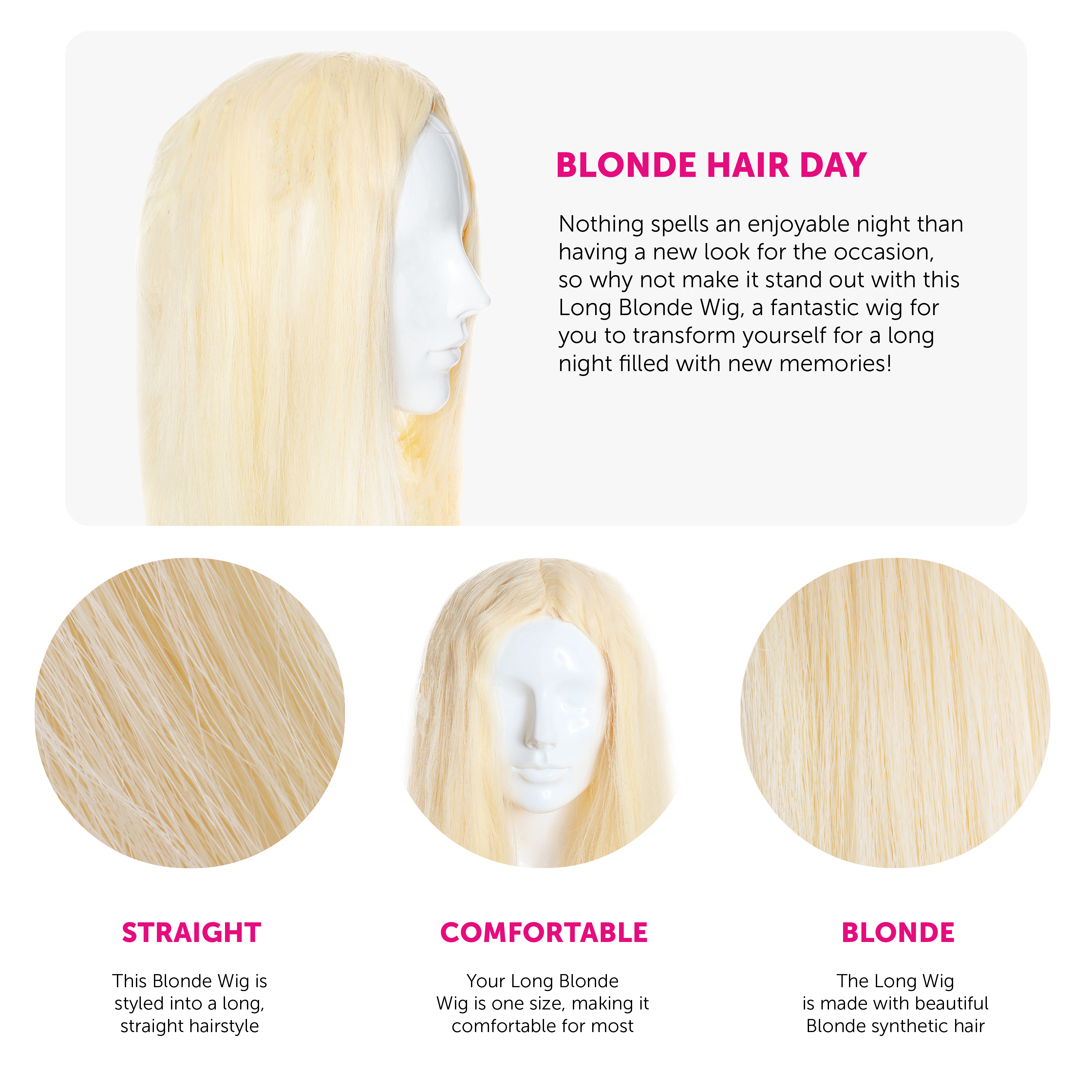 WIG DETAILS: Your Blonde Wig is a quality, washable 24" (61cm) long, straight styled, Light Blonde Wig parted down the middle, the perfect addition to your outfit!