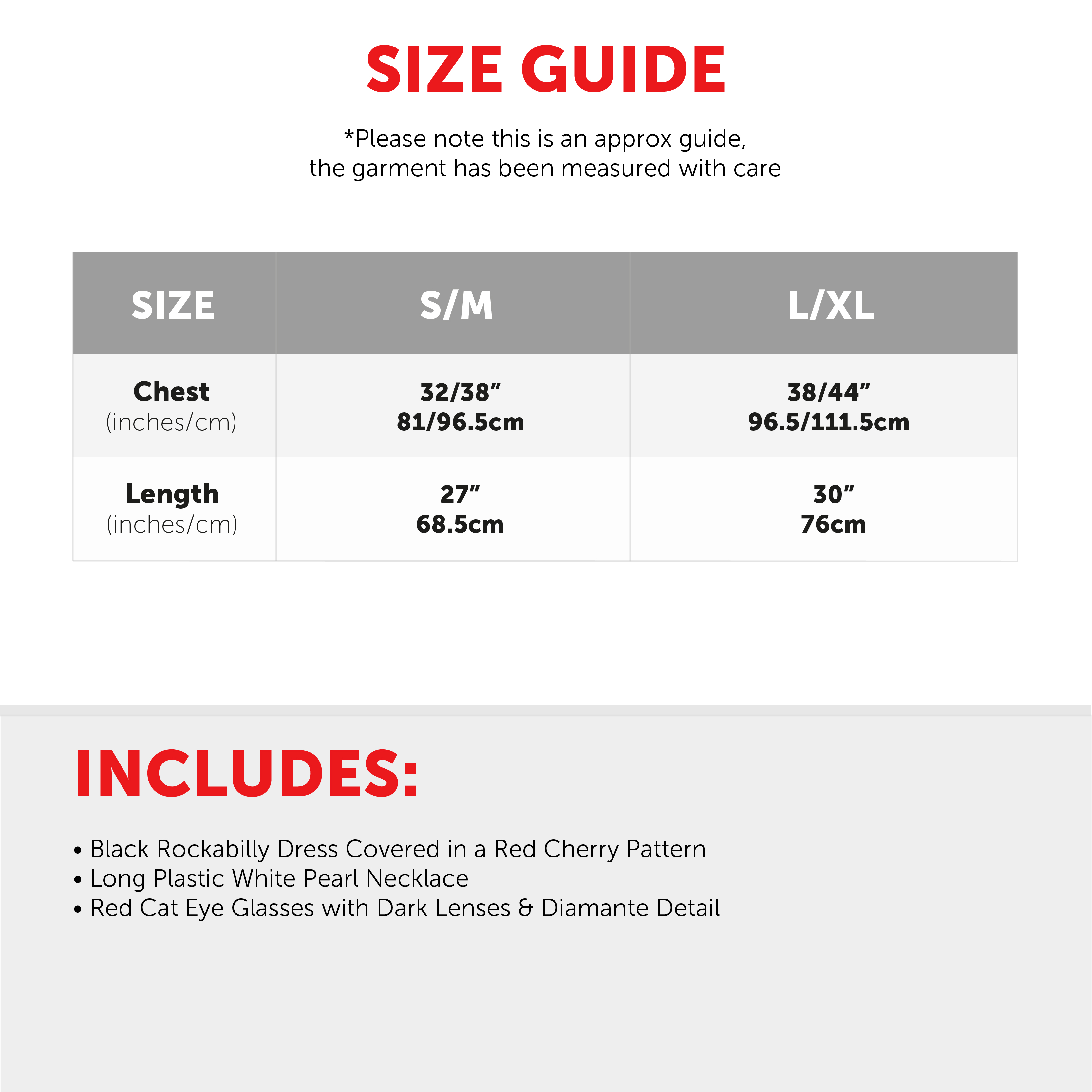 AVAILABLE IN TWO SIZES: Your Ladies Rockabilly Dress is available in two sizes, S/M and L/XL: Small/Medium: Chest: 32/38" (81/96.5cm), Length: 27" (68.5cm) | Large/X-Large: Chest: 38/44" (96.5/111.5cm), Length: 30" (76cm)