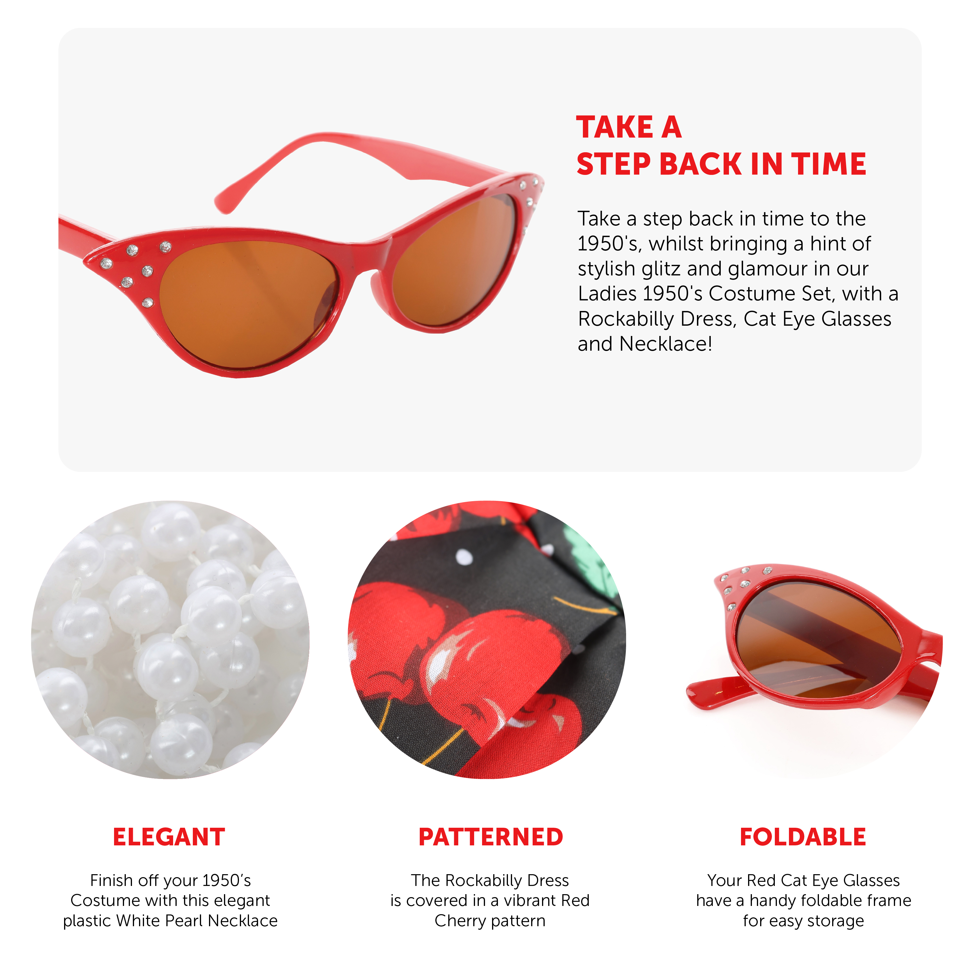 LADIES 1950'S COSTUME SET: Take a step back in time to the 1950's, whilst bringing a hint of stylish glitz and glamour in our Ladies 1950's Costume Set, with a Rockabilly Dress, Cat Eye Glasses and Necklace!