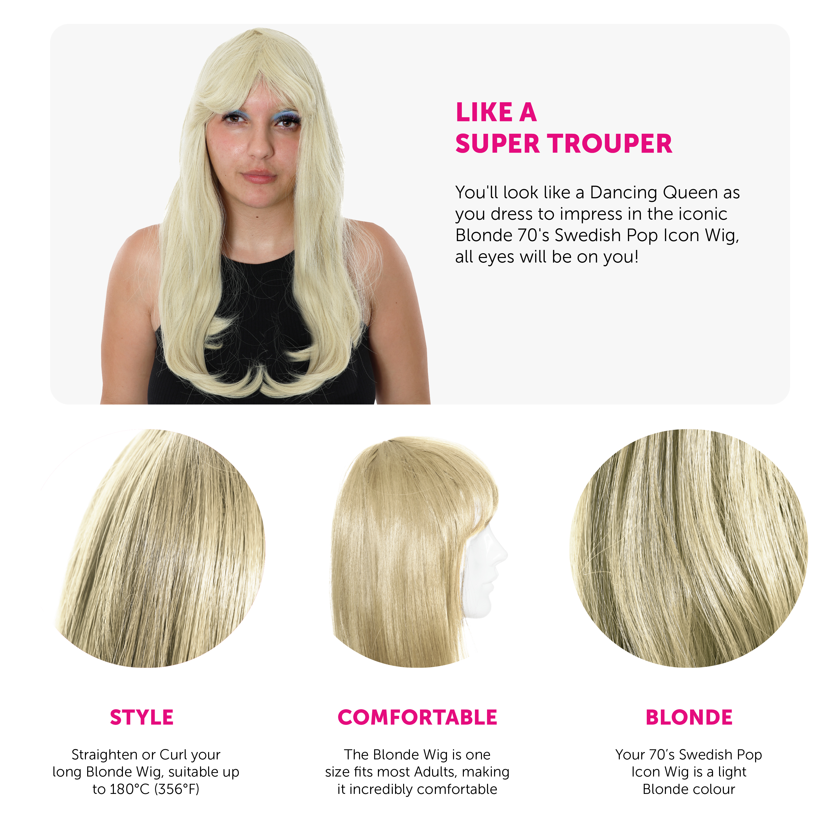 BLONDE 70'S SWEDISH POP ICON WIG: You'll look like a Dancing Queen as you dress to impress in the iconic Blonde 70's Swedish Pop Icon Wig, all eyes will be on you!