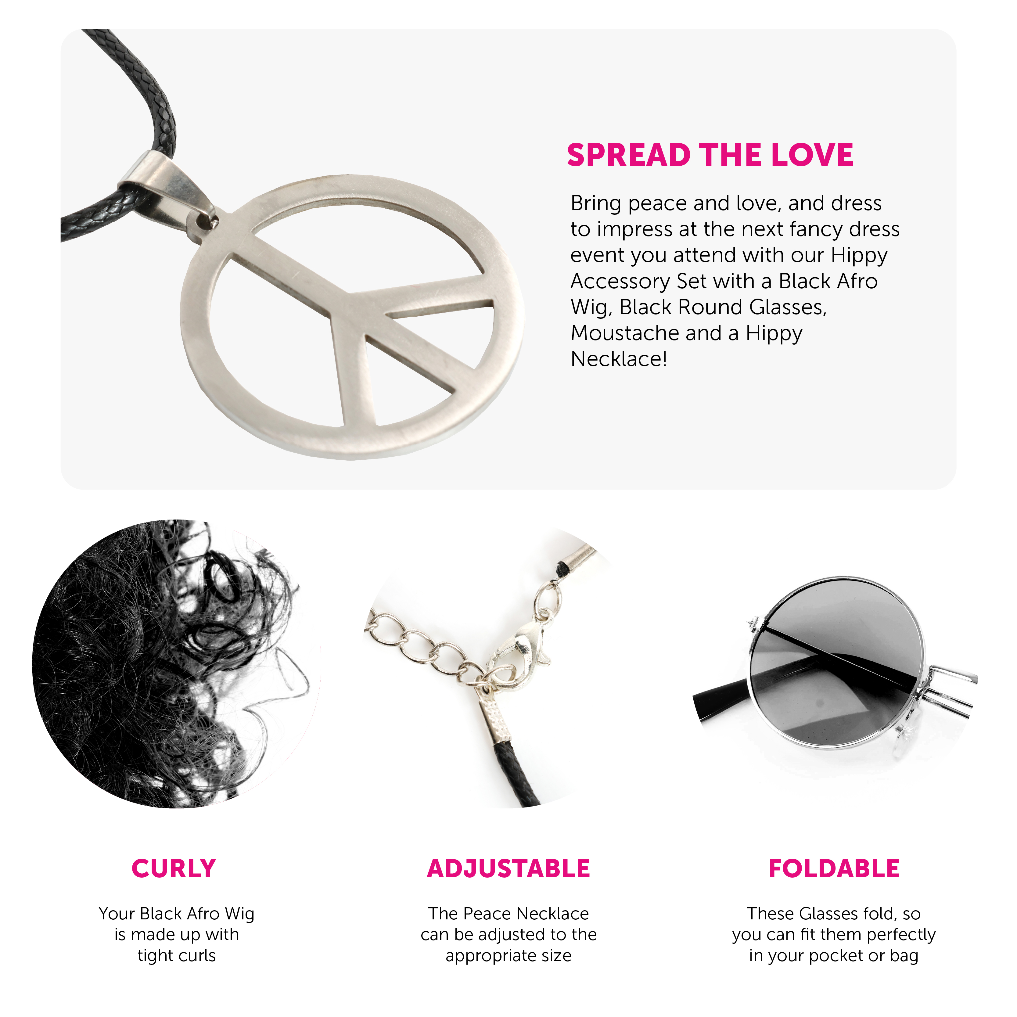 ACCESSORY SET INCLUDES: This Hippy Accessory Set includes a Black Afro Wig with tight curls, an Adhesive Moustache, a pair of Round Frame Glasses with Black Lenses and an adjustable Necklace with a Peace Symbol pendant, the perfect accessories to add to your Hippy Outfit!