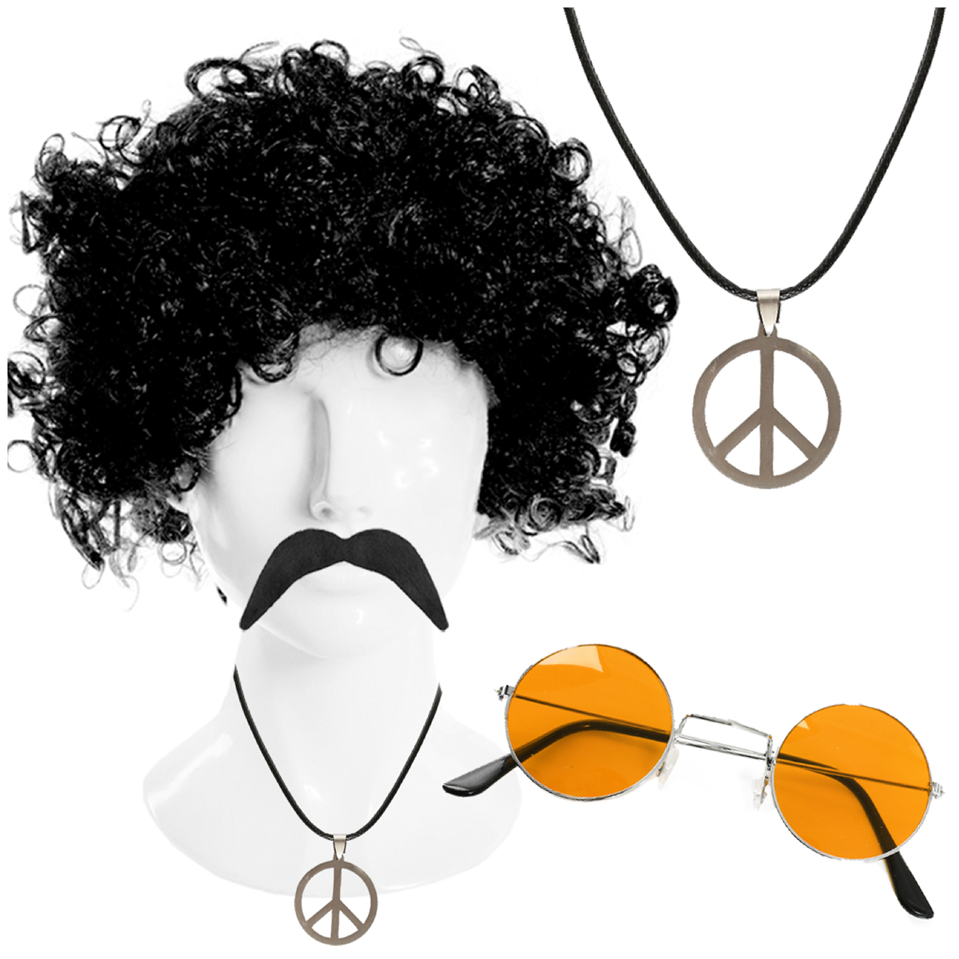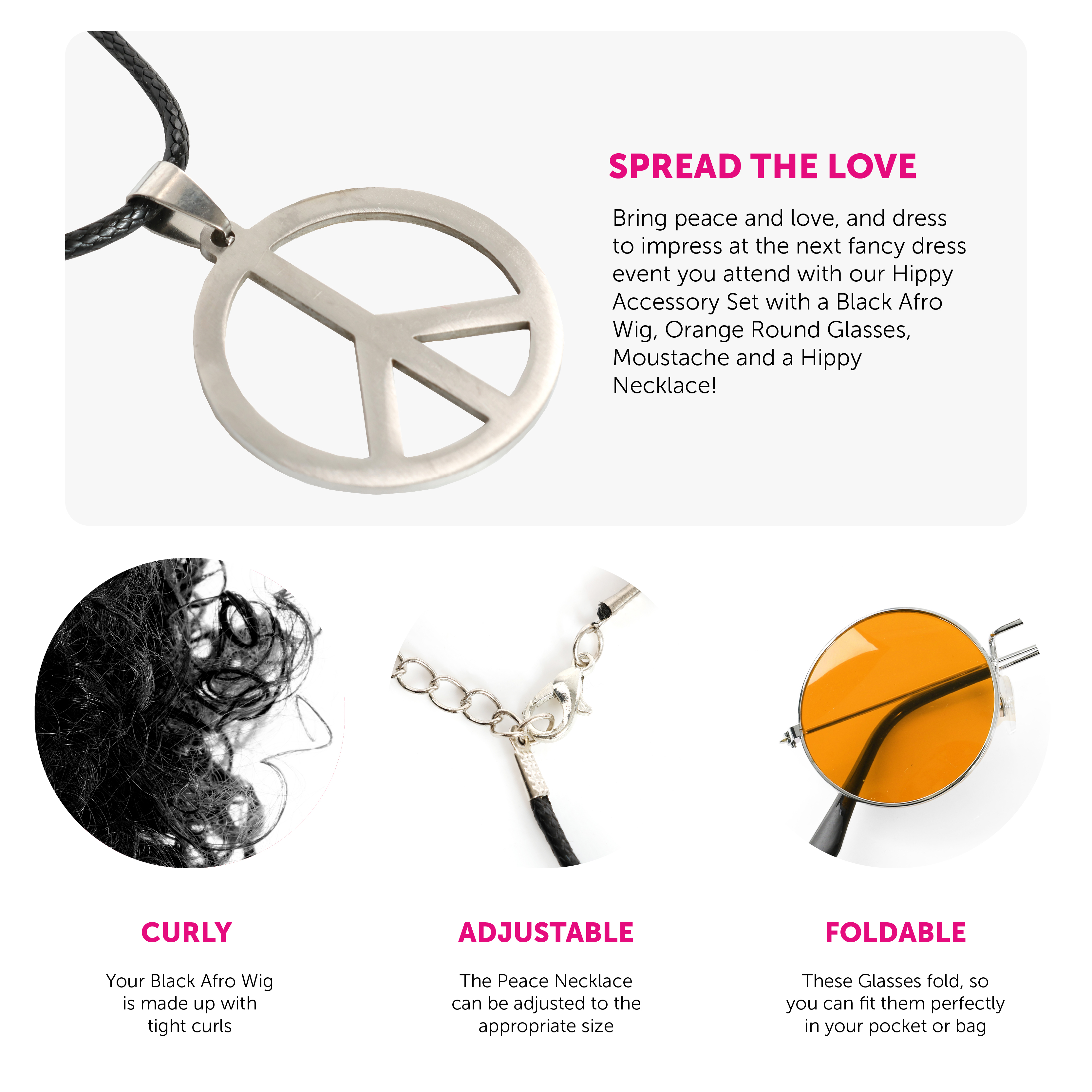 ACCESSORY SET INCLUDES: This Hippy Accessory Set includes a Black Afro Wig with tight curls, an Adhesive Moustache, a pair of Round Frame Glasses with Orange Lenses and an adjustable Necklace with a Peace Symbol pendant, the perfect accessories to add to your Hippy Outfit!