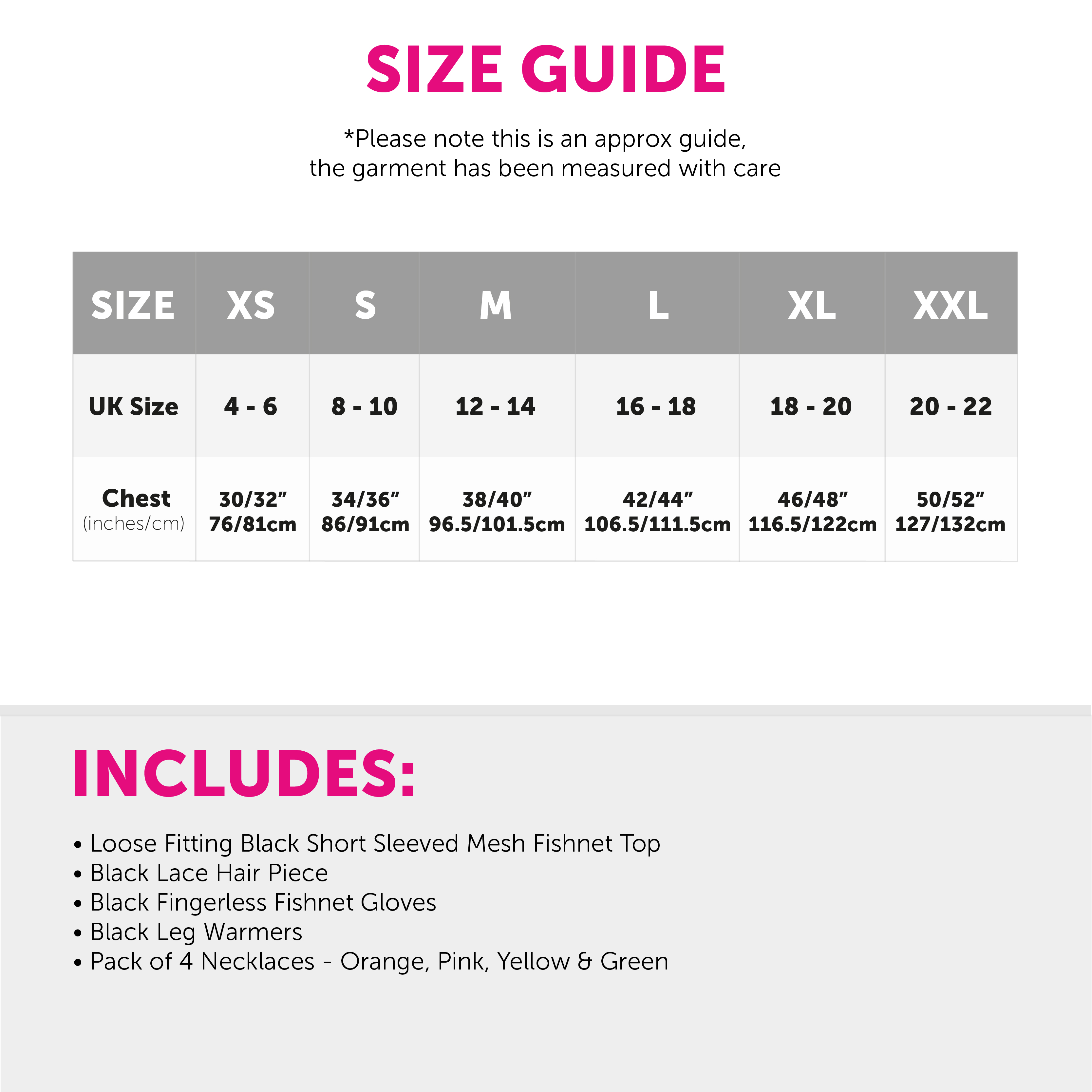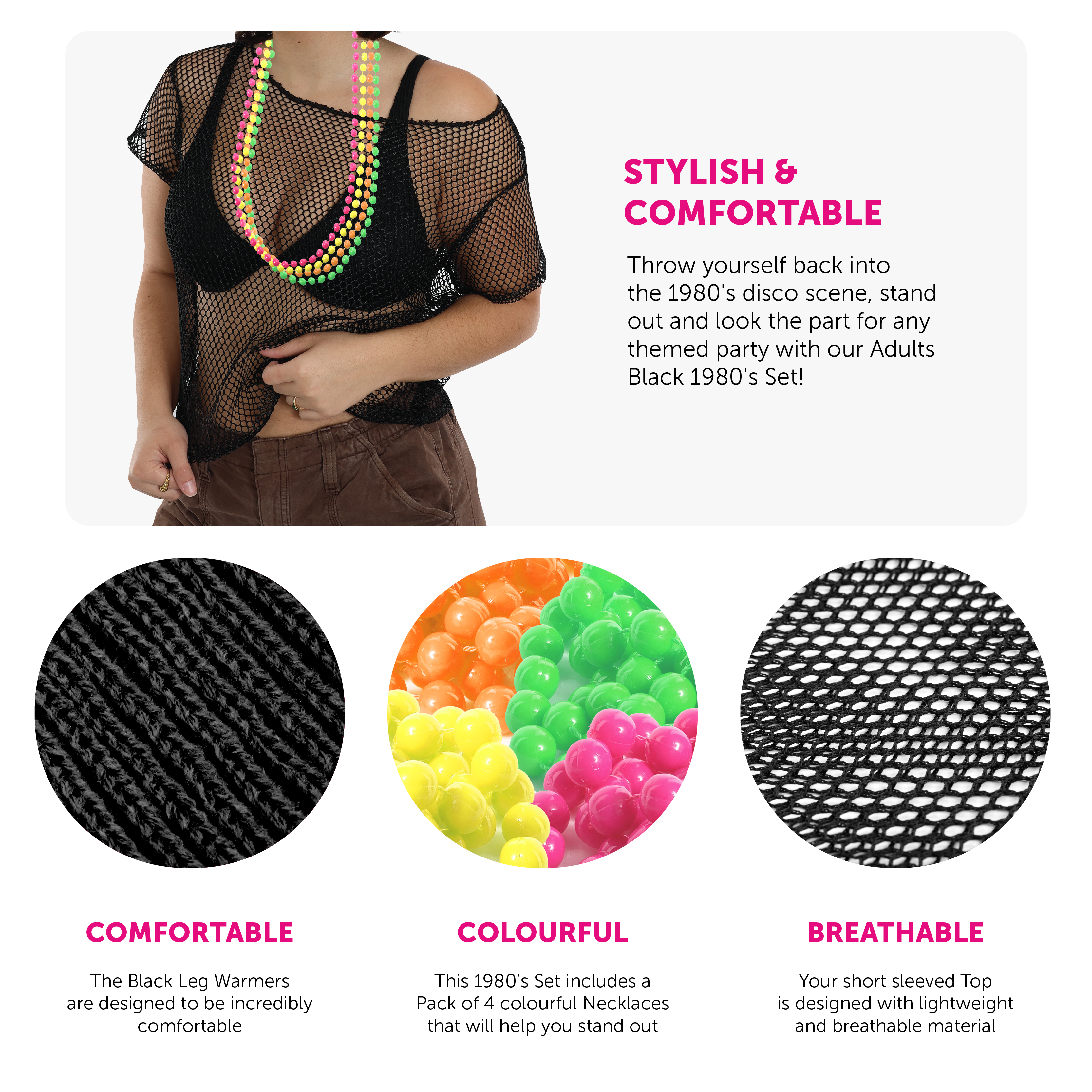 80'S SET INCLUDES: This Black 80's Set includes a loose fitting Black Mesh Top, a Pack of 4 Neon Necklaces - Orange, Pink, Yellow & Green, a Black Lace Hair Piece, Black Fingerless Fishnet Gloves, and Black Leg Warmers!