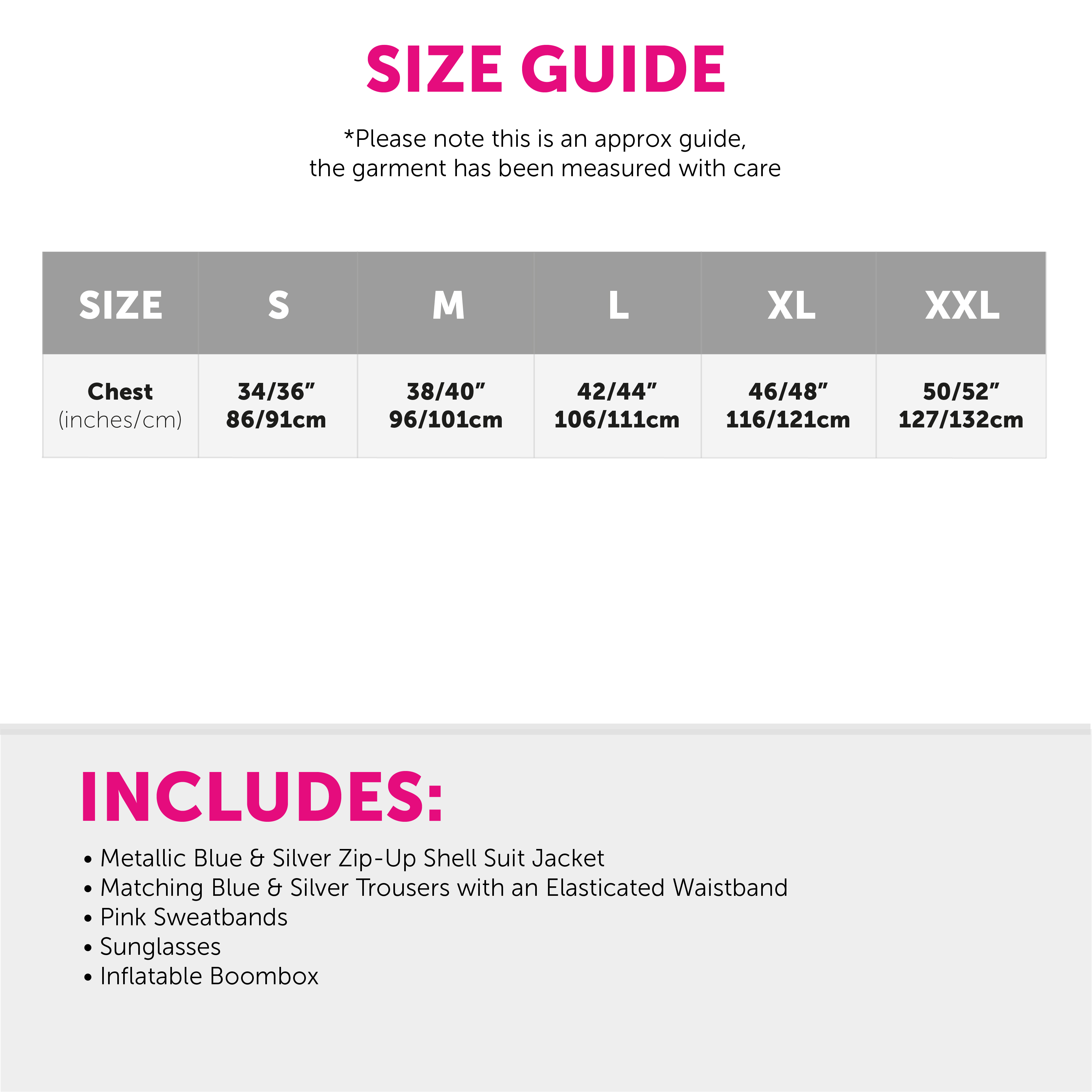 AVAILABLE IN MULTIPLE SIZES: Your Adults Blue and Silver Shell Suit is available in multiple sizes from Small to XX-Large: Small: Chest: 34/36” (86/91cm) | Medium: Chest: 38/40” (96/101cm) | Large: Chest: 42/44” (106/111cm) | X-Large: Chest: 46/48” (116/121cm) | XX-Large: Chest: 50/52” (127/132cm)
