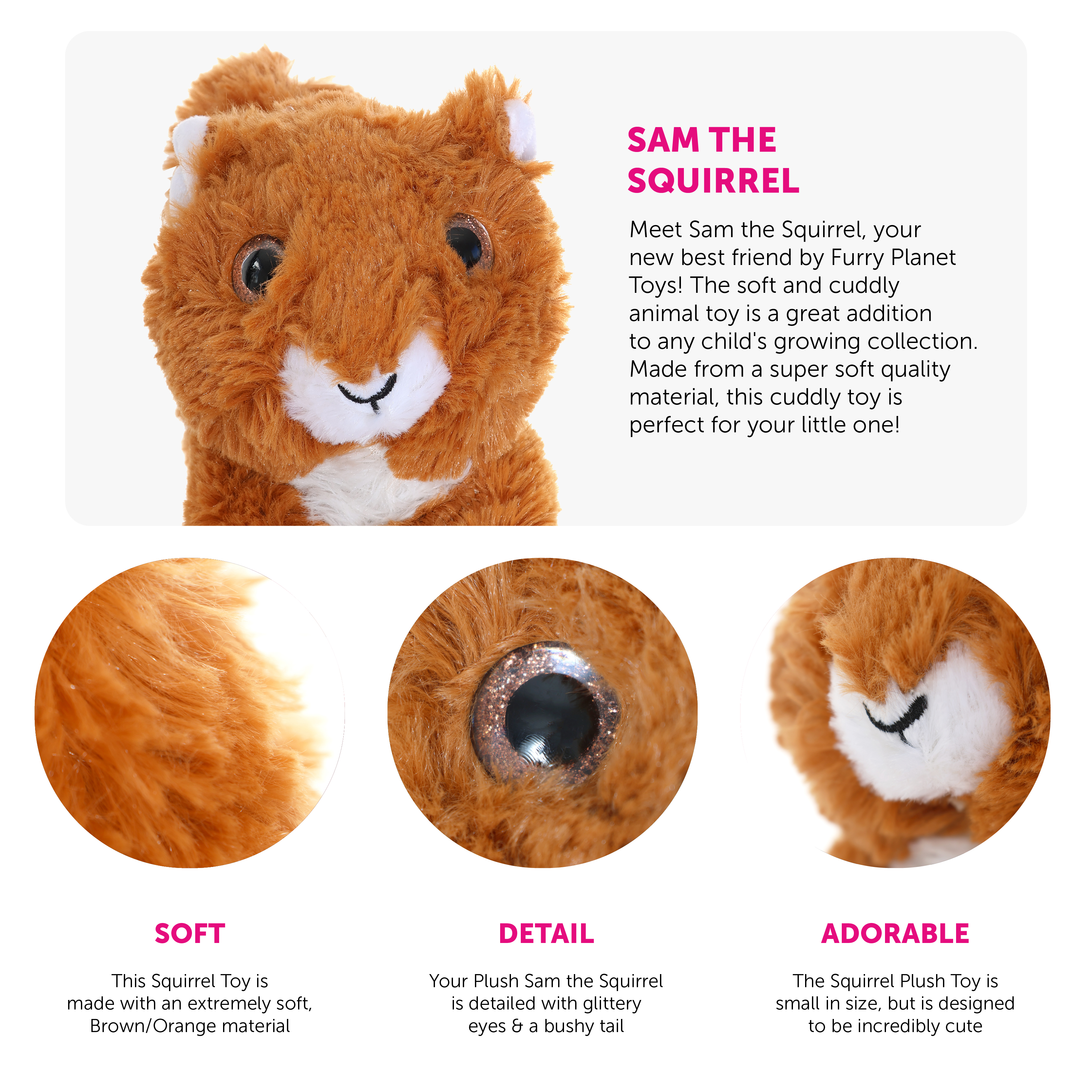 SAM THE SQUIRREL: Meet Sam the Squirrel, your new best friend by Furry Planet Toys! The soft and cuddly animal toy is a great addition to any child's growing collection. Made from a super soft quality material, this cuddly toy is perfect for your little one!