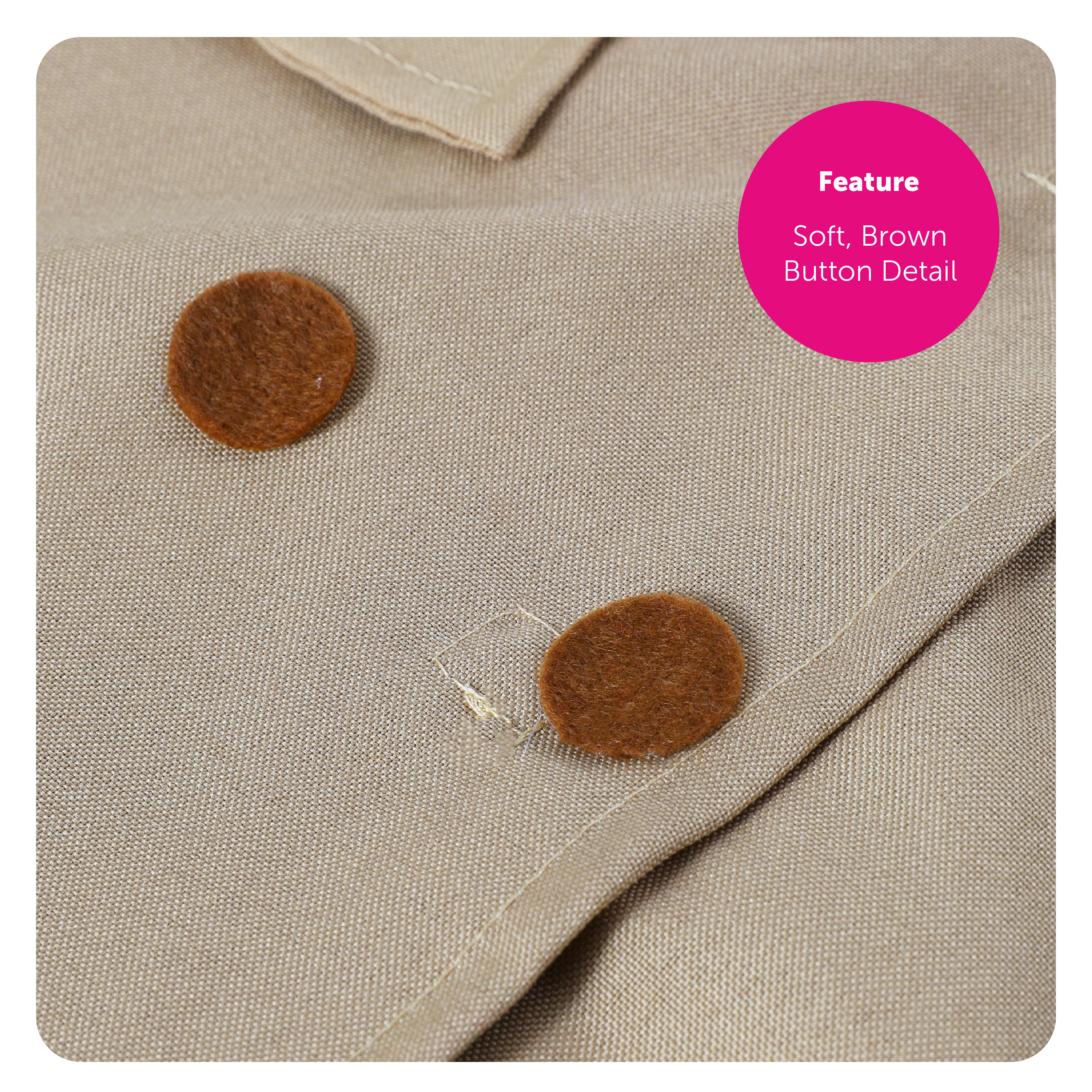 BROWN FOX JACKET DETAILS: Your Child's Fox Jacket is made with a comfortable, light brown material and is detailed with Brown Buttons, Pockets and dark Brown Satin Sleeve Cuffs, to finish off your outfit!