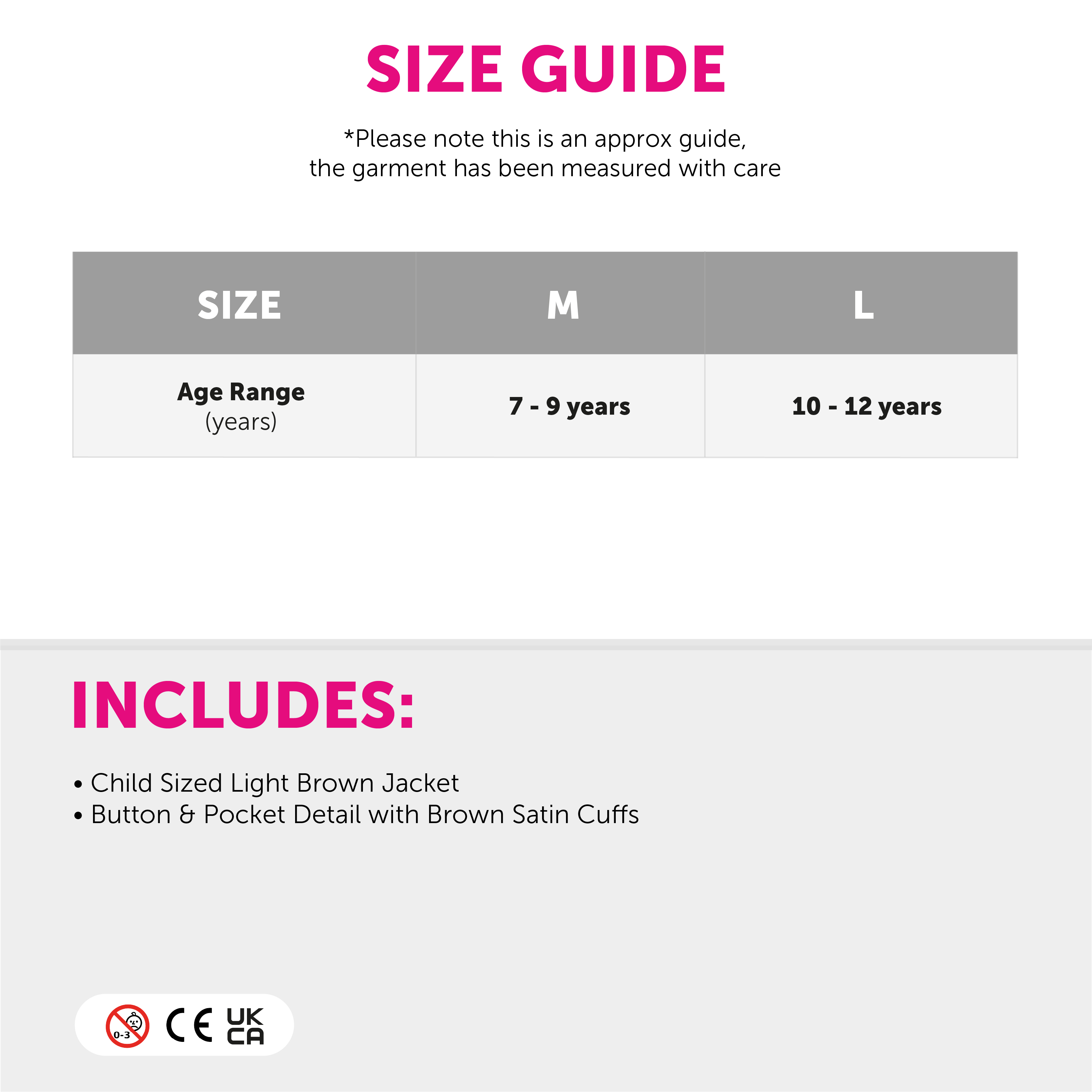 AVAILABLE IN DIFFERENT SIZES: This Child's Light Brown Fox Jacket is available in two sizes, Medium and Large: Medium - 7-9 years | Large - 10-12 years