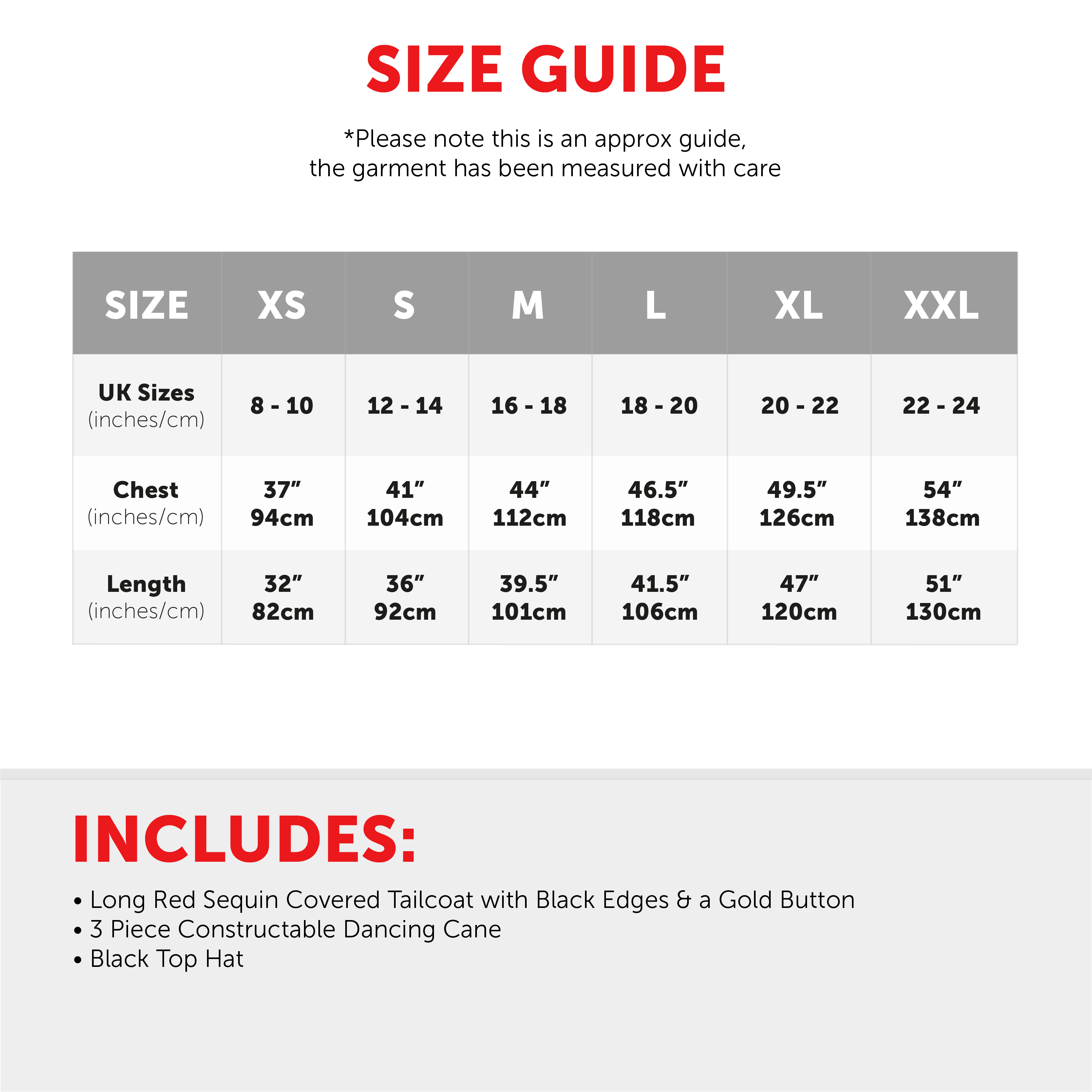 AVAILABLE IN MULTIPLE SIZES: Your Adults Ringmaster Costume is available in multiple sizes, from X-Small to XX-Large:  X-Small (UK size 8 - 10) Chest 37" (94cm), Length 32" (82cm) | Small (UK size 12 - 14) Chest 41" (104cm), Length 36" (92cm) | Medium (UK size 16 - 18) Chest 44" (112cm), Length 39.5" (101cm) | Large (UK size 18 - 20) Chest 46.5" (118cm), Length 41.5" (106cm) | X-Large (UK size 20 - 22) Chest 49.5" (126cm), Length 47" (120cm) | XX-Large (UK size 22 - 24) Chest 54" (138cm), Length 51" (130cm)