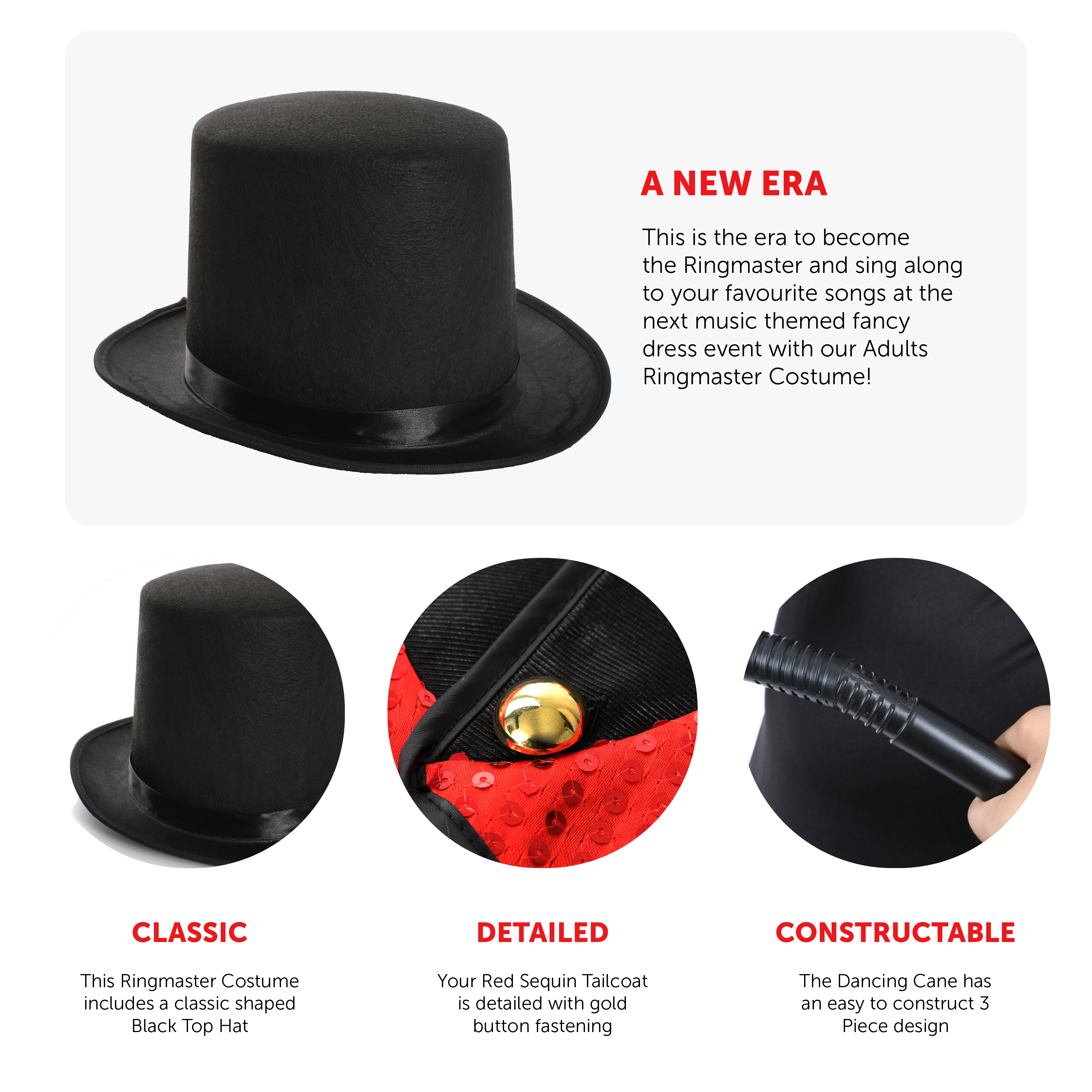 COSTUME INCLUDES: This Adults Ringmaster Costume includes a Black Top Hat, a vibrant Red sequin covered Coat with black edging, detailed with a Gold Button, and a 3 Piece constructable Dancing Cane, the perfect outfit for any fancy dress event!