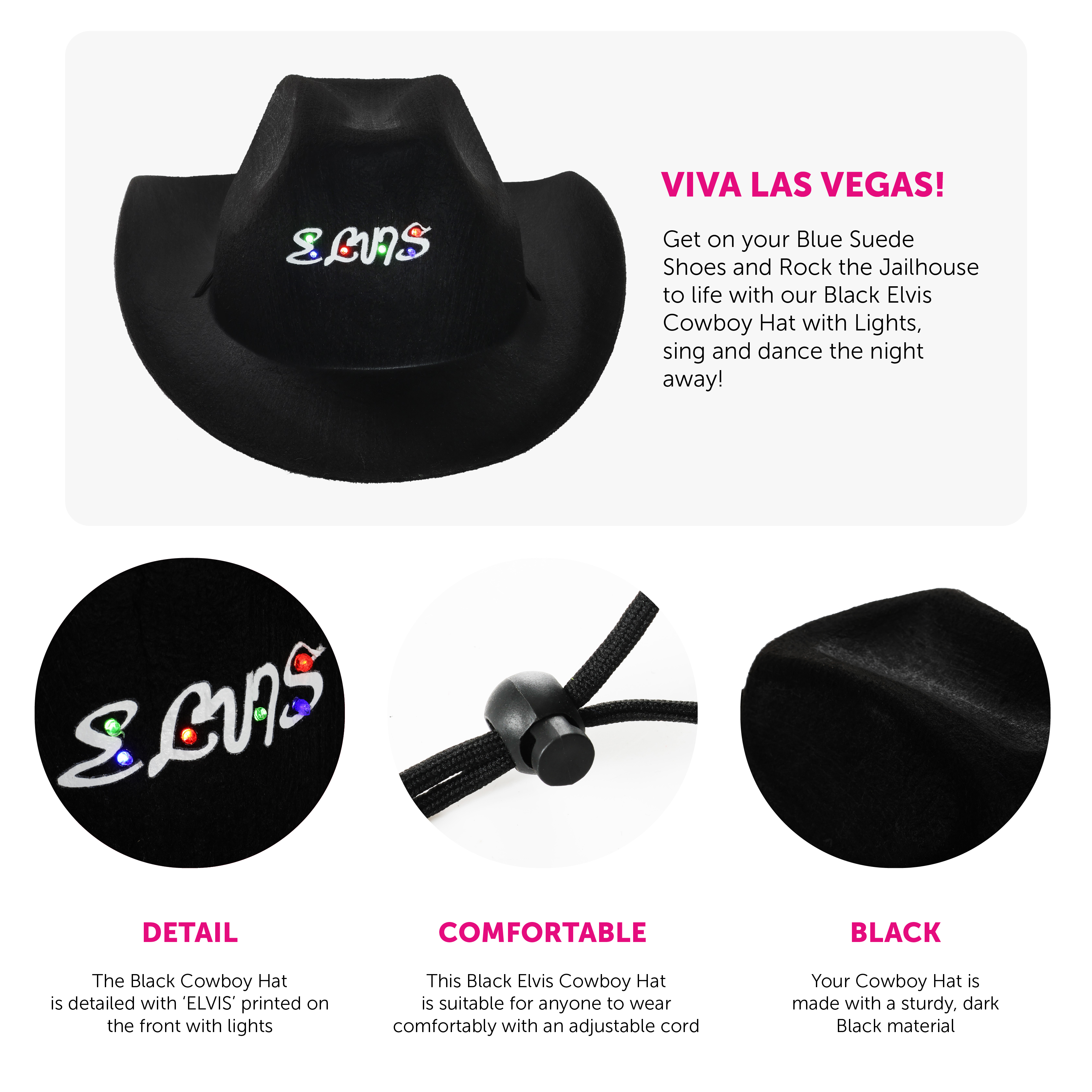 HAT DETAILS: This Cowboy Hat is Black with 'ELVIS' printed on the front, detailed with coloured lights and with an adjustable strap for extra comfort, the perfect way to finish off your outfit!