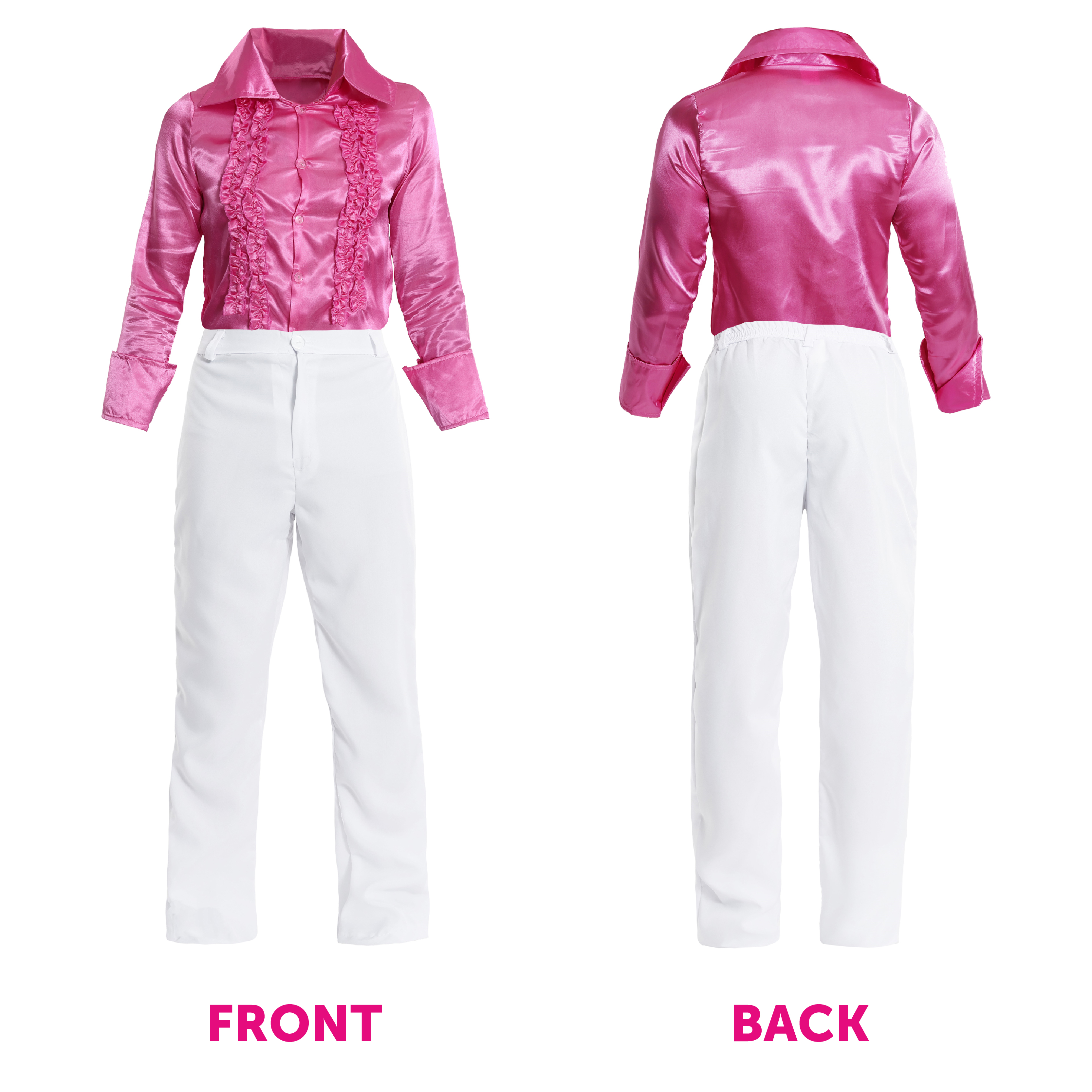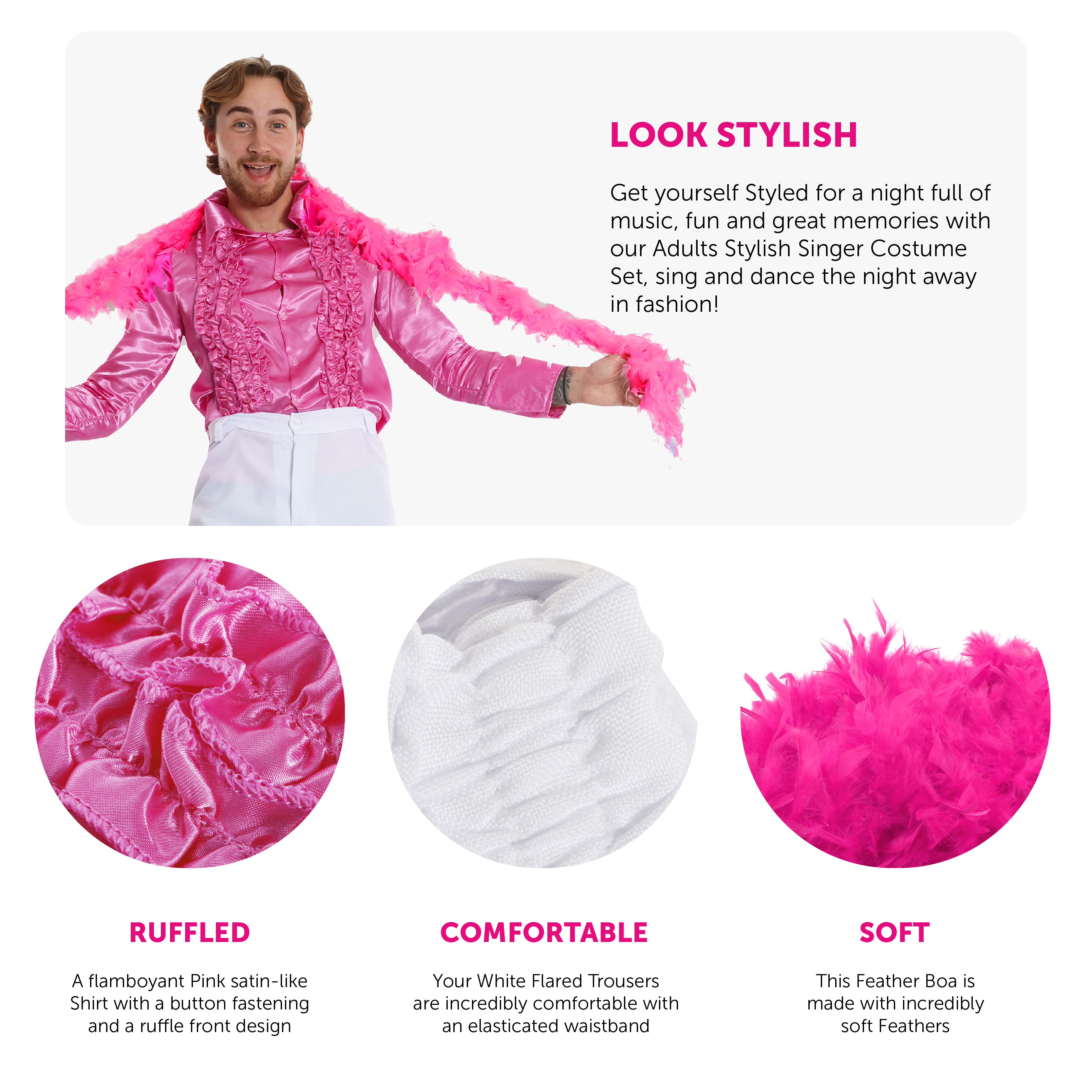 COSTUME SET INCLUDES: This Adults Stylish Singer Costume Set includes a silk-like Pink Shirt with a big Collar and a Ruffled front, White Flared Trousers with button up fastening and a Hot Pink Feather Boa, the perfect Costume for any event!