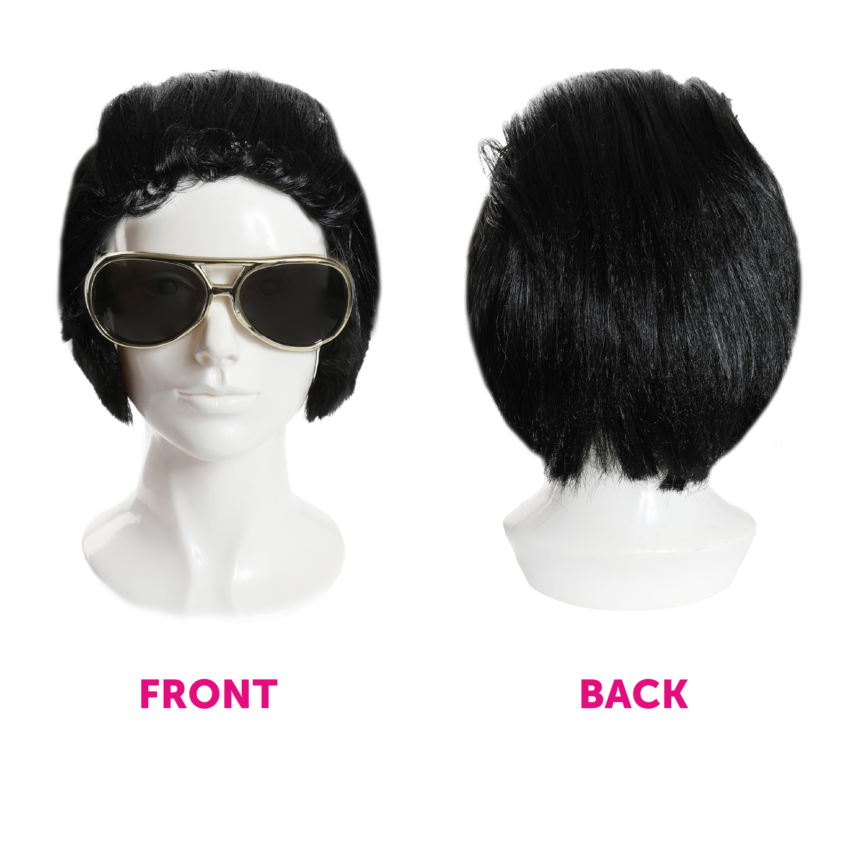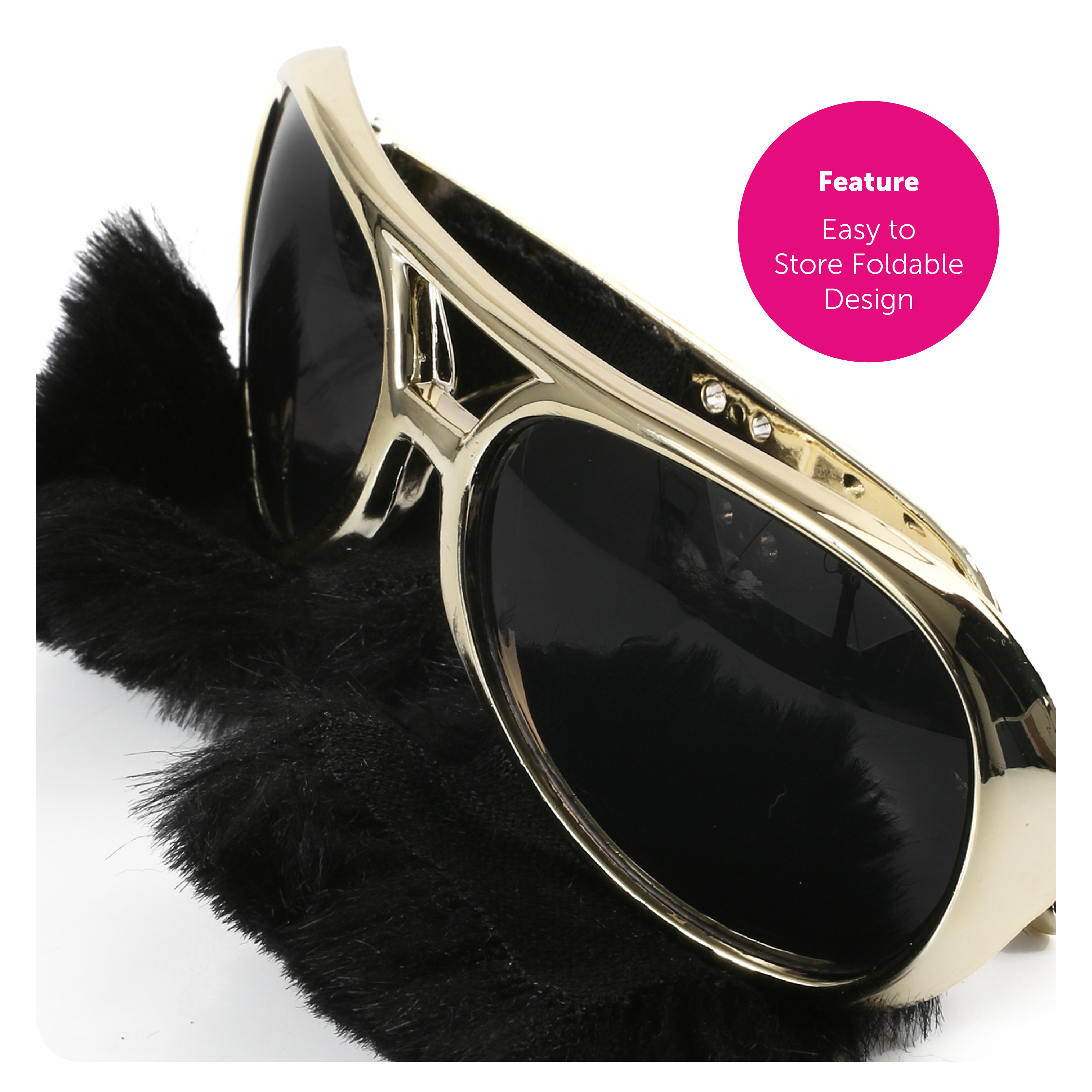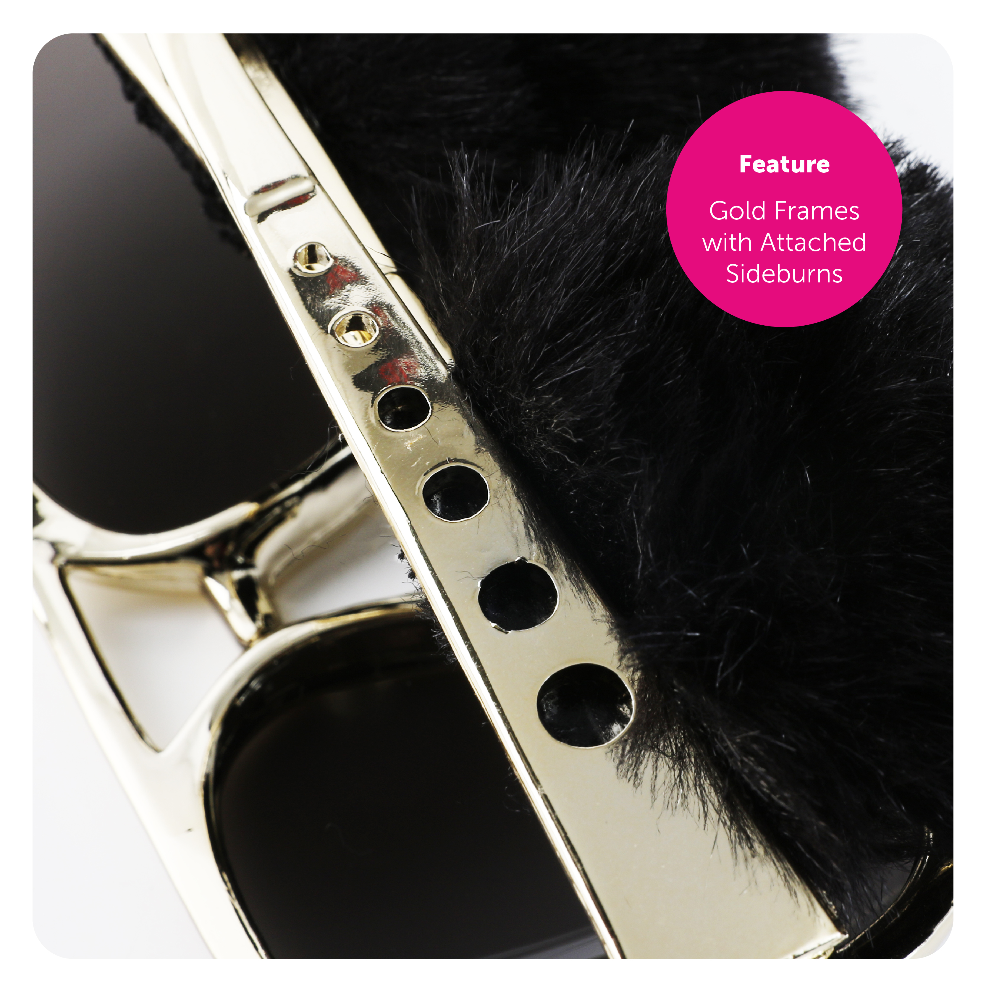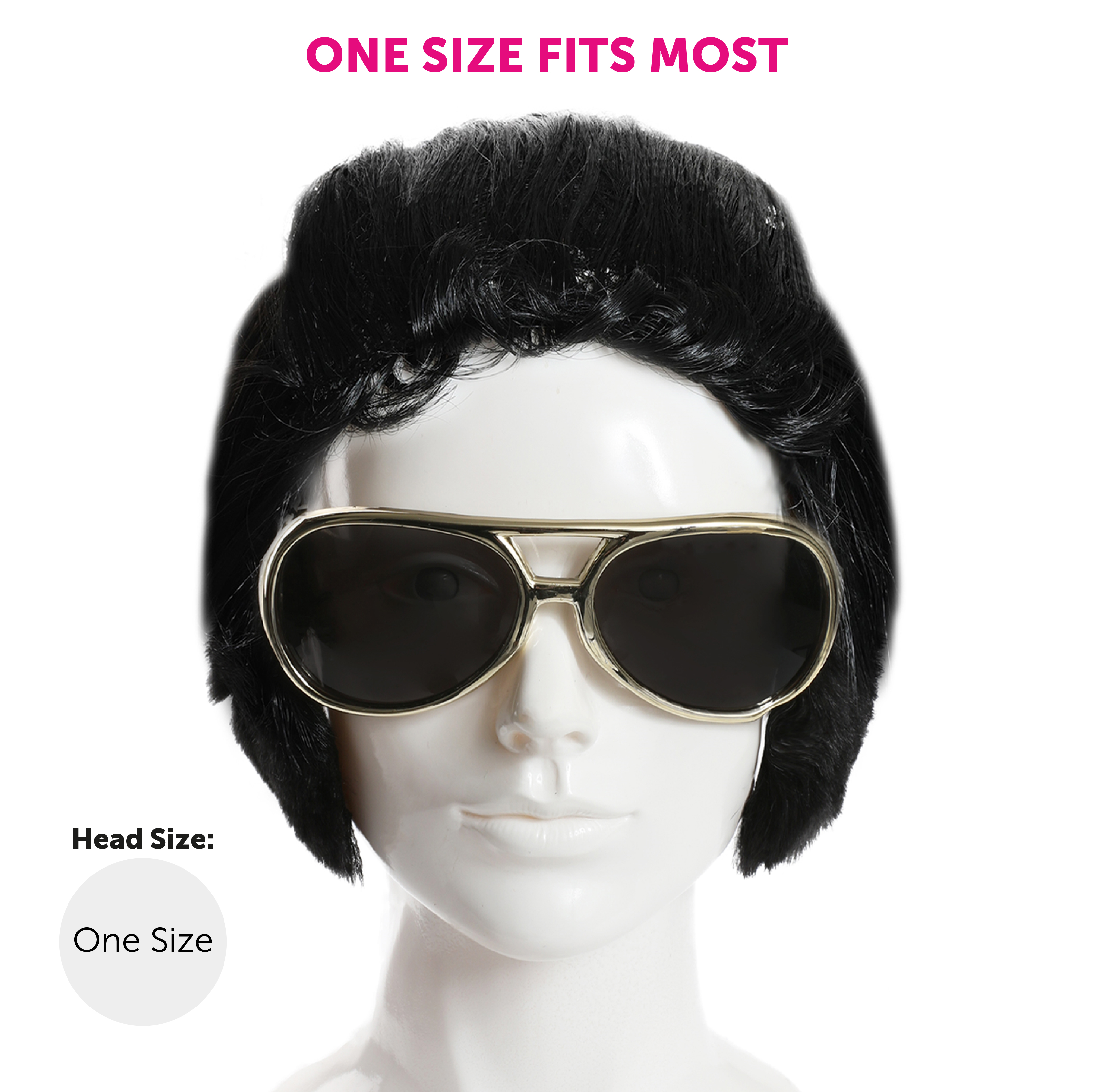 SET INCLUDES: Your King of Rock and Roll Set includes a pair of Sunglasses with black lenses, a comfortable, thick gold frame and large black sideburns attached, and a Black Wig with an iconic quiff style, allowing you to rock and roll to any fancy dress event!