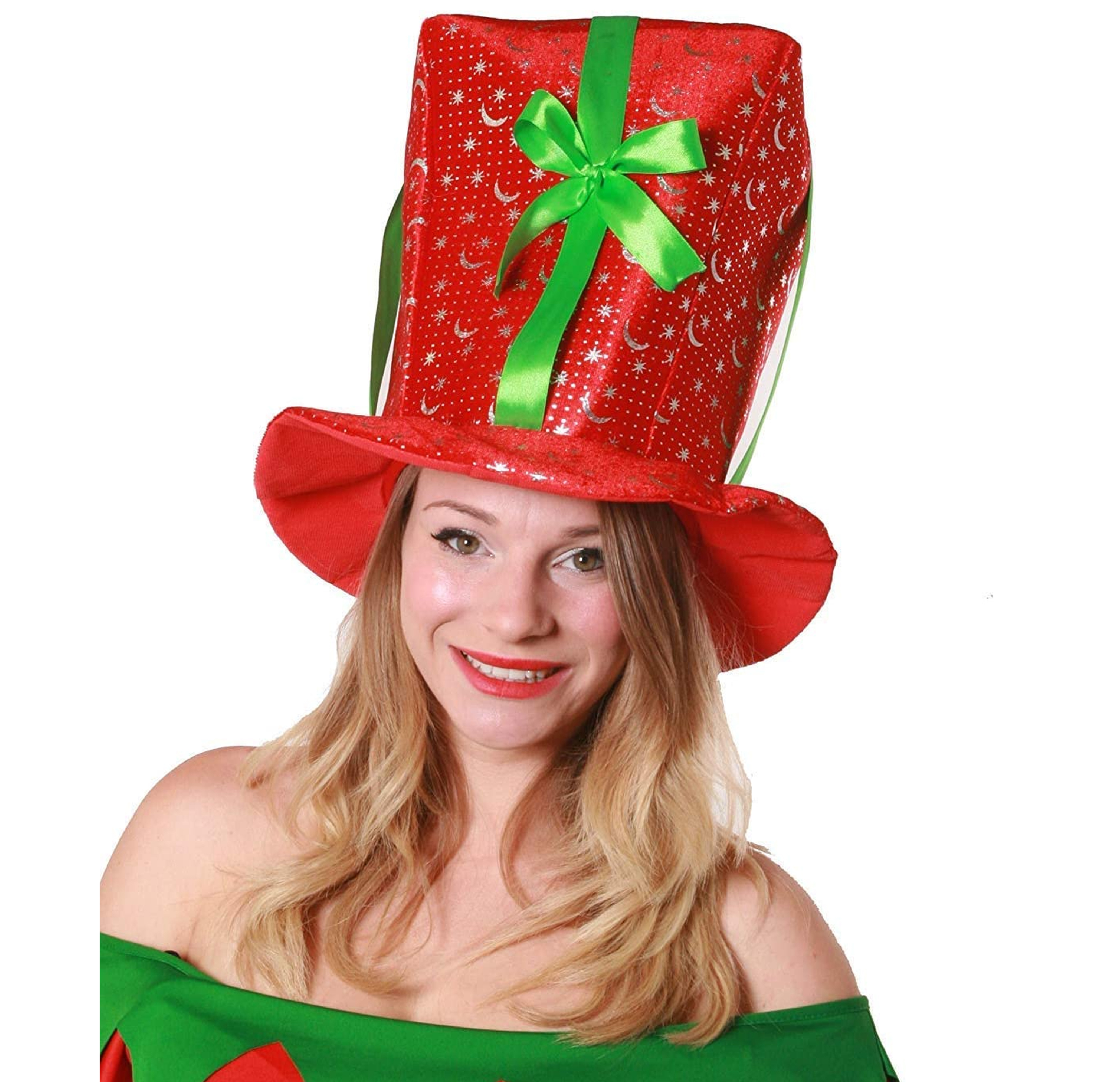 HAT DETAILS: Your Novelty Jumbo Christmas Present Hat is a comfortable and novelty Christmas hat, featuring a Classic Christmas Present box design, with a large green bow tied on the front, with snow, stars, and crescent moon detailing on the hat!