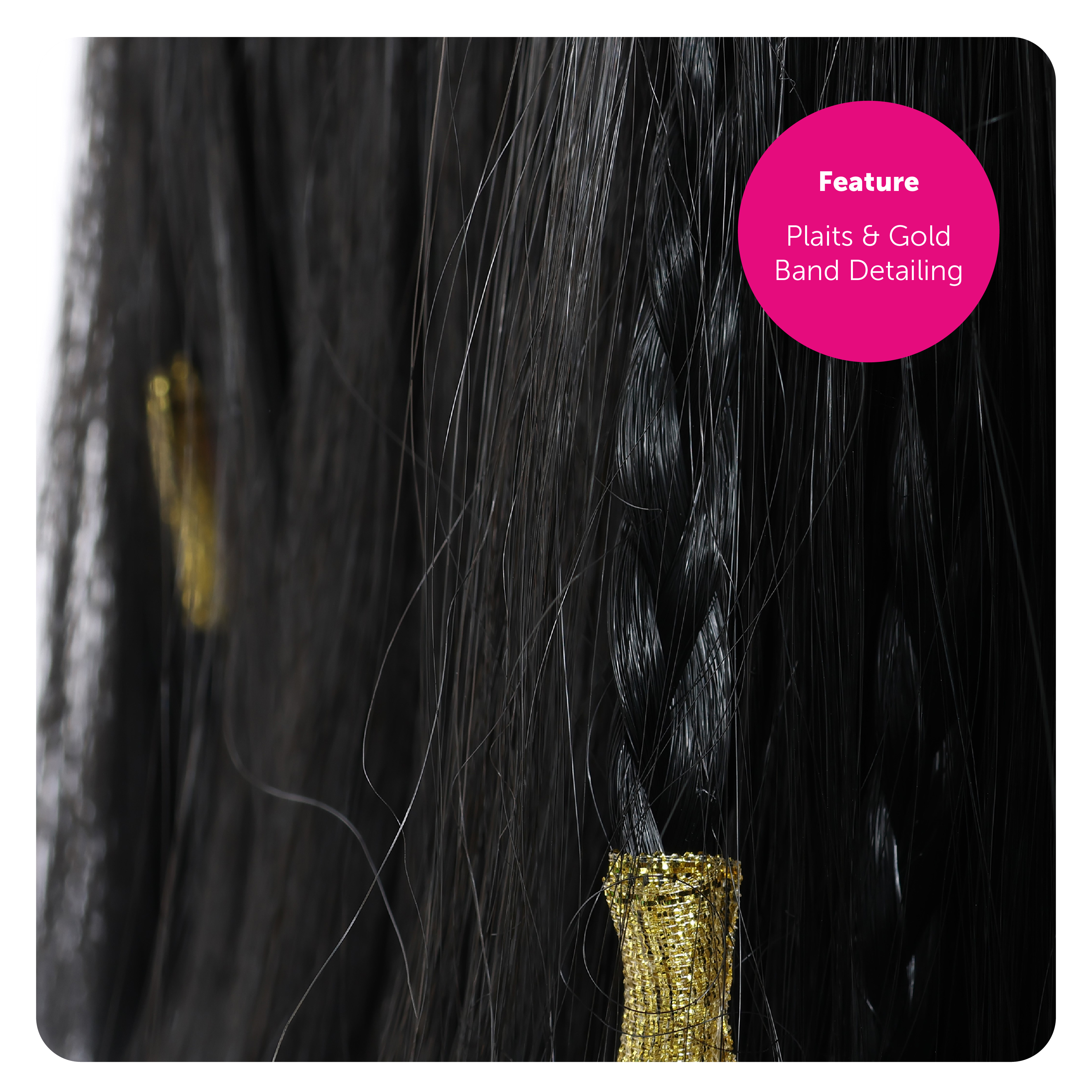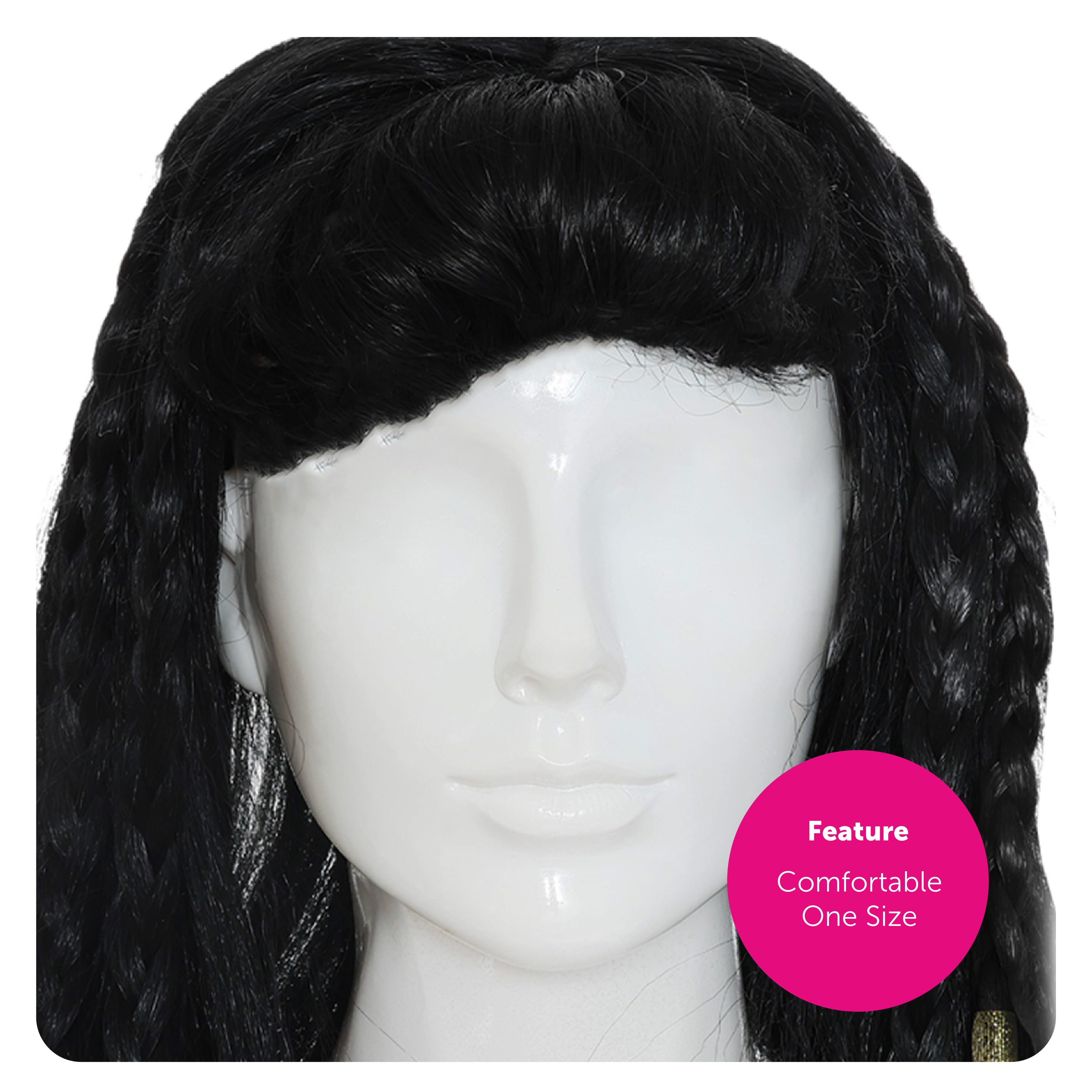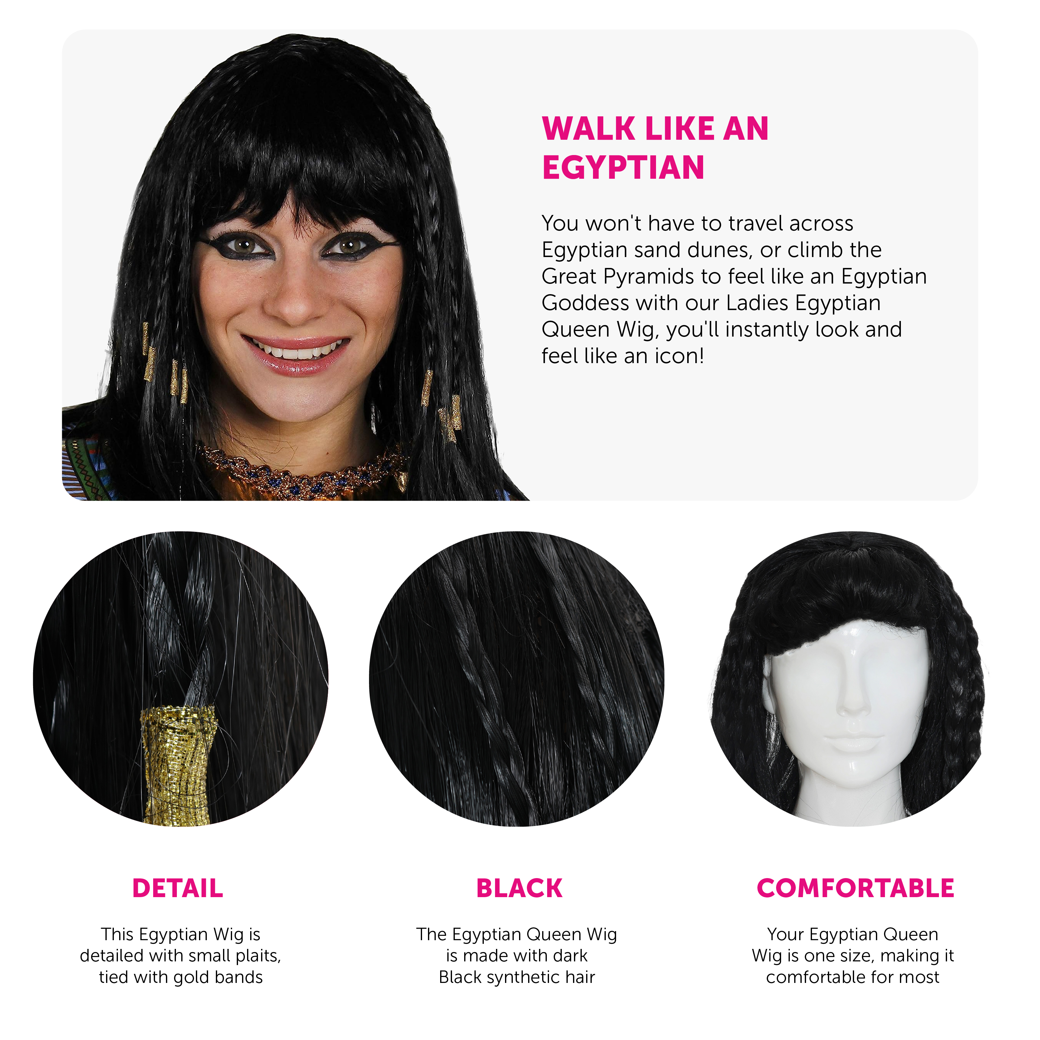 EGYPTIAN QUEEN WIG DETAILS: Your Ladies Egyptian Queen Wig is a shoulder-length Black Wig detailed with a Full Fringe and small plaits tied with eye-catching Golden bands, you'll feel like royalty!