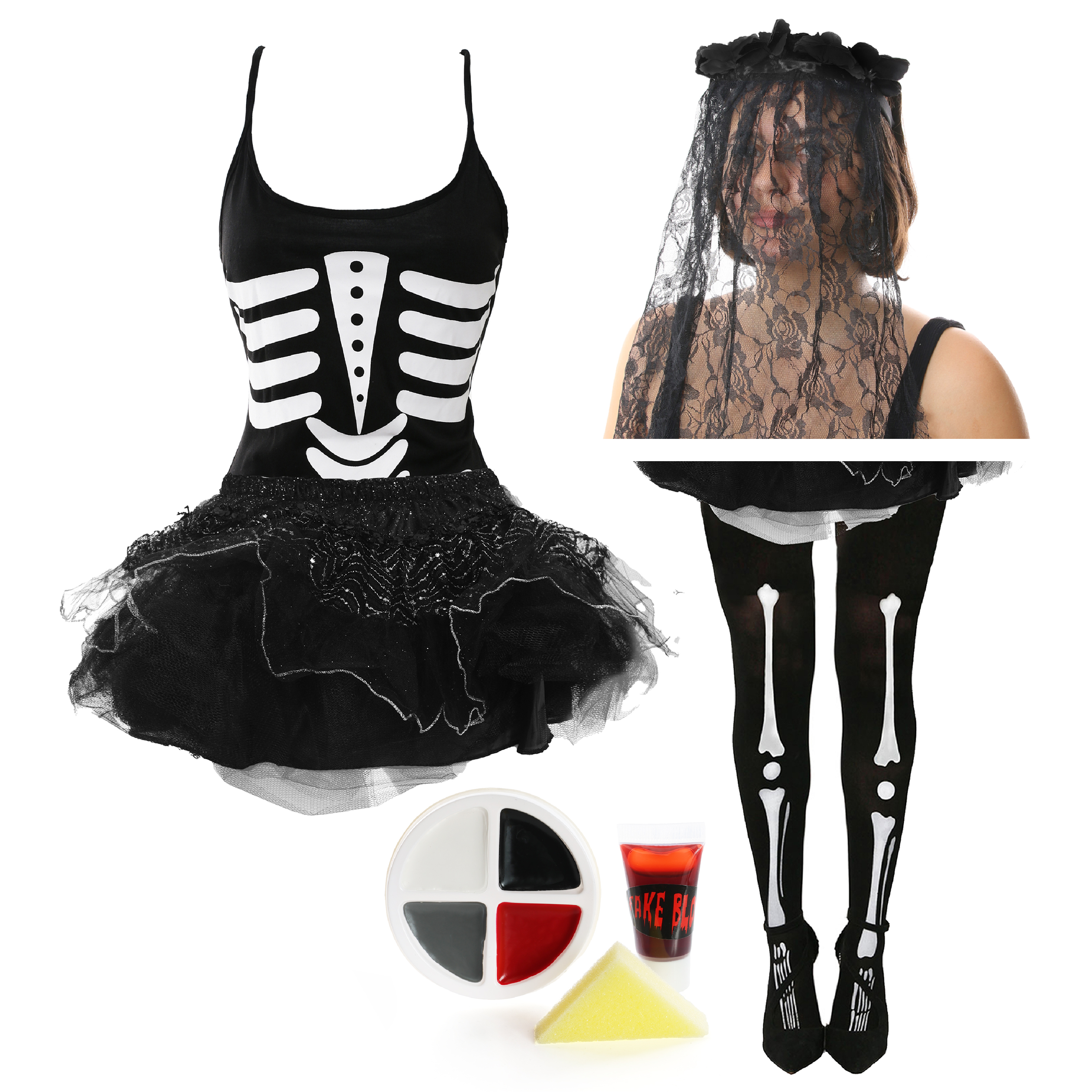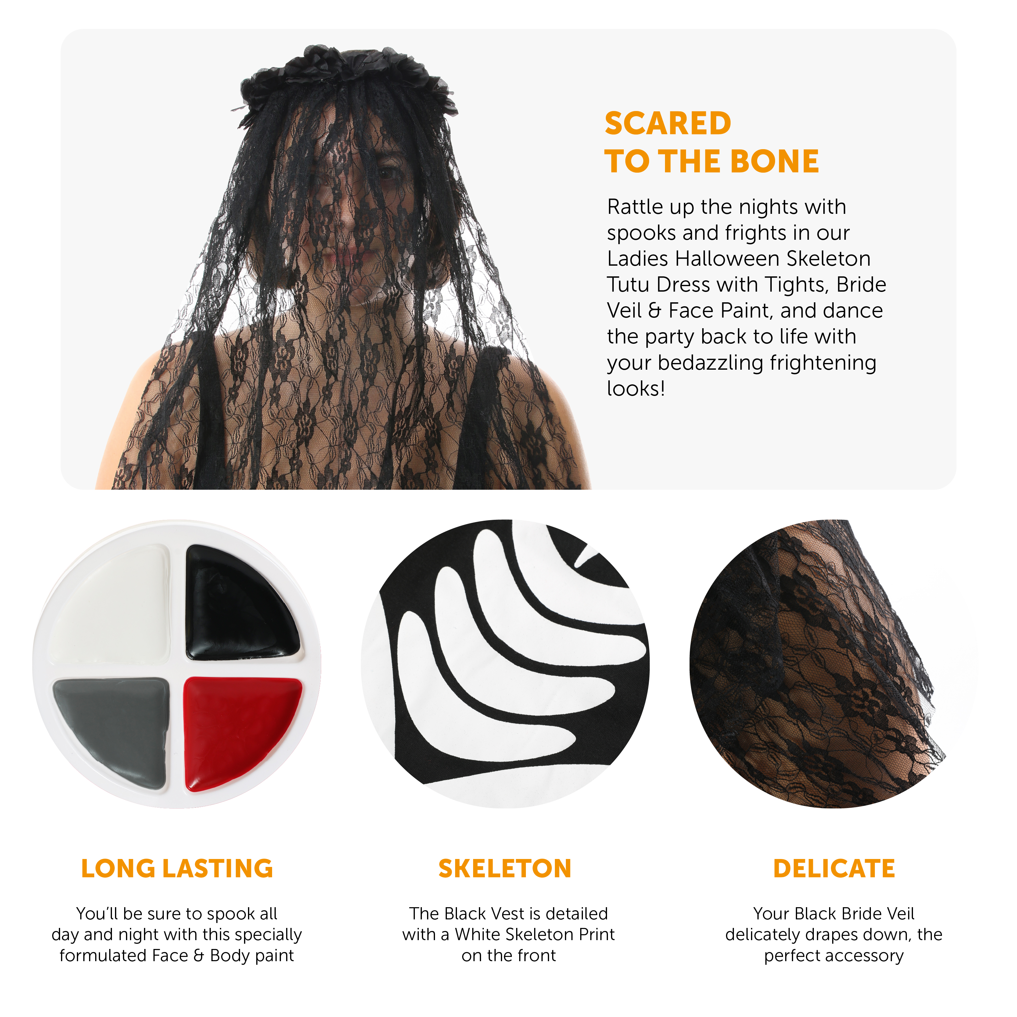 PERFECT FOR HALLOWEEN & OTHER FANCY DRESS: Whether you want to spook the crowd for Halloween, in need of a look for Day of the Dead events, or any other fancy dress, be sure to pick up our Ladies Halloween Skeleton Tutu Dress with Tights, Bride Veil and Face Paint!