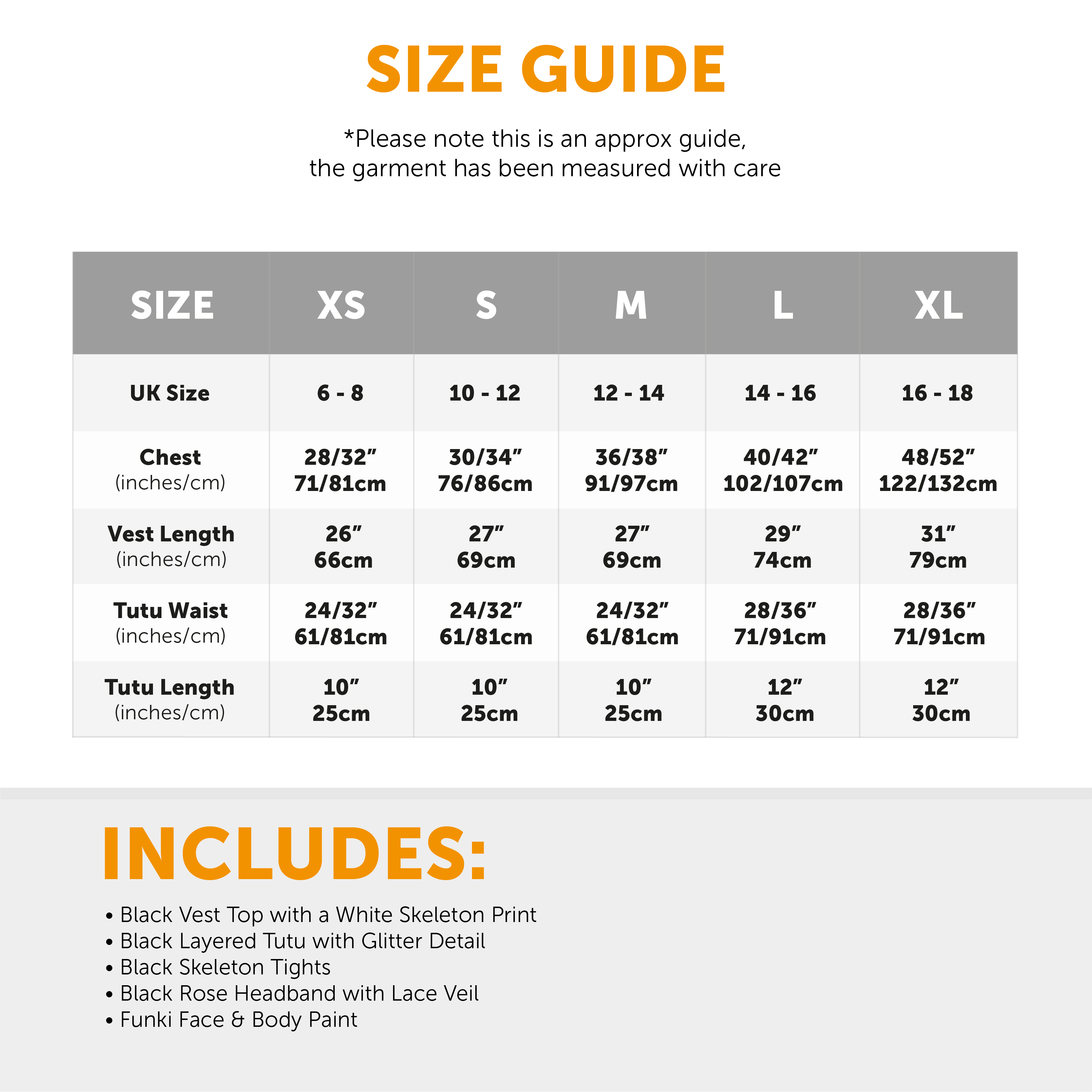 AVAILABLE IN MULTIPLE SIZES: The Ladies Skeleton Tutu Dress Costume is available in sizes ranging from X-Small to X-Large: X-Small - UK 6 - 8 - Chest 28/32" (71/81cm), Vest Length: 26" (66cm), Tutu Waist: 24/32" (61/81cm), Tutu Length: 10" (25cm) | Small - UK 10 - 12 - Chest: 30/34" (76/86cm), Vest Length: 27" (69cm), Tutu Waist: 24/32" (61/81cm), Tutu Length: 10" (25cm) | Medium - UK 12 - 14 - Chest: 36/38" (91/97cm), Vest Length: 27" (69cm), Tutu Waist: 24/32" (61/81cm), Tutu Length: 10" (25cm) | Large - UK 14 - 16 - Chest: 40/42" (102/107cm), Vest Length: 29" (74cm), Tutu Waist: 28/36" (71/91cm), Tutu Length: 12" (30cm) | X-Large - UK 16 - 18 - Chest: 48/52" (122/132cm), Vest Length: 31" (79cm), Tutu Waist: 28/36" (71/91cm), Tutu Length: 12" (30cm)