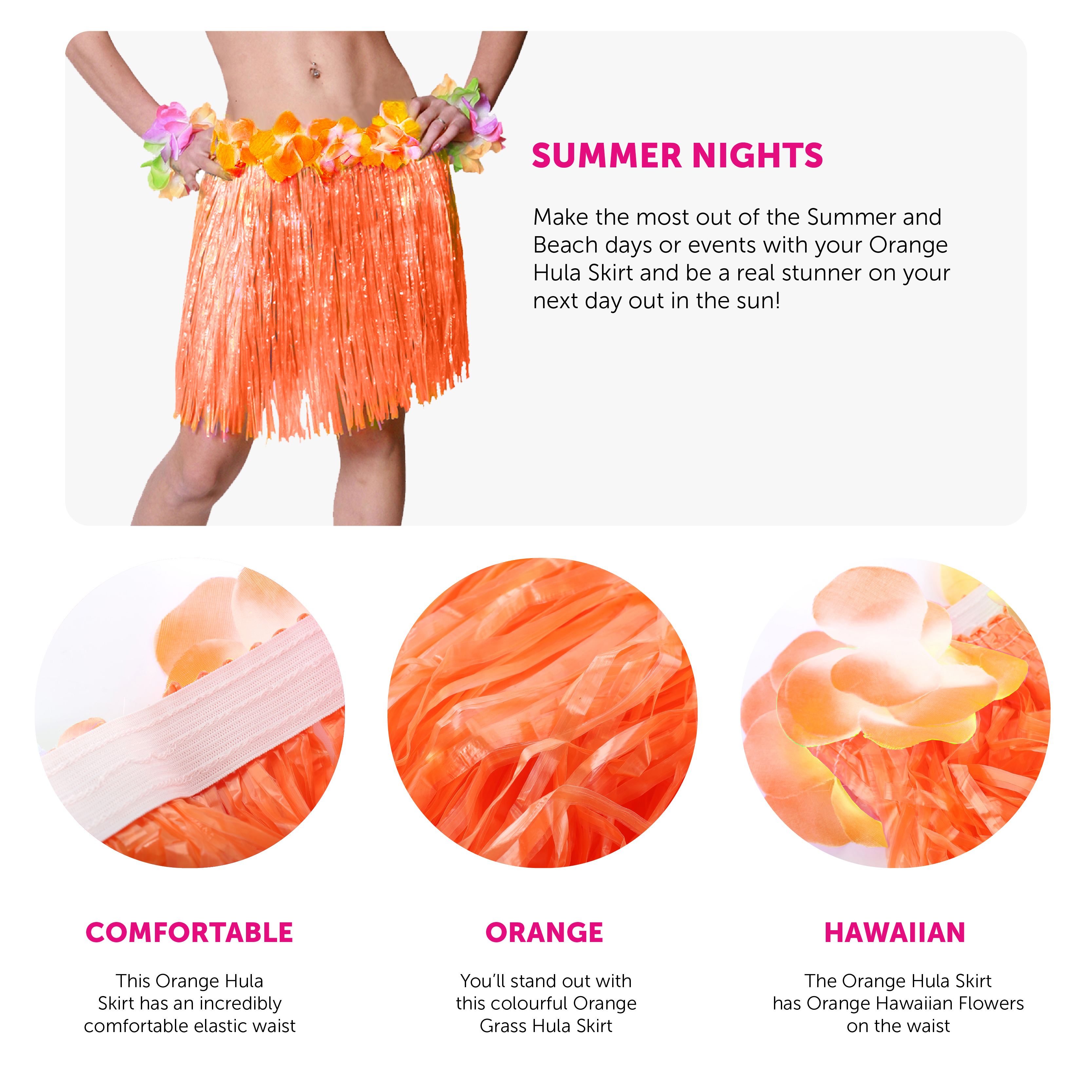 HULA SKIRT DETAILS: Your Hula Skirt is an Orange, grass-like Skirt with an elasticated waistband and matching Orange decorative Hawaiian Lei Flowers, all tropical and ready for the beach!